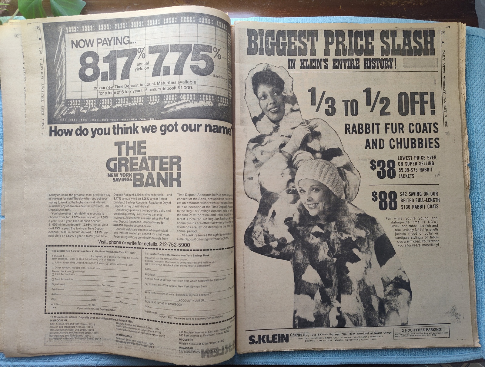 - If you’re in to coats made of dead rabbits, S. Klein has them for 1/3 to 1/2 off!