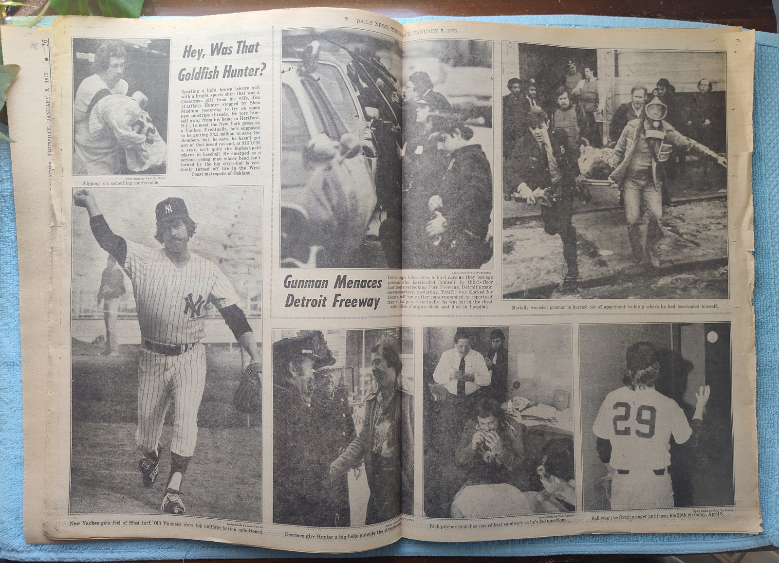 - The centerfold has several pictures of Catfish Hunter wearing pinstripes as well as scenes from Detroit where a ‘Gunman Menaces Detroit Freeway’