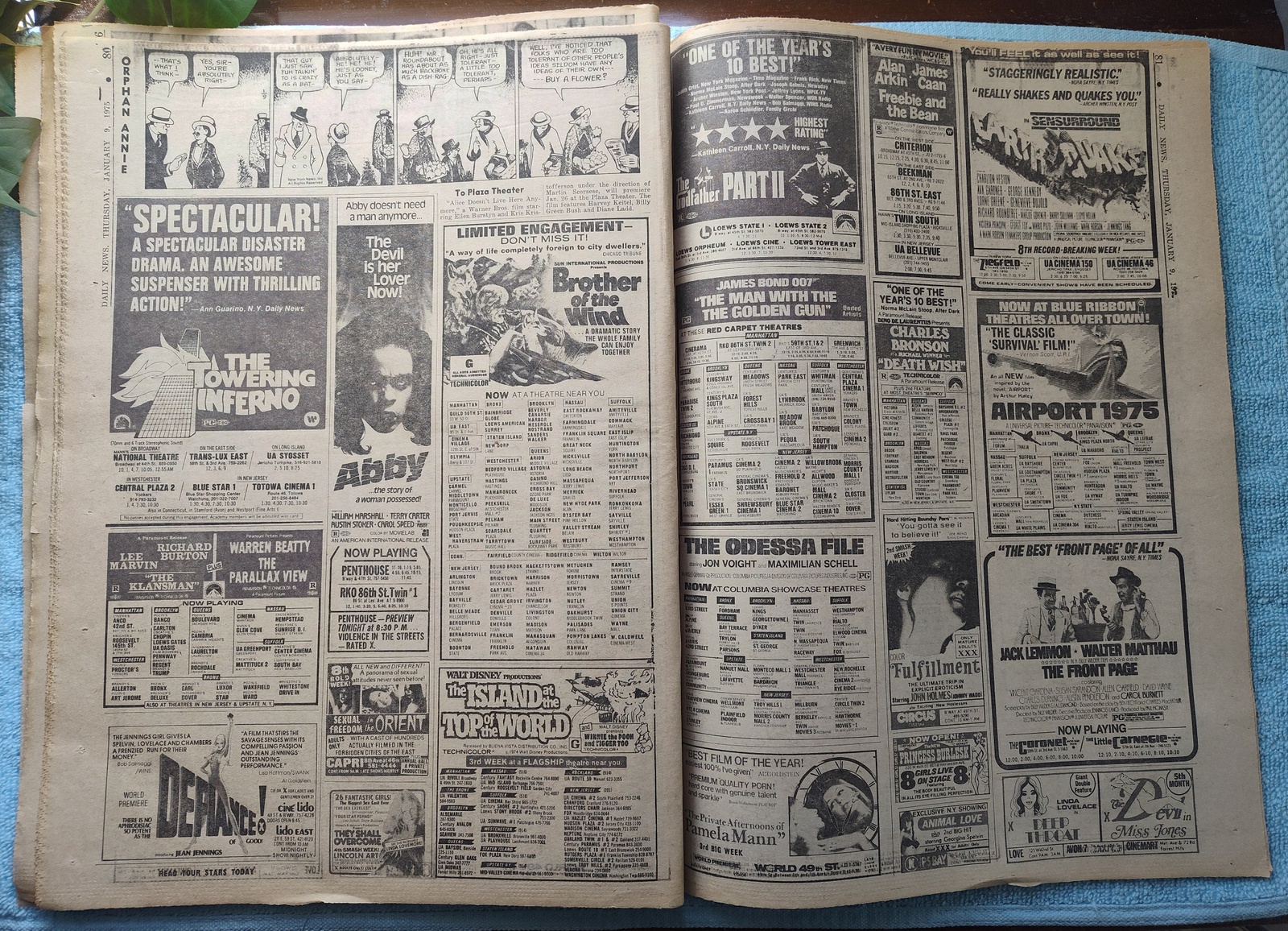 - There are movie ads for The Front Page with Walter Matthau and Jack Lemmon, The Towering Inferno, The Odessa File, Airport 1975, The Godfather Part II, and more!