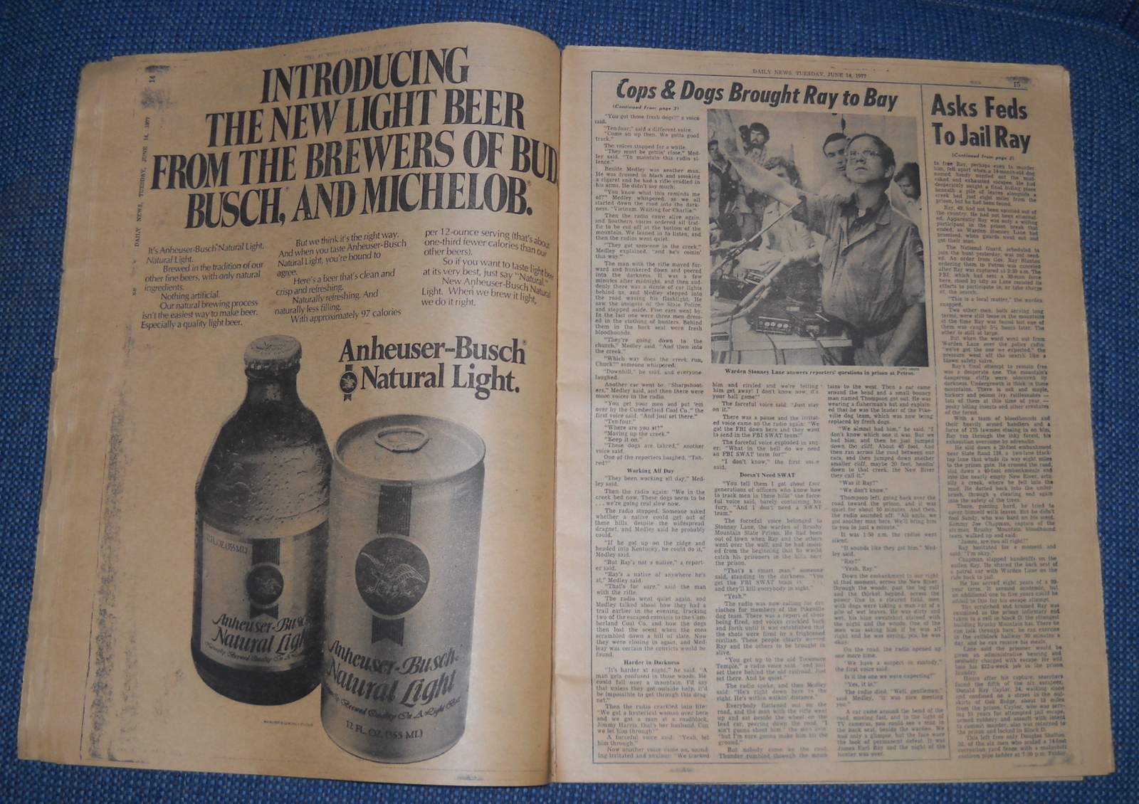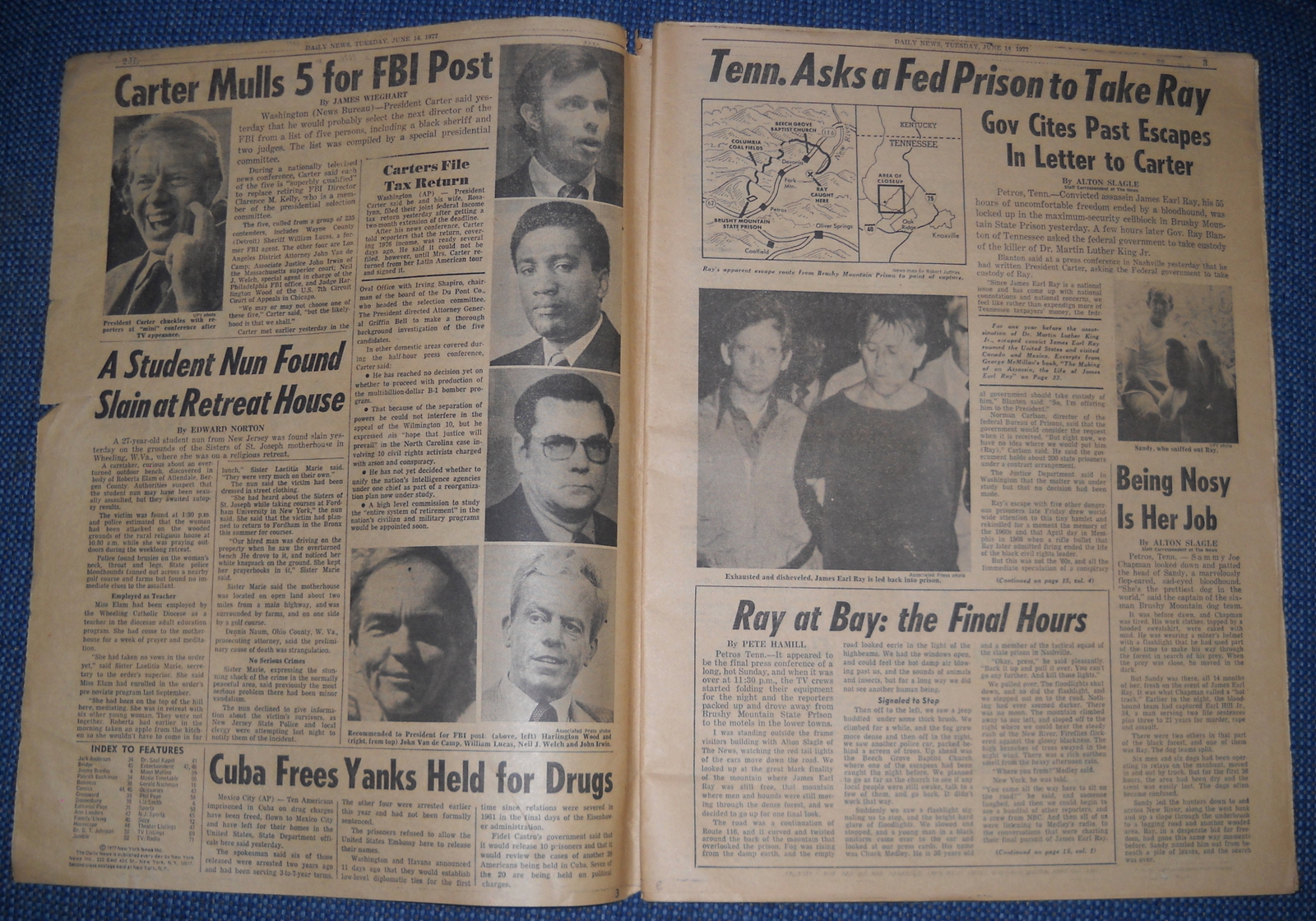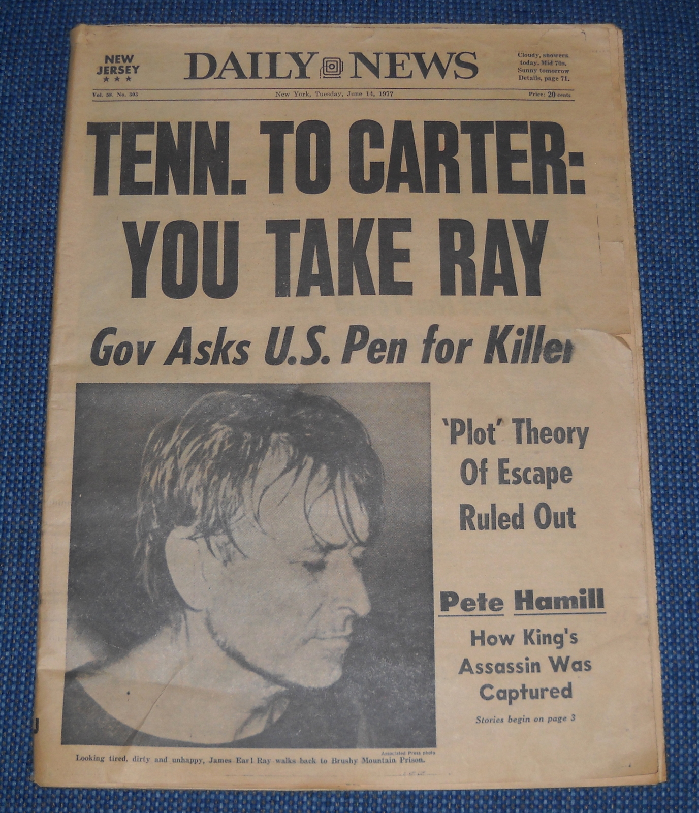 New York Daily News (New Jersey) – Tuesday, June 14, 1977. What you see in the pictures is what you get. This is a very interesting old newspaper which features as the front page story: Tenn. To Carter: You Take Ray Gov. Asks U.S. Pen for Killer.