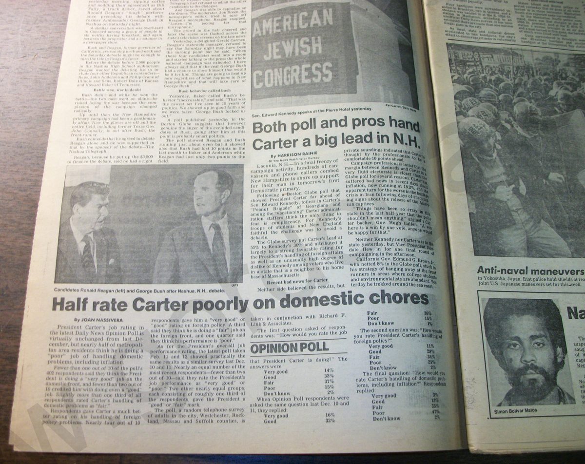- A “tough’ Reagan gains in N.H. (picture of Reagan and Bush, then candidates for president)