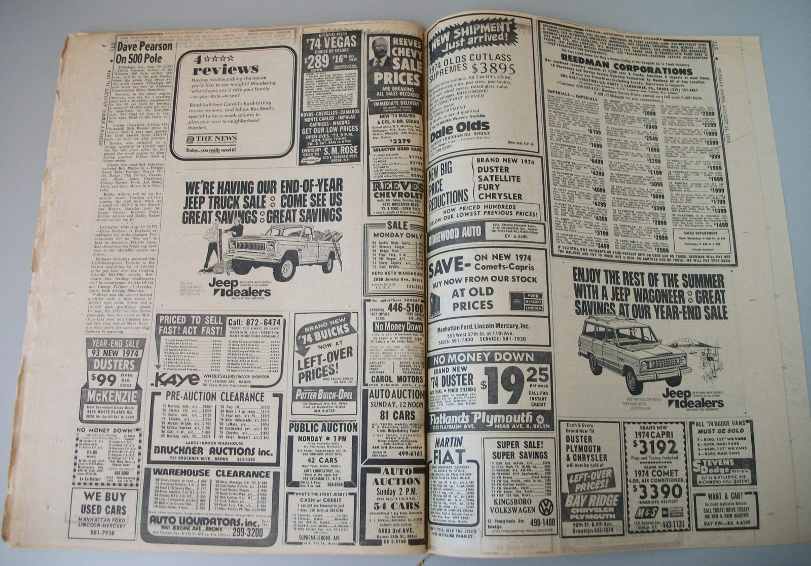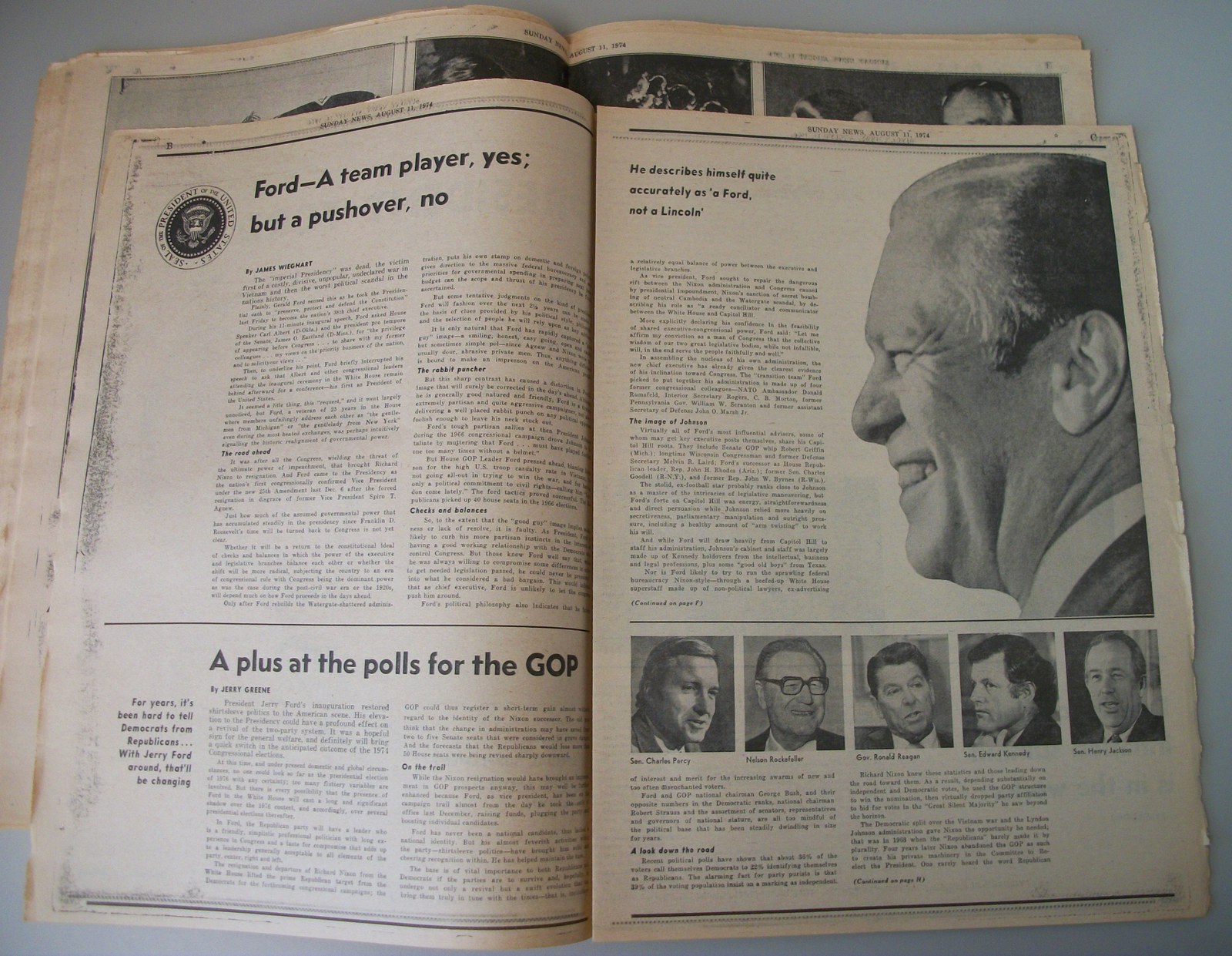 This is a very interesting old newspaper which features as the front page story President Ford’s transition into office after Nixon’s resignation. It has extensive coverage of this event and many very interesting pictures as well as a special pull out section on President Ford. It also features ads for great 1970’s styles. Under the sports section, there is coverage of golfer Lee Trevino and the Cincinnati Reds. There are also some really good deals on some classic cars in the classified section – you could try calling, they might still be for sale.