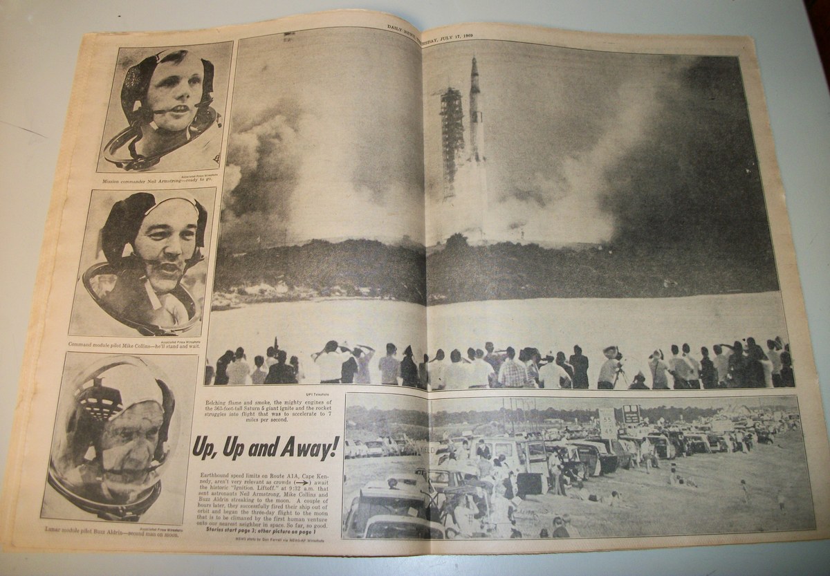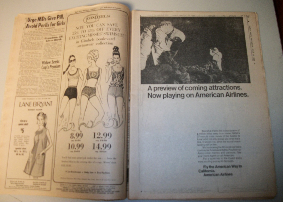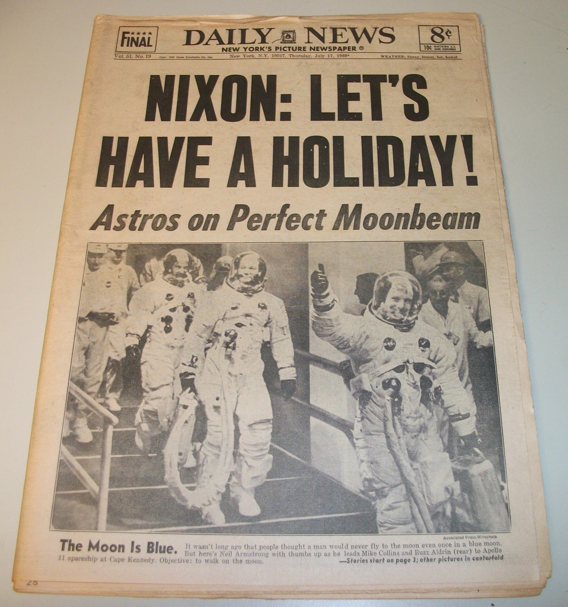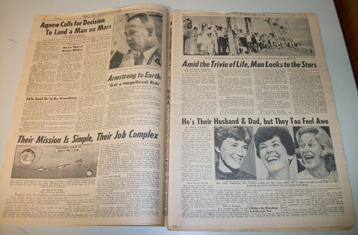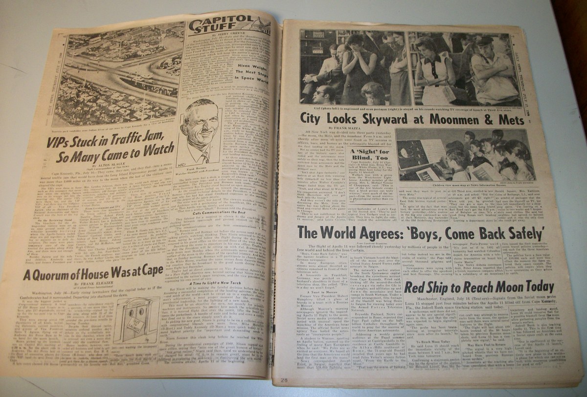 New York Daily News – Thursday July 17, 1969 What you see in the pictures is what you get: all 104 pages are included. This is a very interesting old newspaper which features as the front page stories: “NIXON: LET’S HAVE A HOLIDAY” “Astros on Perfect Moonbeam”; There are articles about: