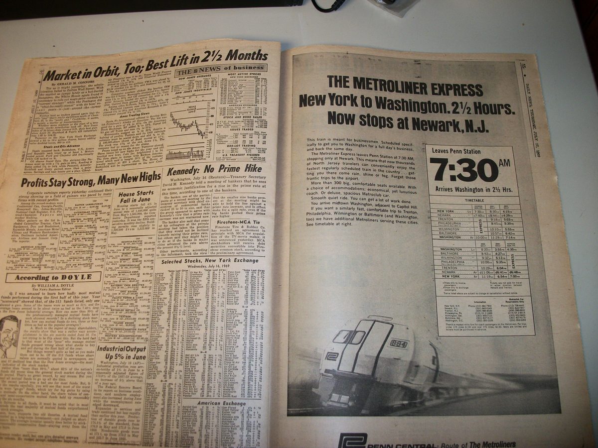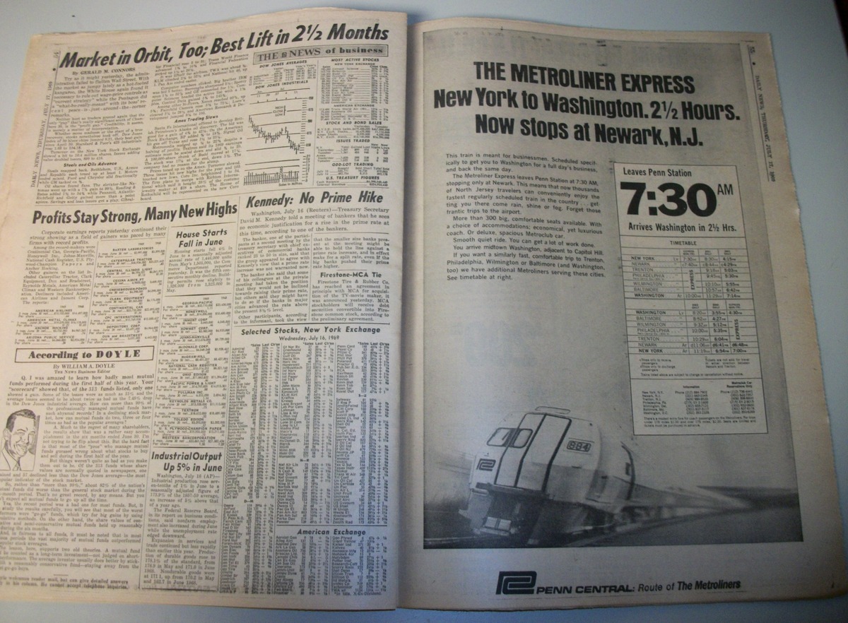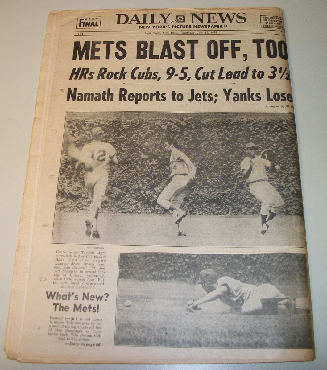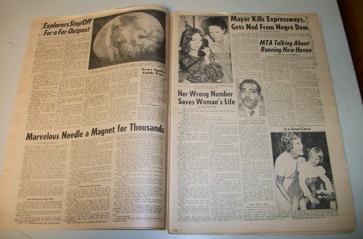 New York Daily News – Thursday July 17, 1969 What you see in the pictures is what you get: all 104 pages are included. This is a very interesting old newspaper which features as the front page stories: “NIXON: LET’S HAVE A HOLIDAY” “Astros on Perfect Moonbeam”; There are articles about: