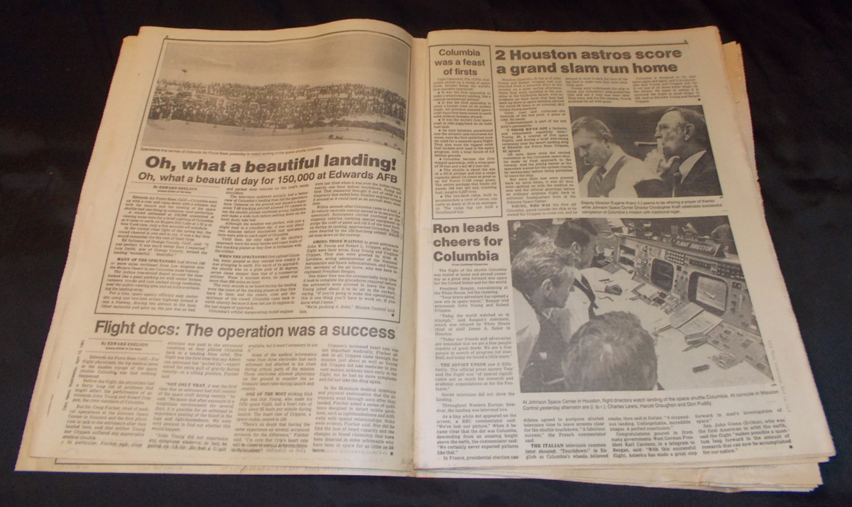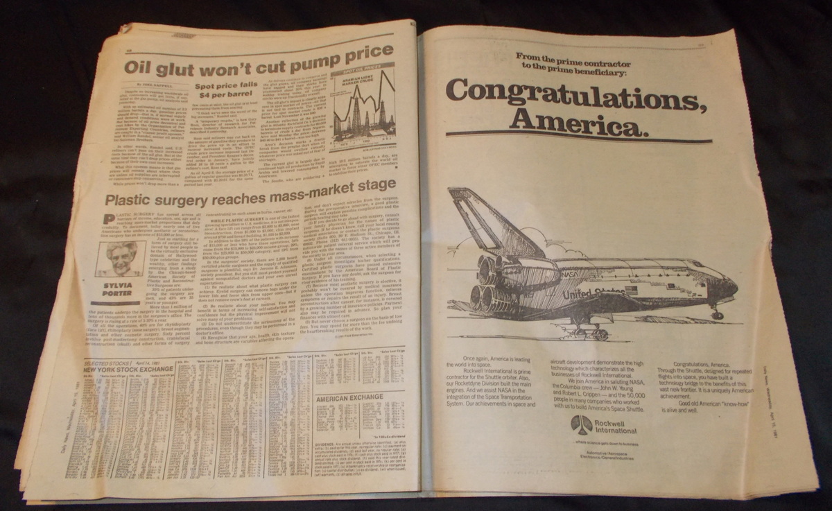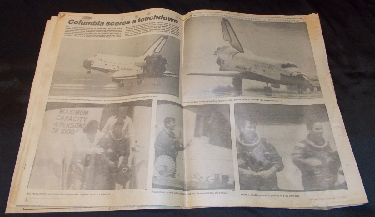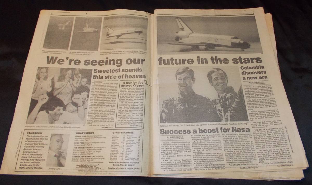 New York Daily News – Wednesday, April 15, 1981 What you see in the pictures is what you get: all 71 pages are included. This is a very interesting old newspaper which features as the front page story coverage of the successful return from space of STS-1, the first flight and first manned flight of the space shuttle piloted by astronauts John Young and Robert Crippen. The flight was threatened by the loss of some of the hear shield tiles during takeoff which would eventually destroy the shuttle upon reentry almost 22 years later in February of 2003.