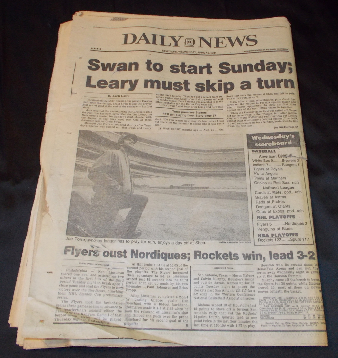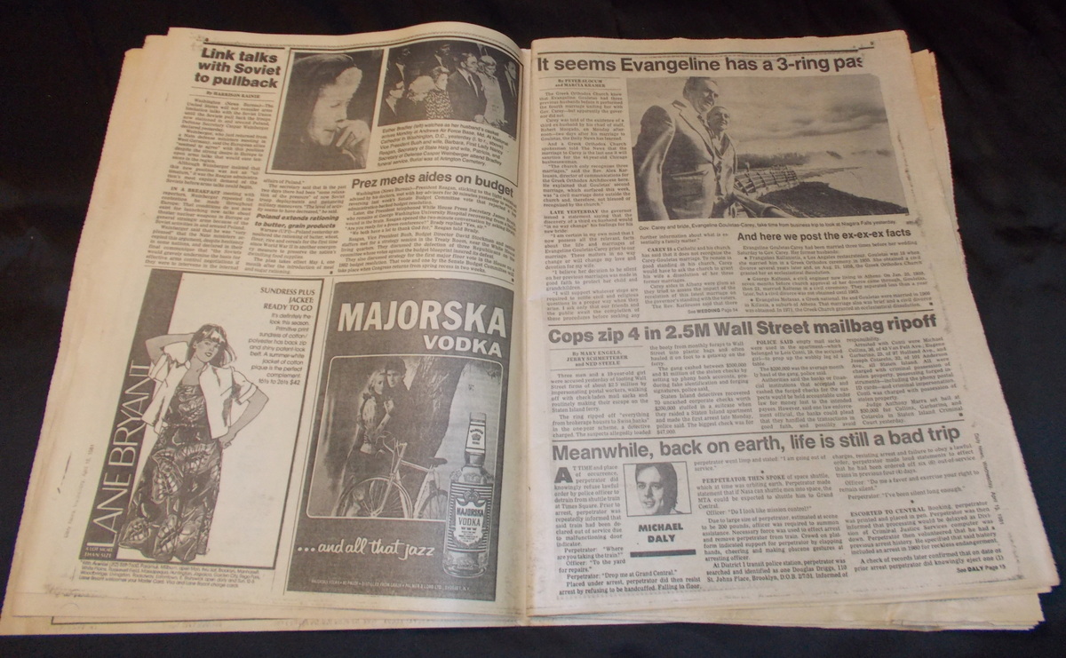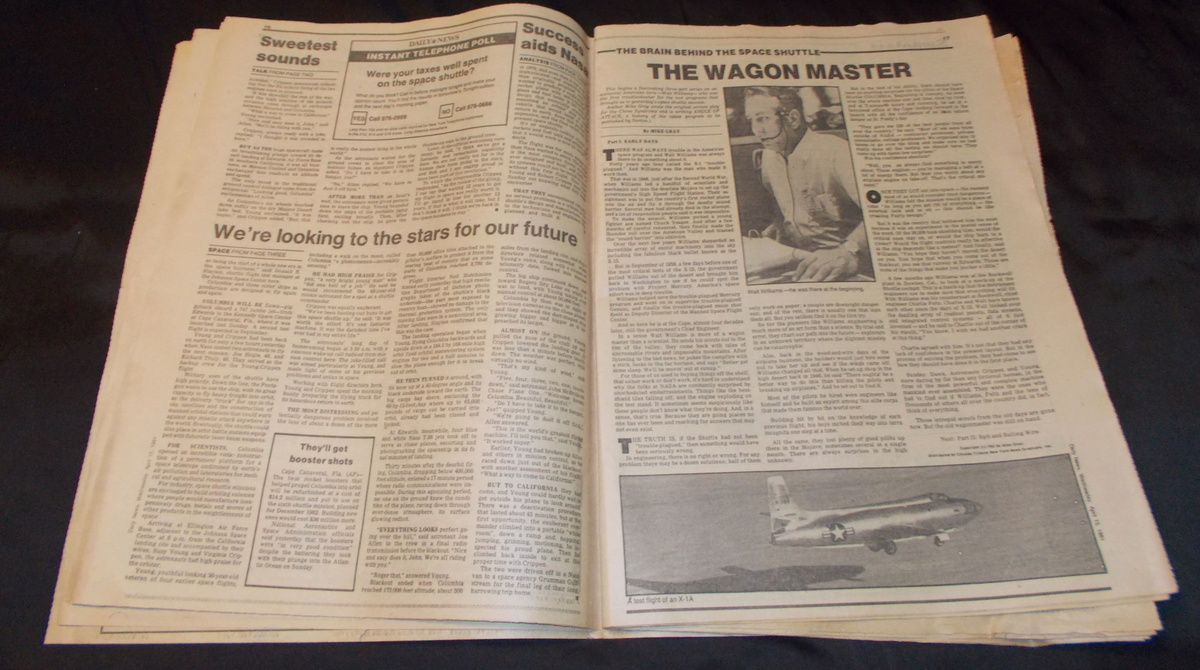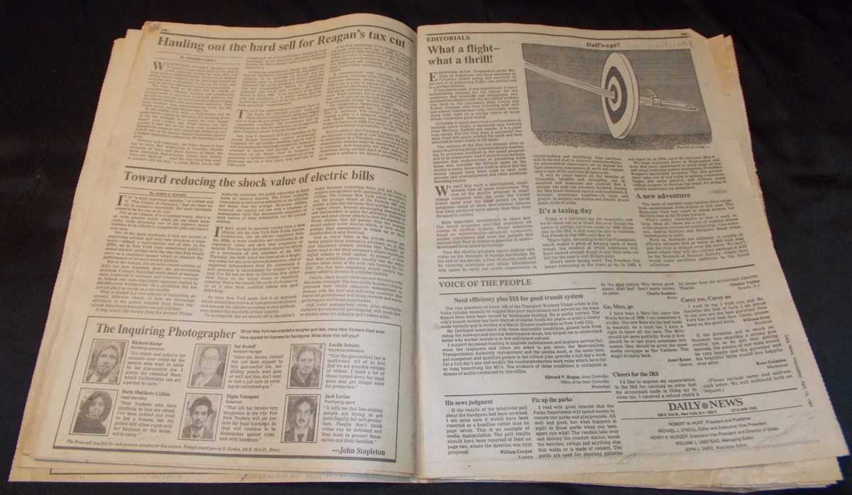 New York Daily News – Wednesday, April 15, 1981 What you see in the pictures is what you get: all 71 pages are included. This is a very interesting old newspaper which features as the front page story coverage of the successful return from space of STS-1, the first flight and first manned flight of the space shuttle piloted by astronauts John Young and Robert Crippen. The flight was threatened by the loss of some of the hear shield tiles during takeoff which would eventually destroy the shuttle upon reentry almost 22 years later in February of 2003.