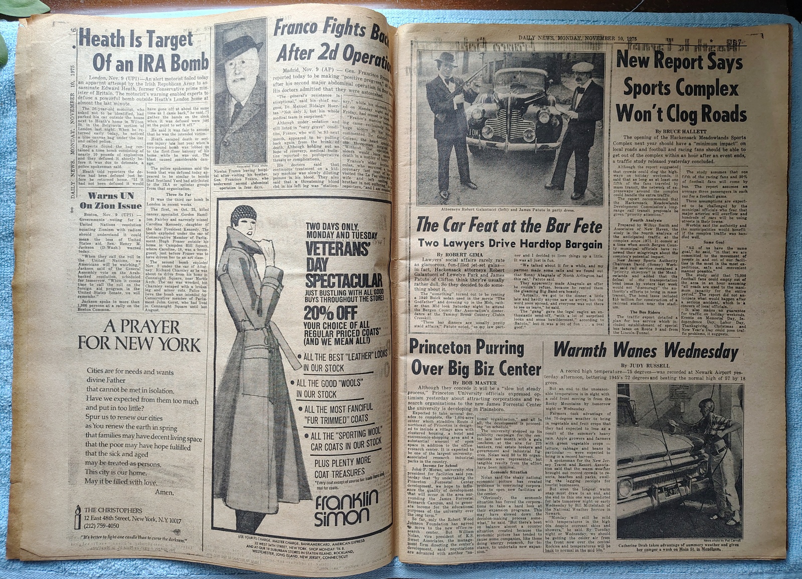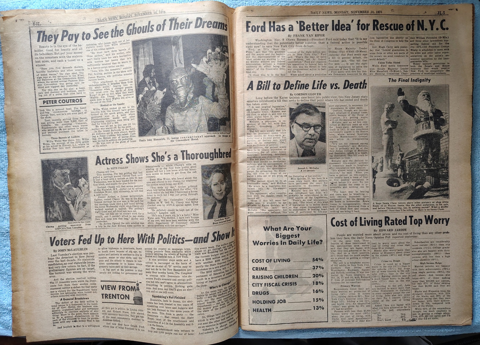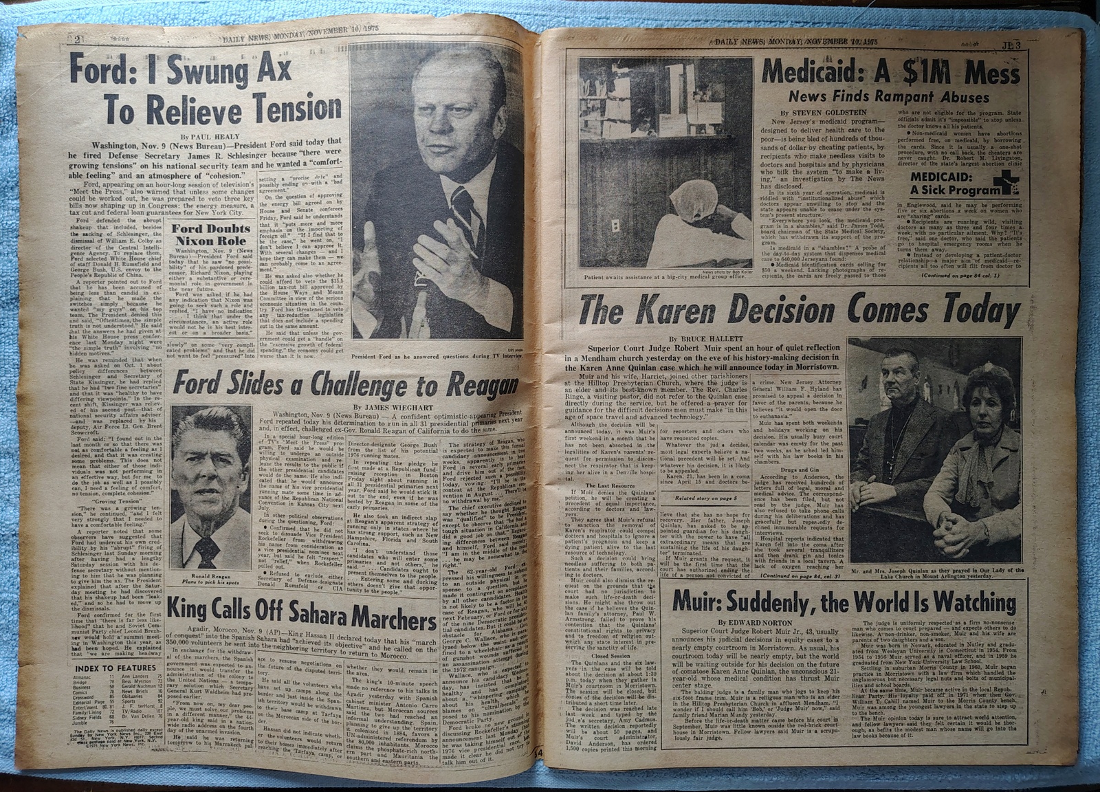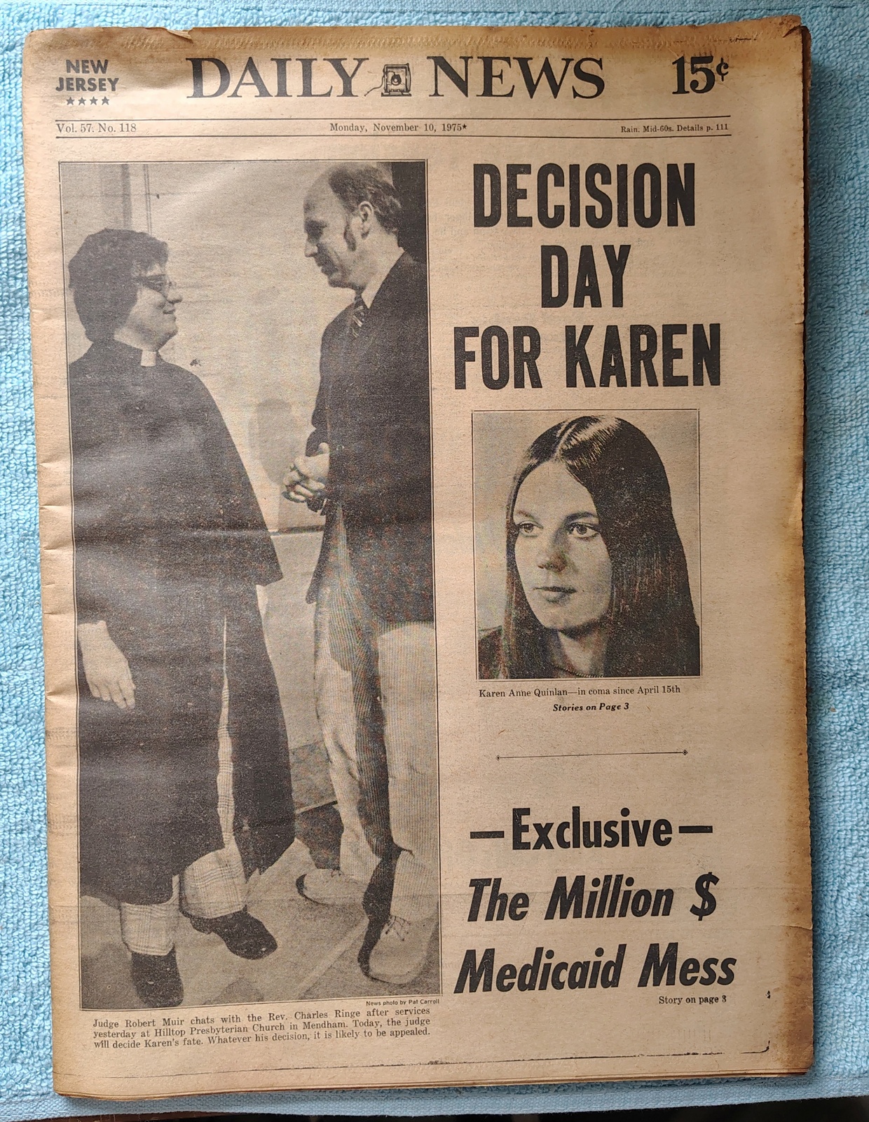 New York Daily News (New Jersey Edition) Monday, November 10, 1975. This old newspaper features on the front page a picture of Karen Quinlan and the Judge who will decide her fate talking to a Presbyterian minister. The headlines include: ‘Decision Day for Karen’ ‘Exclusive – The Million $ Medicaid Mess’ What you see in the pictures is what you get.
