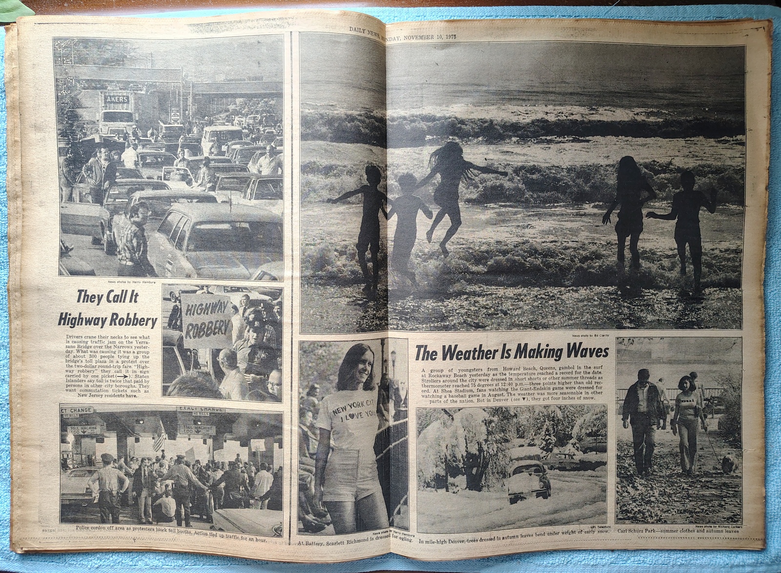 ‘The Three R’s: Robbing, Rumbling and Rampaging’ – First of a series of articles about violence in high school. - The centerfold has pictures of traffic backed up due to a protest at the toll booth on the Verrazano Narrows Bridge, and pictures of folks enjoying the mild weather in New York contrasted with the 4 inches of snow in Denver.