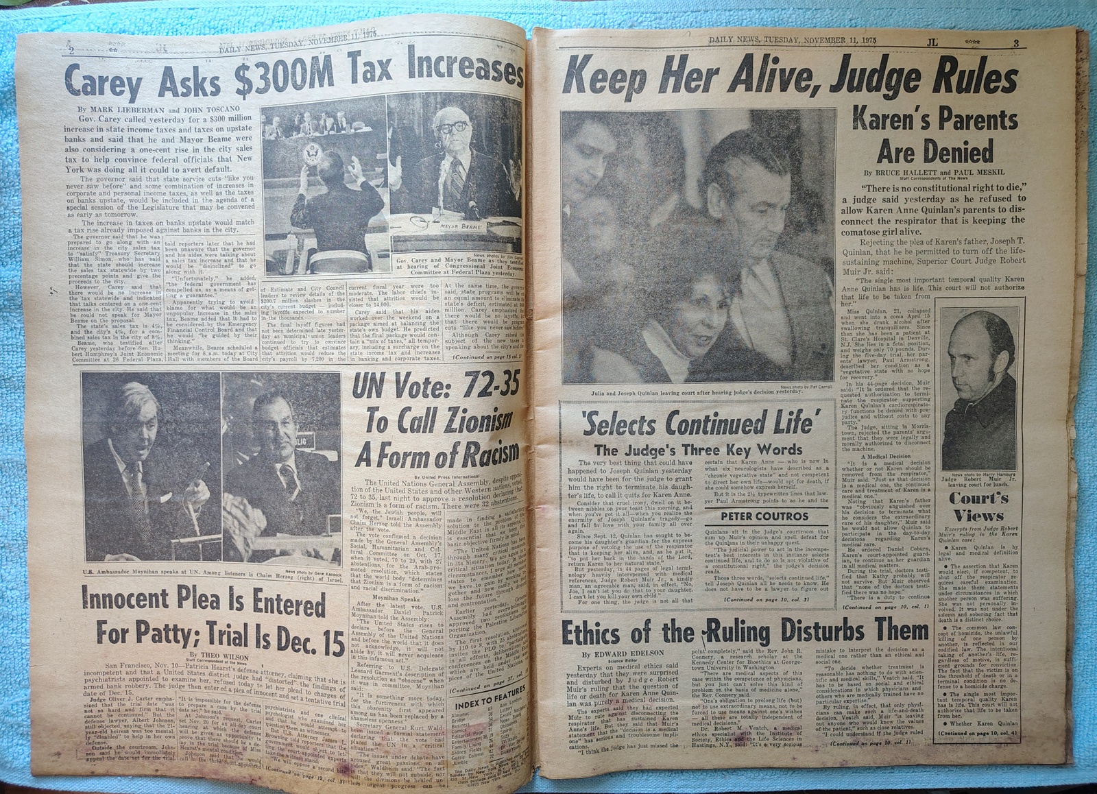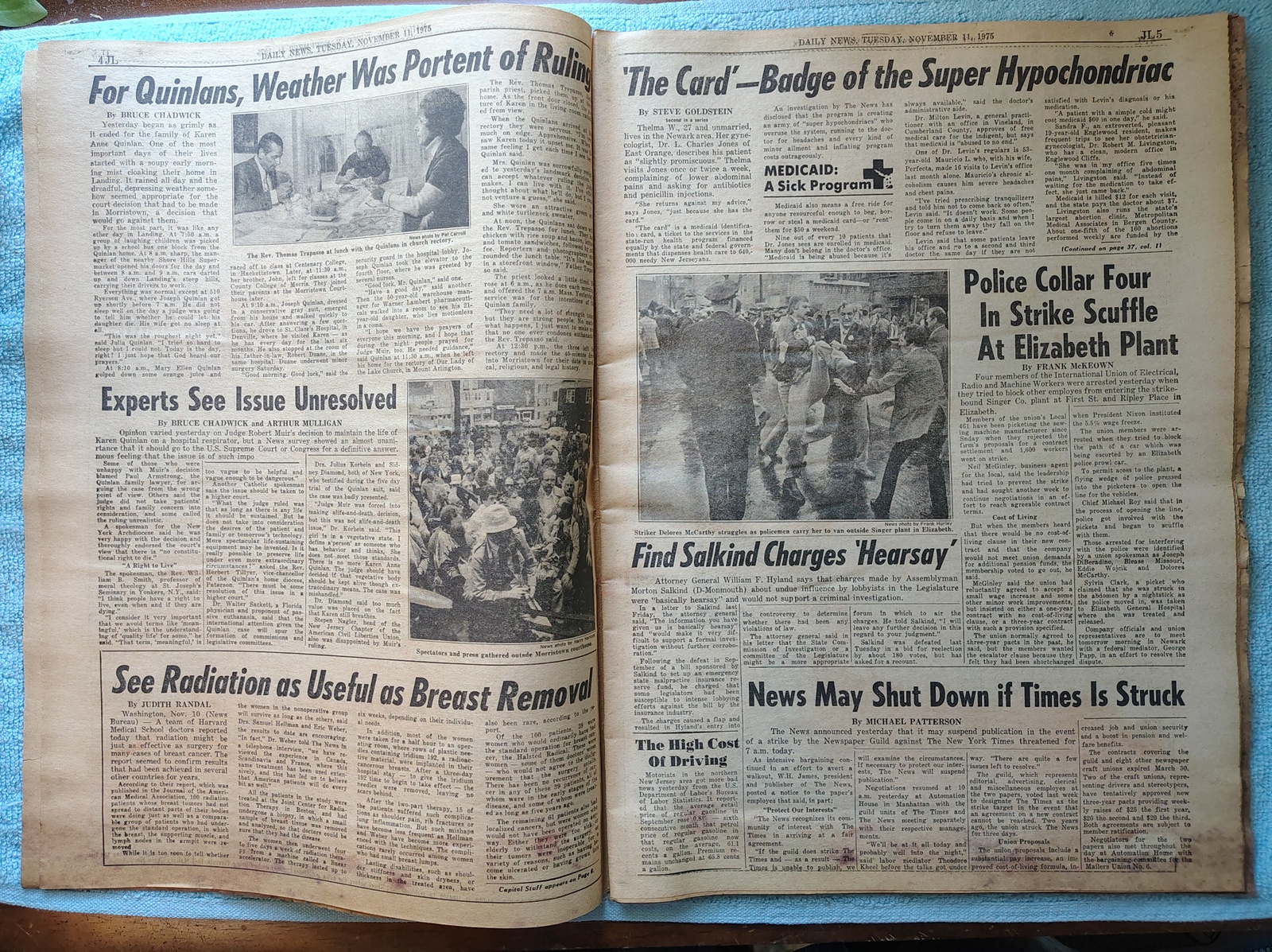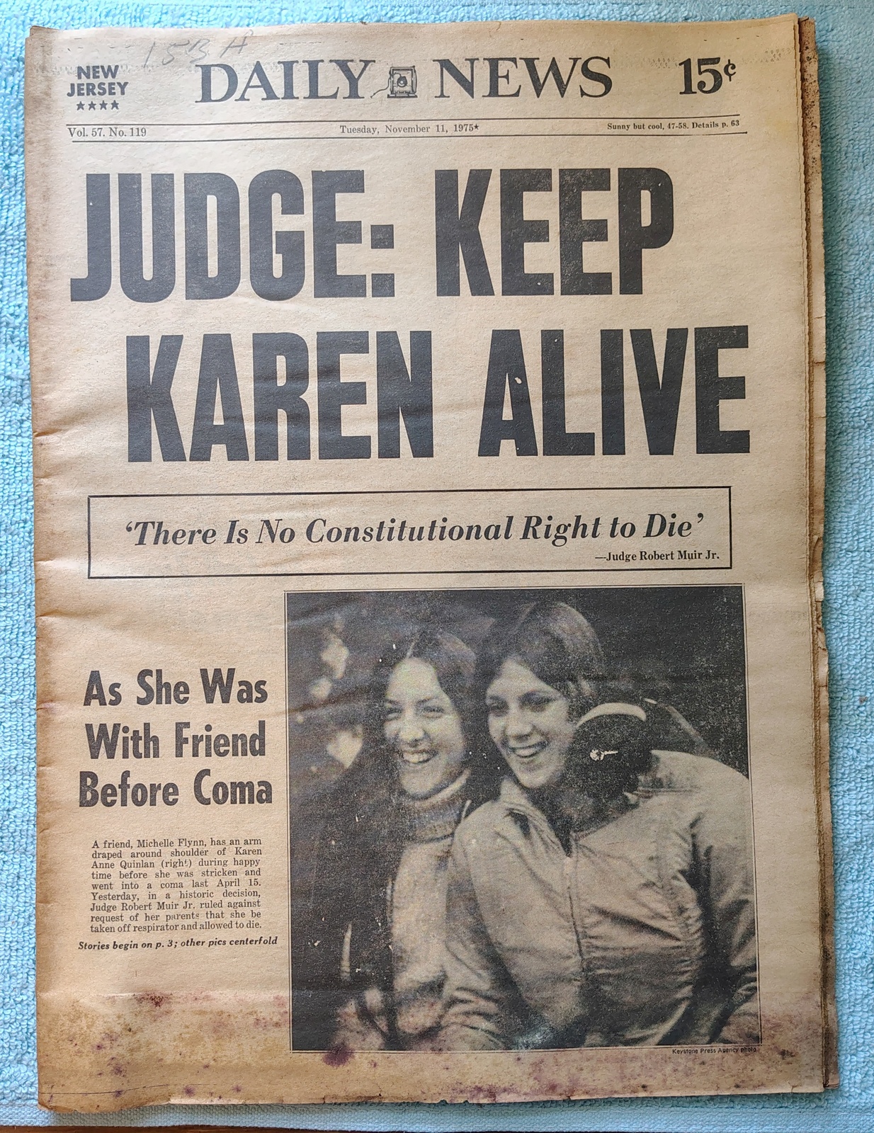 New York Daily News (New Jersey Edition) Tuesday, November 11, 1975. This old newspaper features on the front page a picture of Karen Quinlan smiling with her friend before going into a coma. The headline: ‘Judge: Keep Karen Alive’ ‘There Is No Constitutional Right to Die’ What you see in the pictures is what you get.