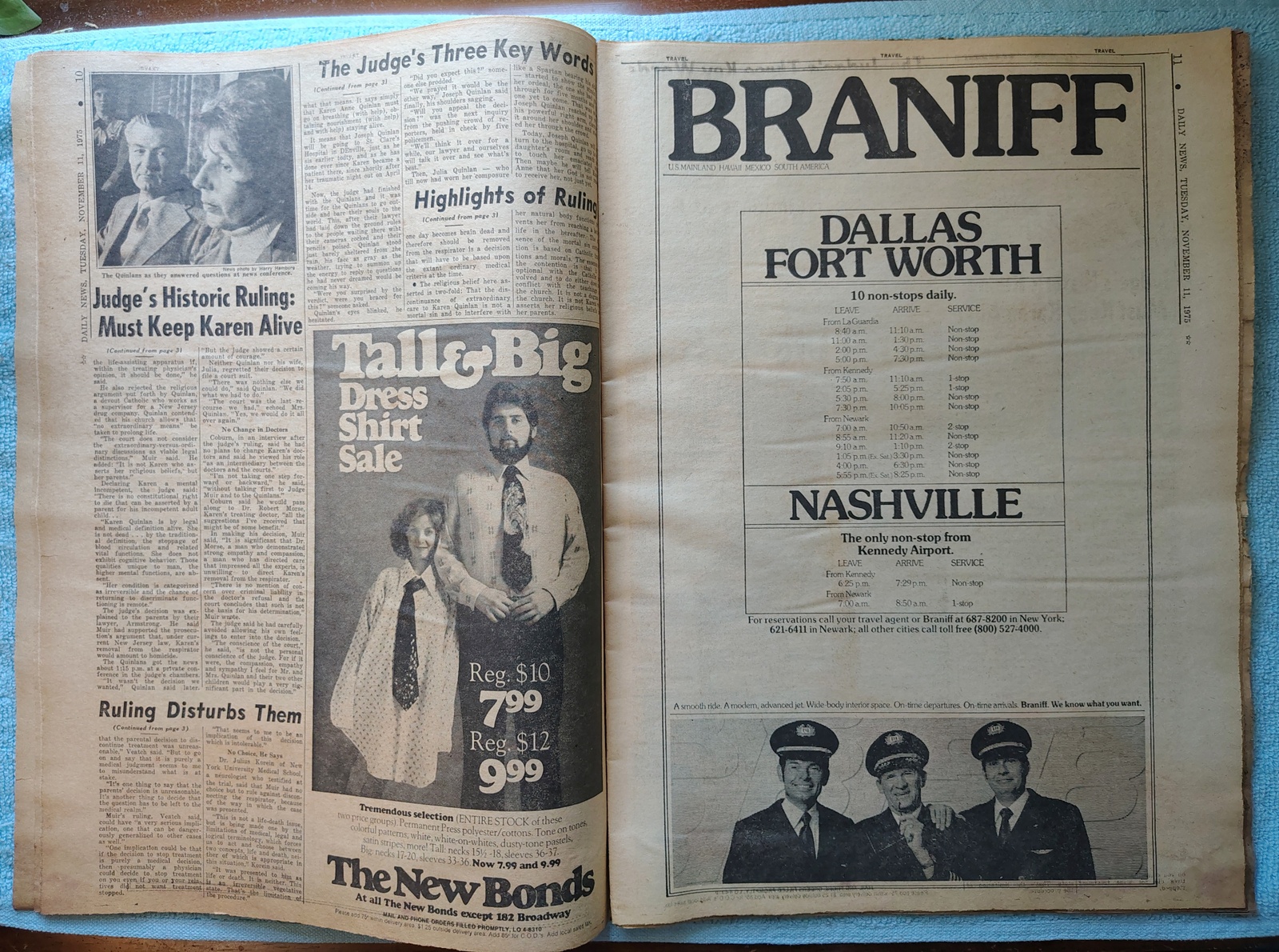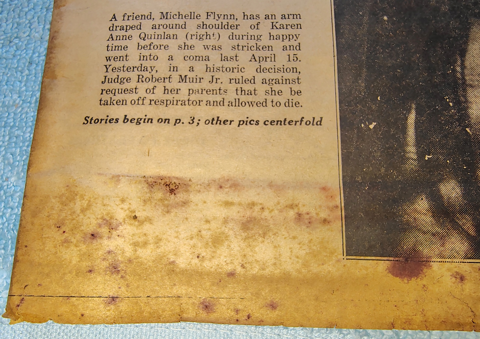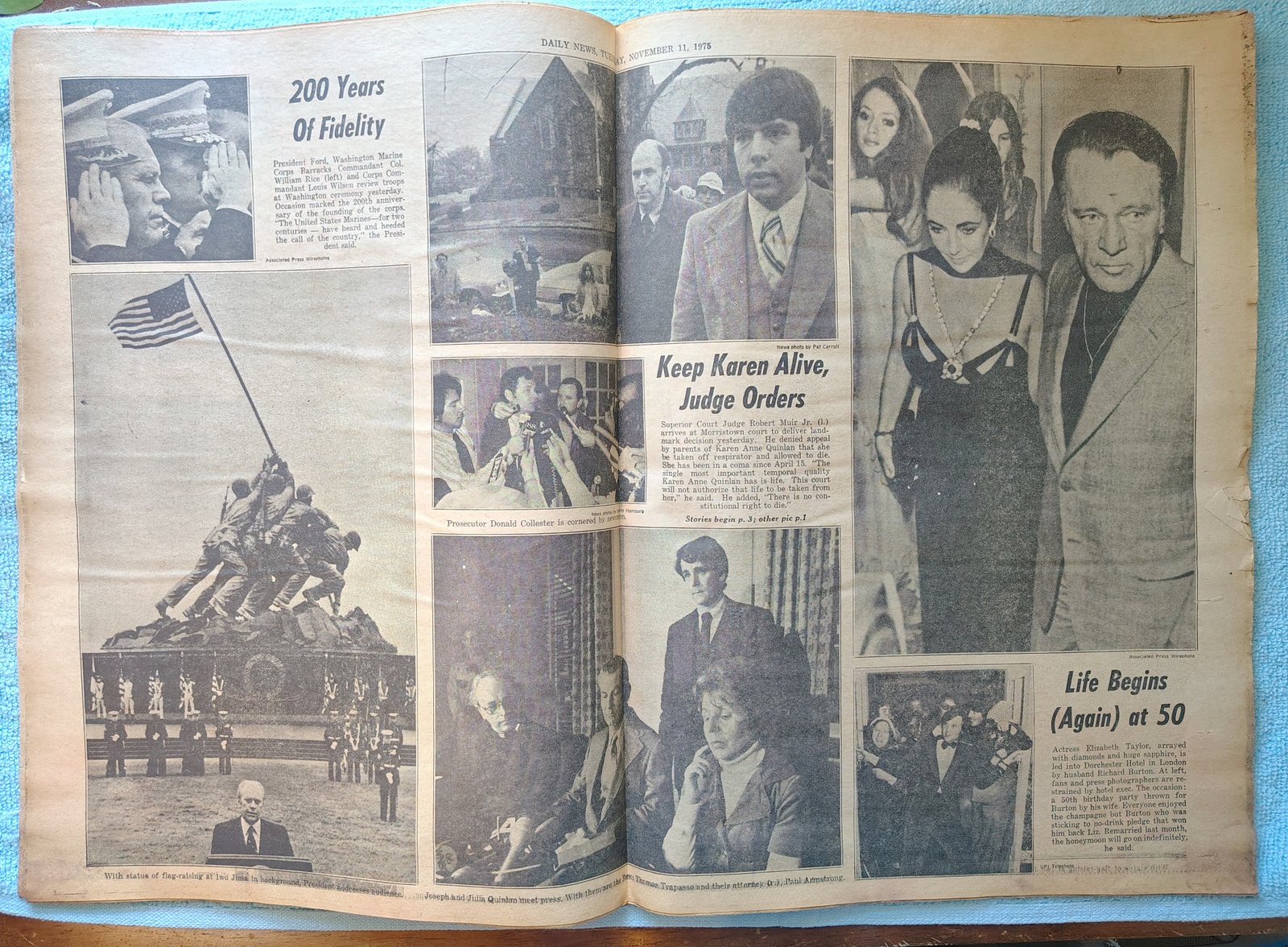 New York Daily News (New Jersey Edition) Tuesday, November 11, 1975. This old newspaper features on the front page a picture of Karen Quinlan smiling with her friend before going into a coma. The headline: ‘Judge: Keep Karen Alive’ ‘There Is No Constitutional Right to Die’ What you see in the pictures is what you get.