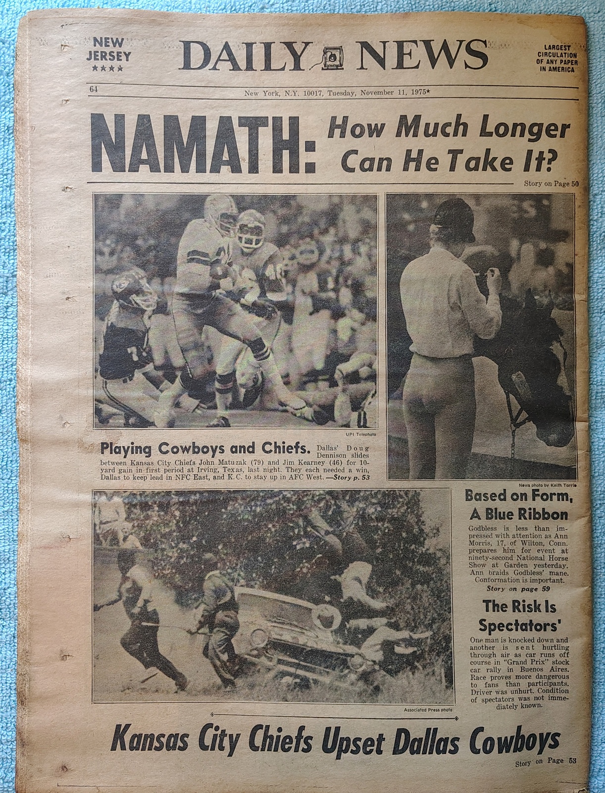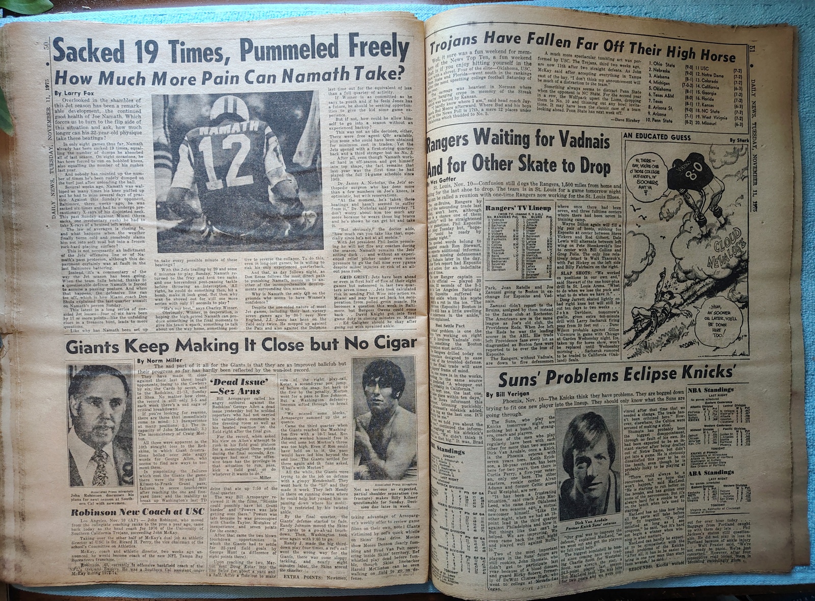 - ‘Sacked 19 Times, Pummeled Freely – How Much More Pain Can Namath Take?’ – 32 Year old Joe Namath has been sacked 19 times in 8 games so far.