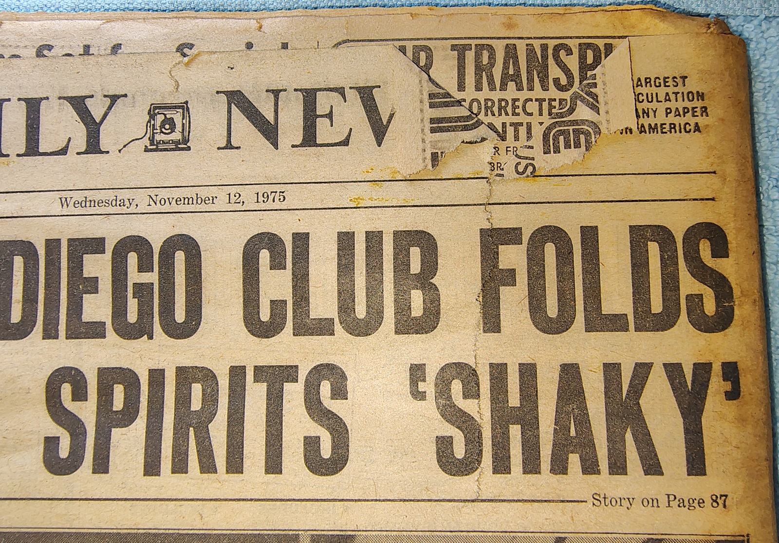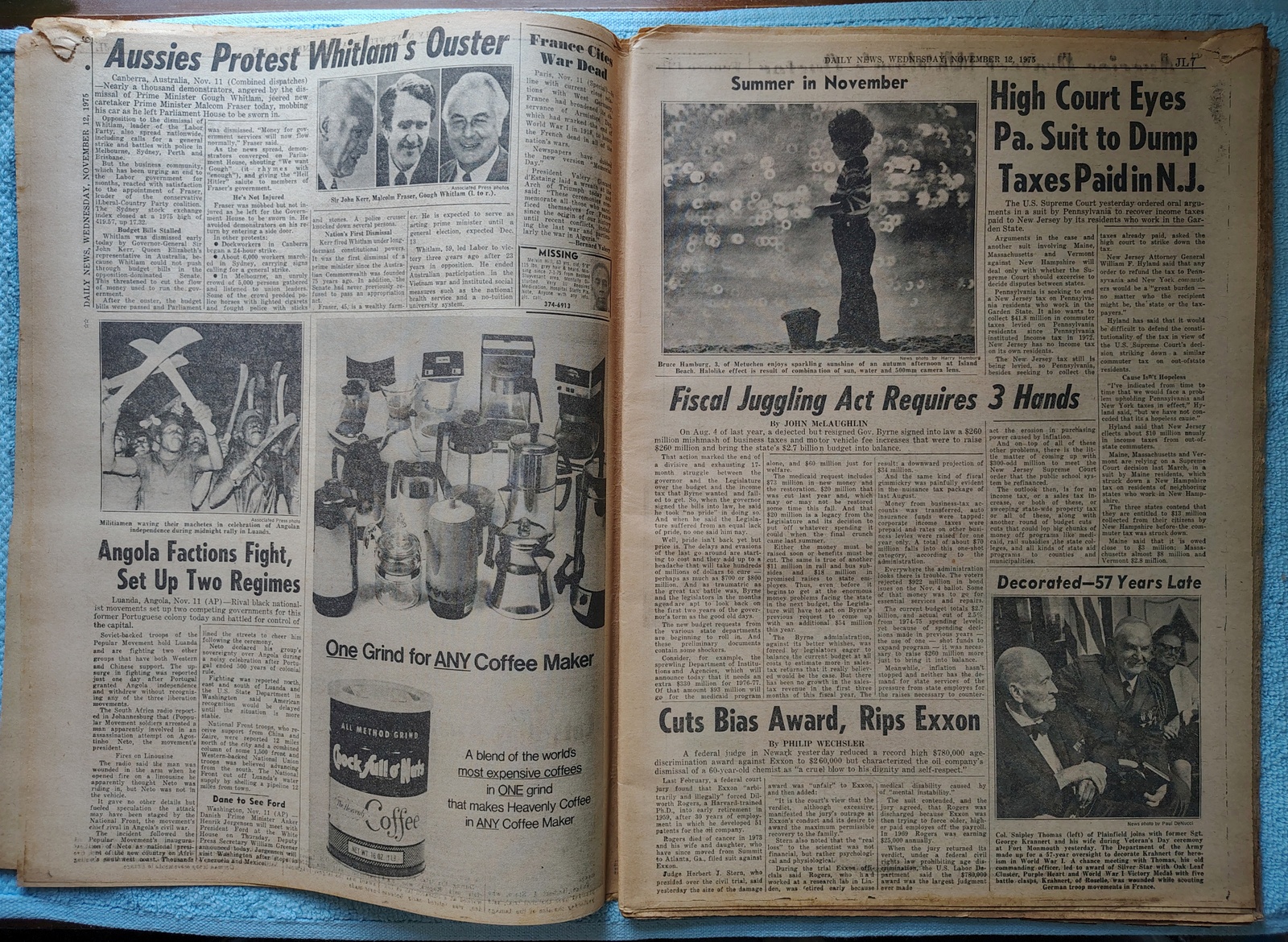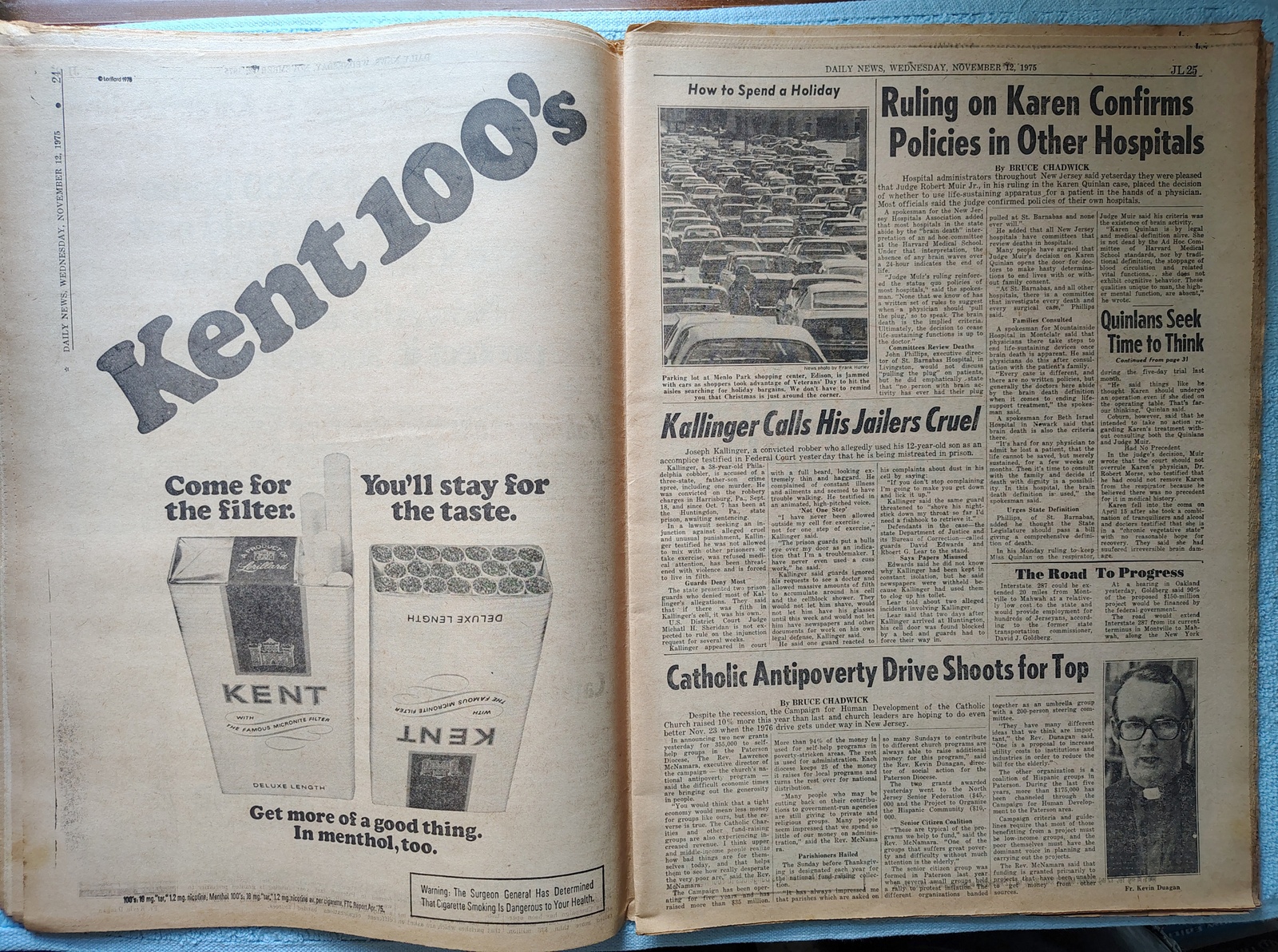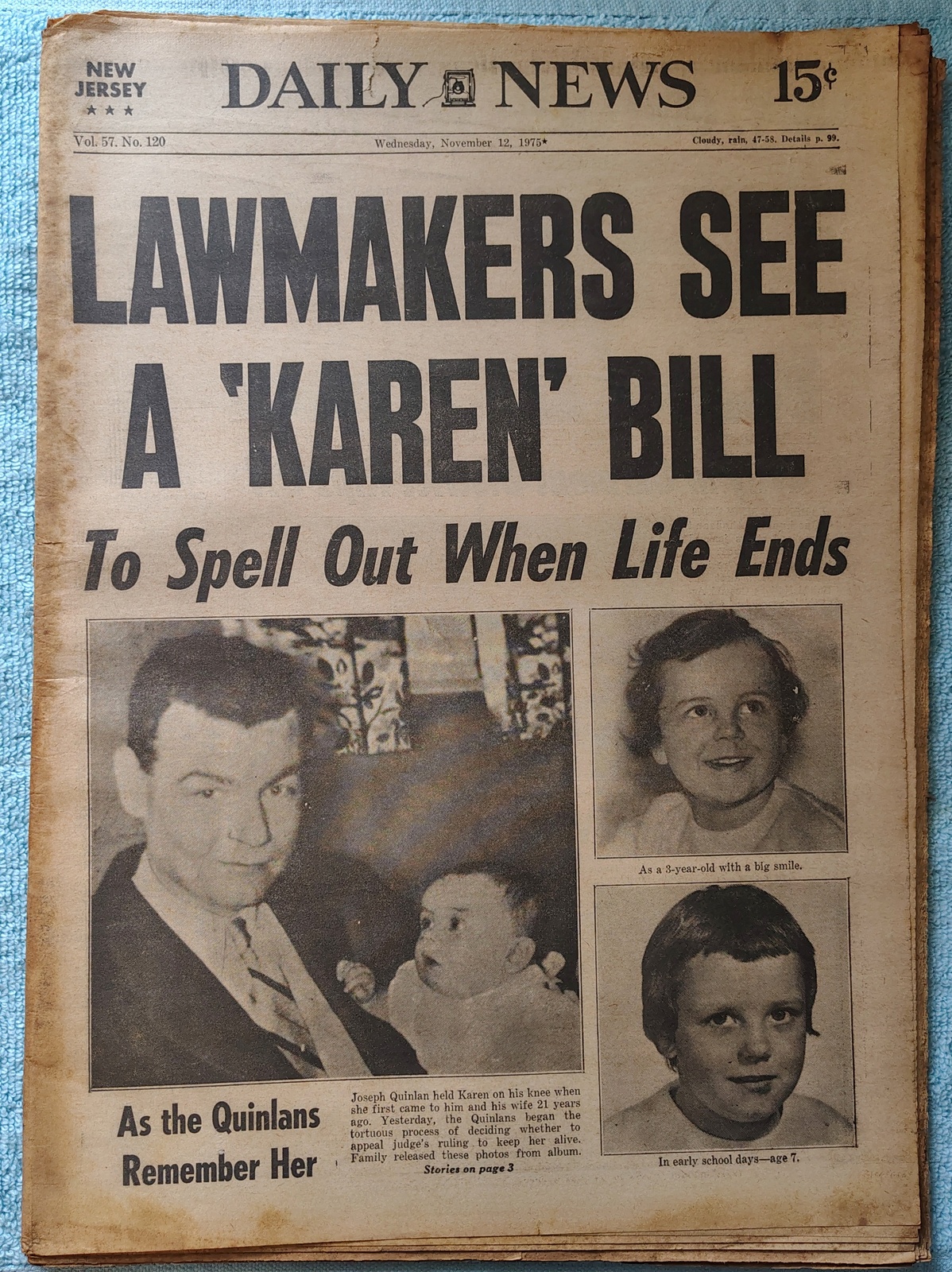 New York Daily News (New Jersey Edition) Wednesday, November 12, 1975. This old newspaper features on the front page a pictures of Karen Quinlan as a child. The headline: ‘Lawmakers See A ‘Karen’ Bill’ ‘To Spell Out When Life Ends’ What you see in the pictures is what you get.