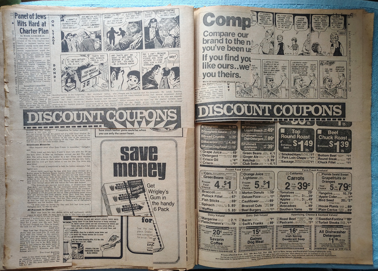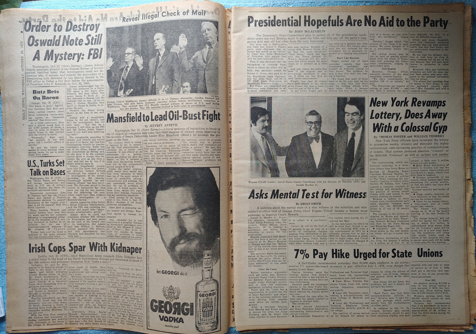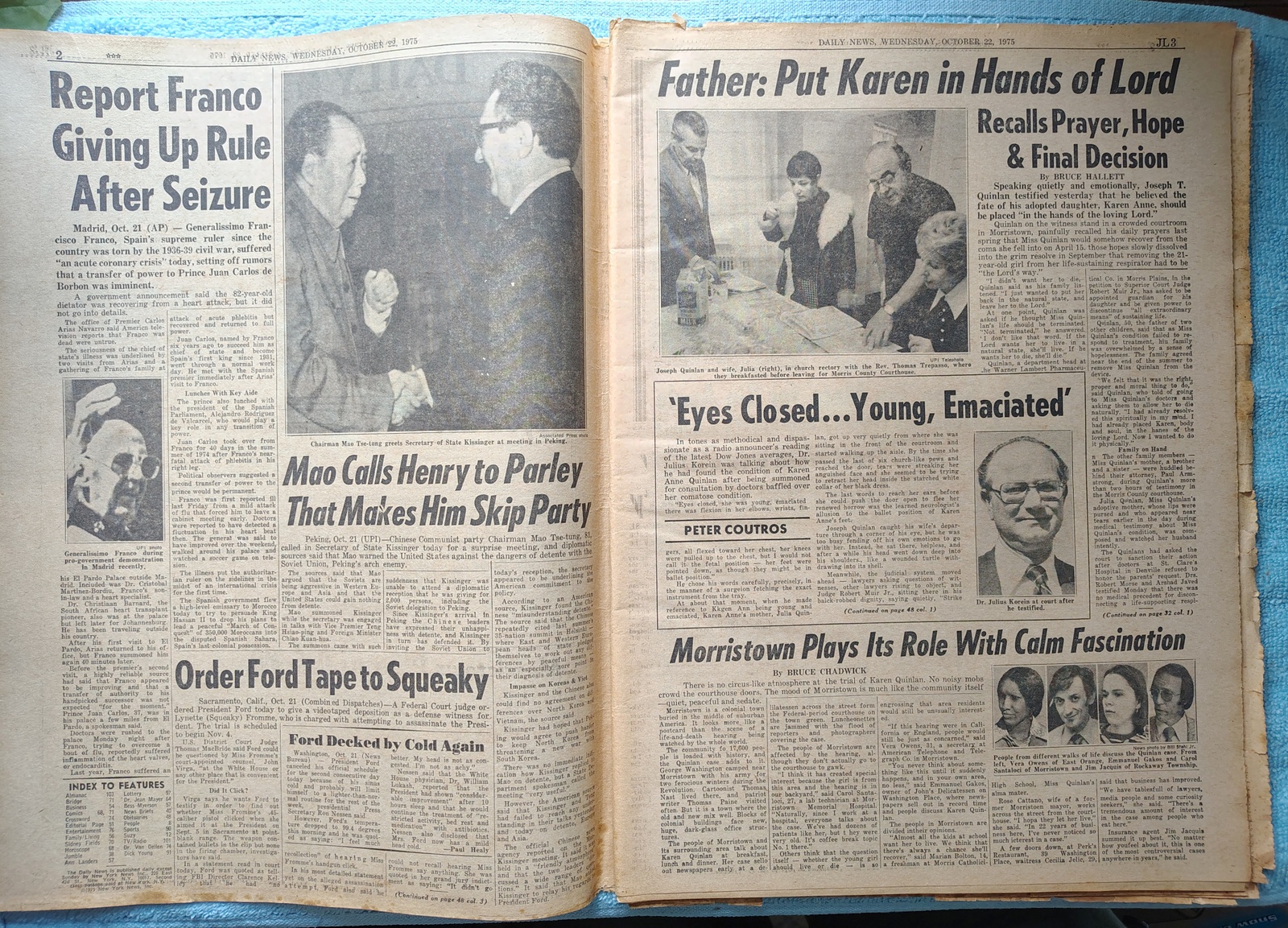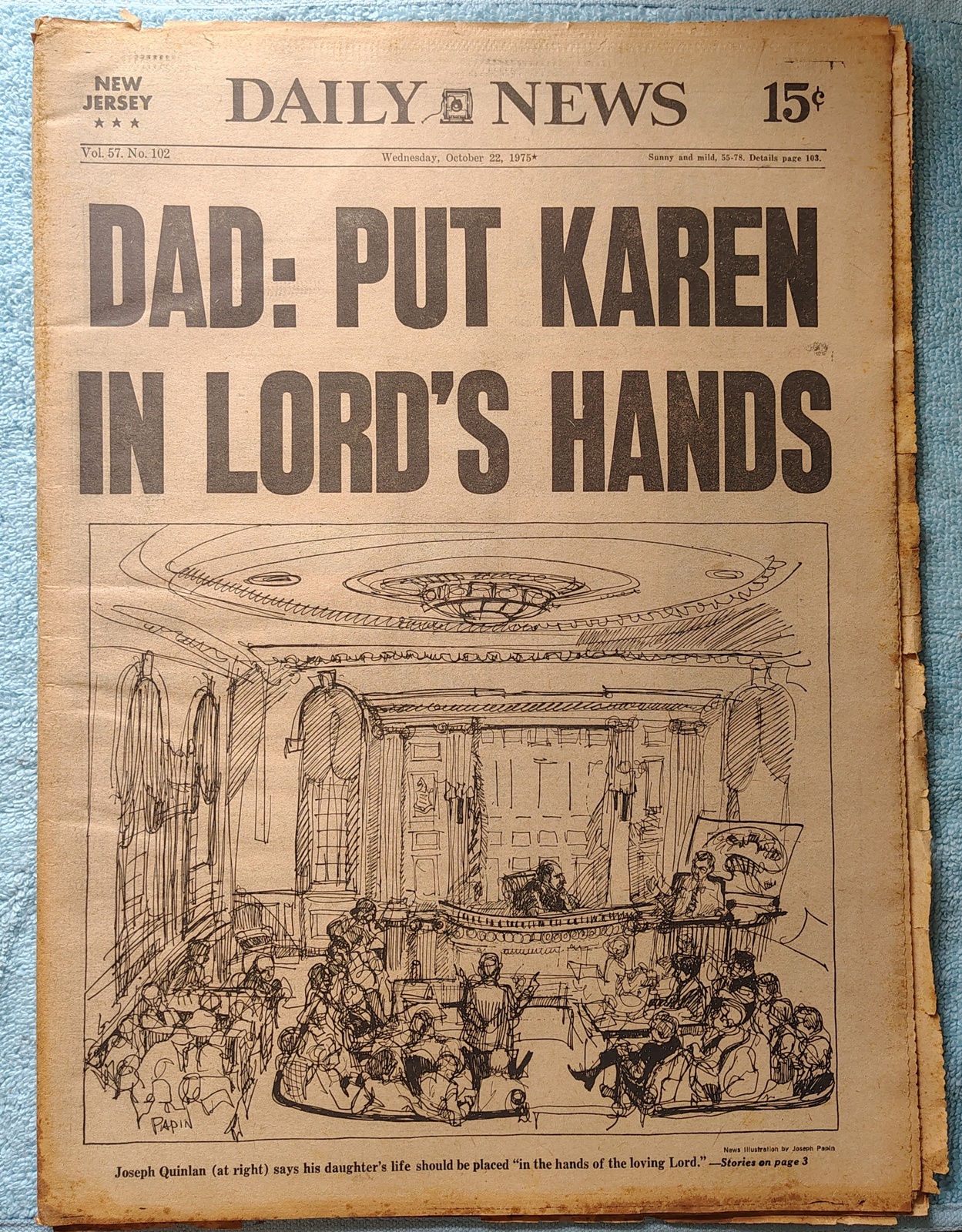 New York Daily News (New Jersey Edition) Wednesday, October 22, 1975. This old newspaper features on the front page a picture of the courtroom illustration of the Karen Quinlan case. The headline is: ‘Dad: Put Karen In Lord’s Hands’ What you see in the pictures is what you get.
