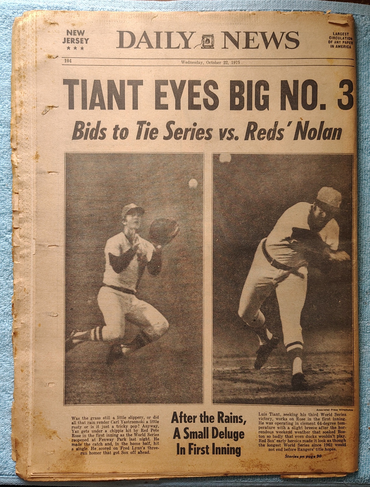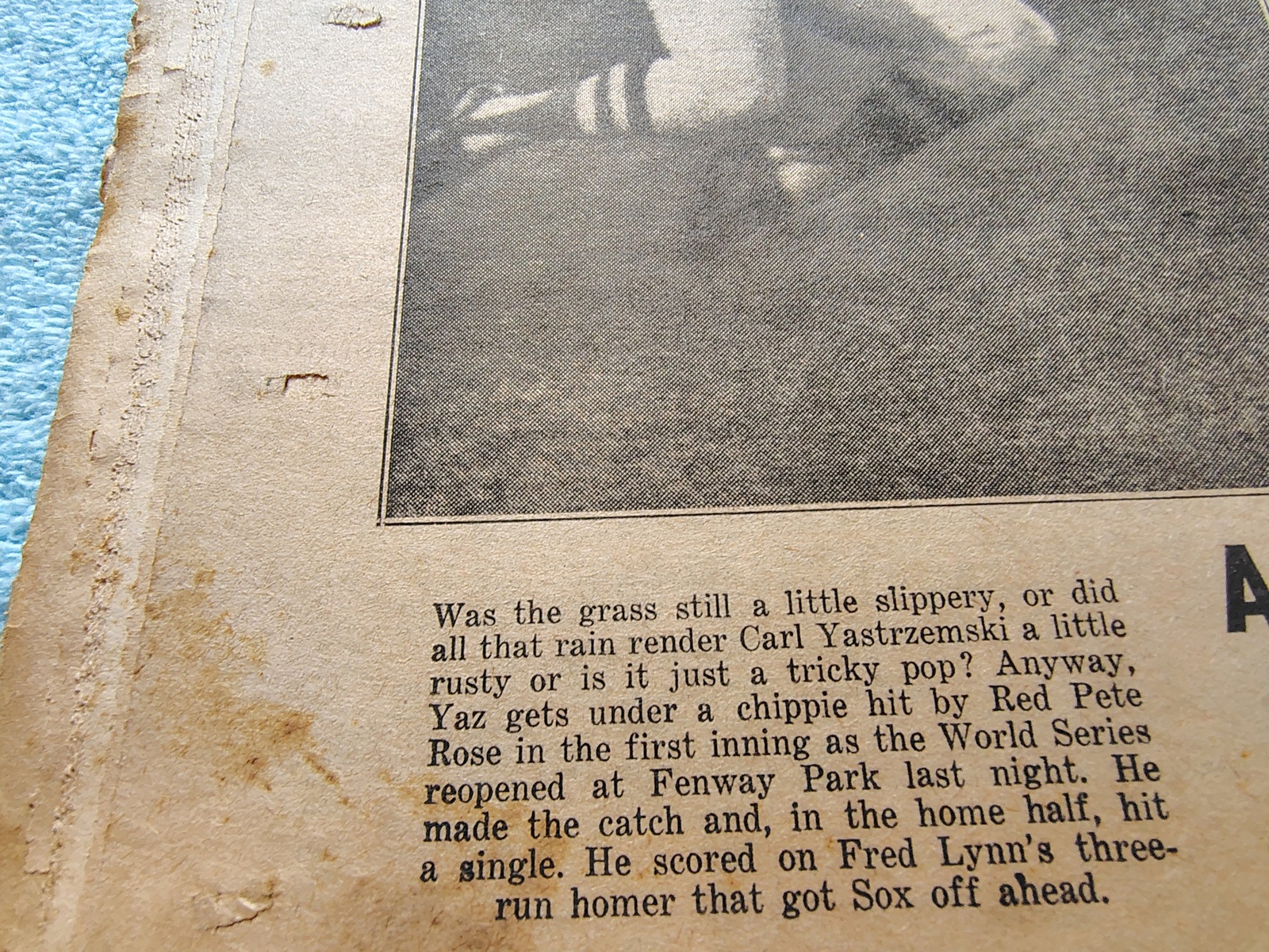 - The back page features a pictures of action in the World Series at Fenway Park after a long rain delay – Carl Yastrzemski going after a Pete Rose hit and Luis Taint pitching to Rose.