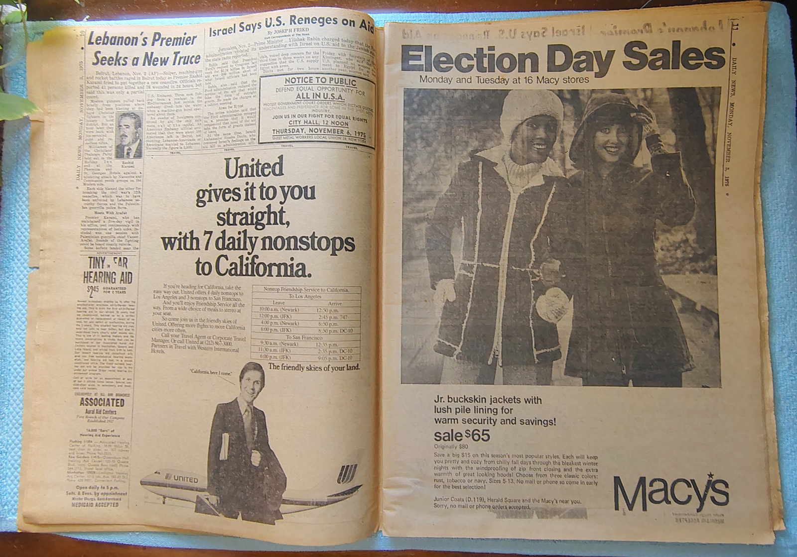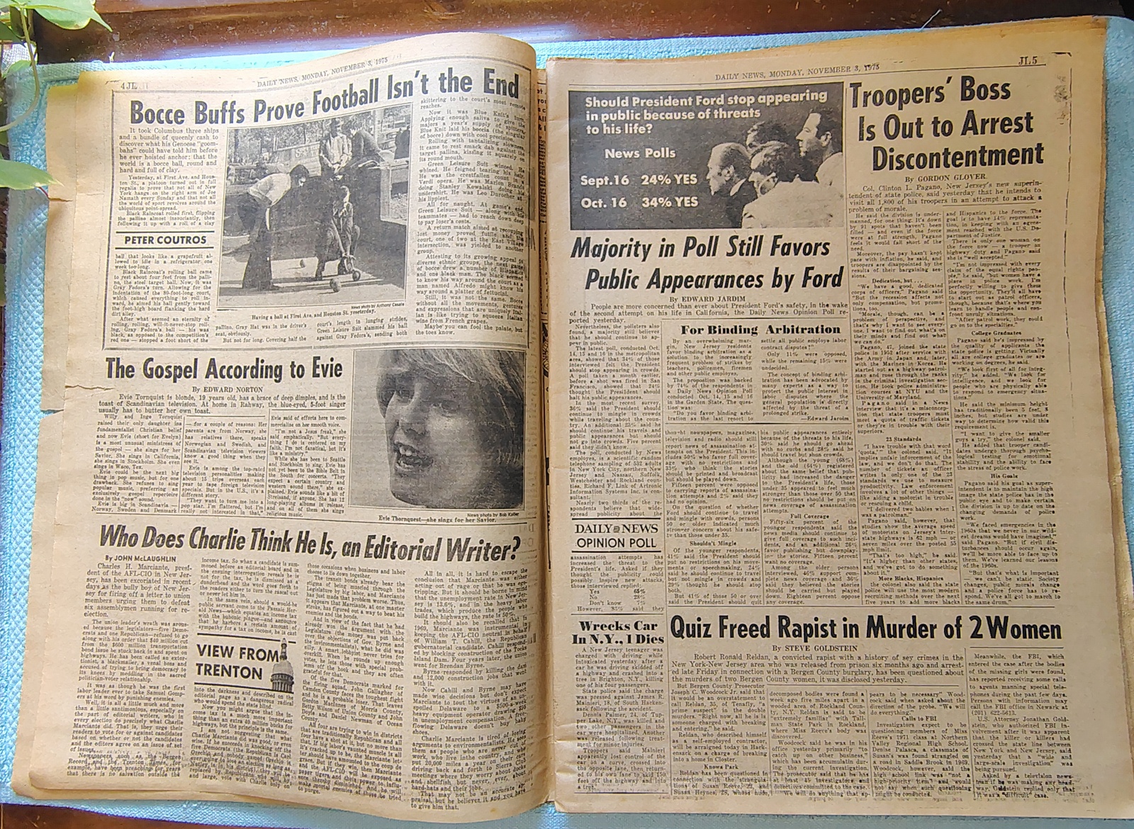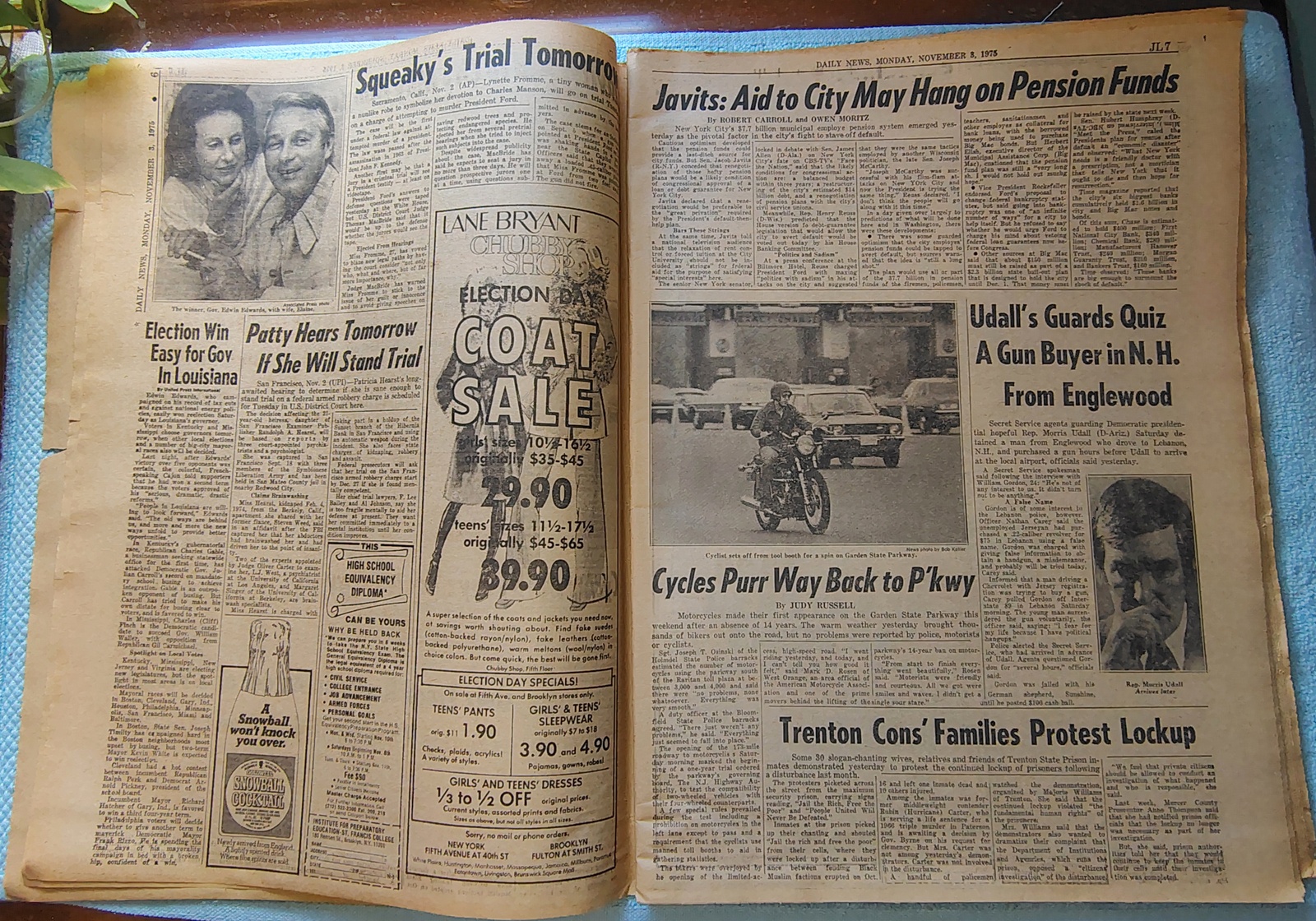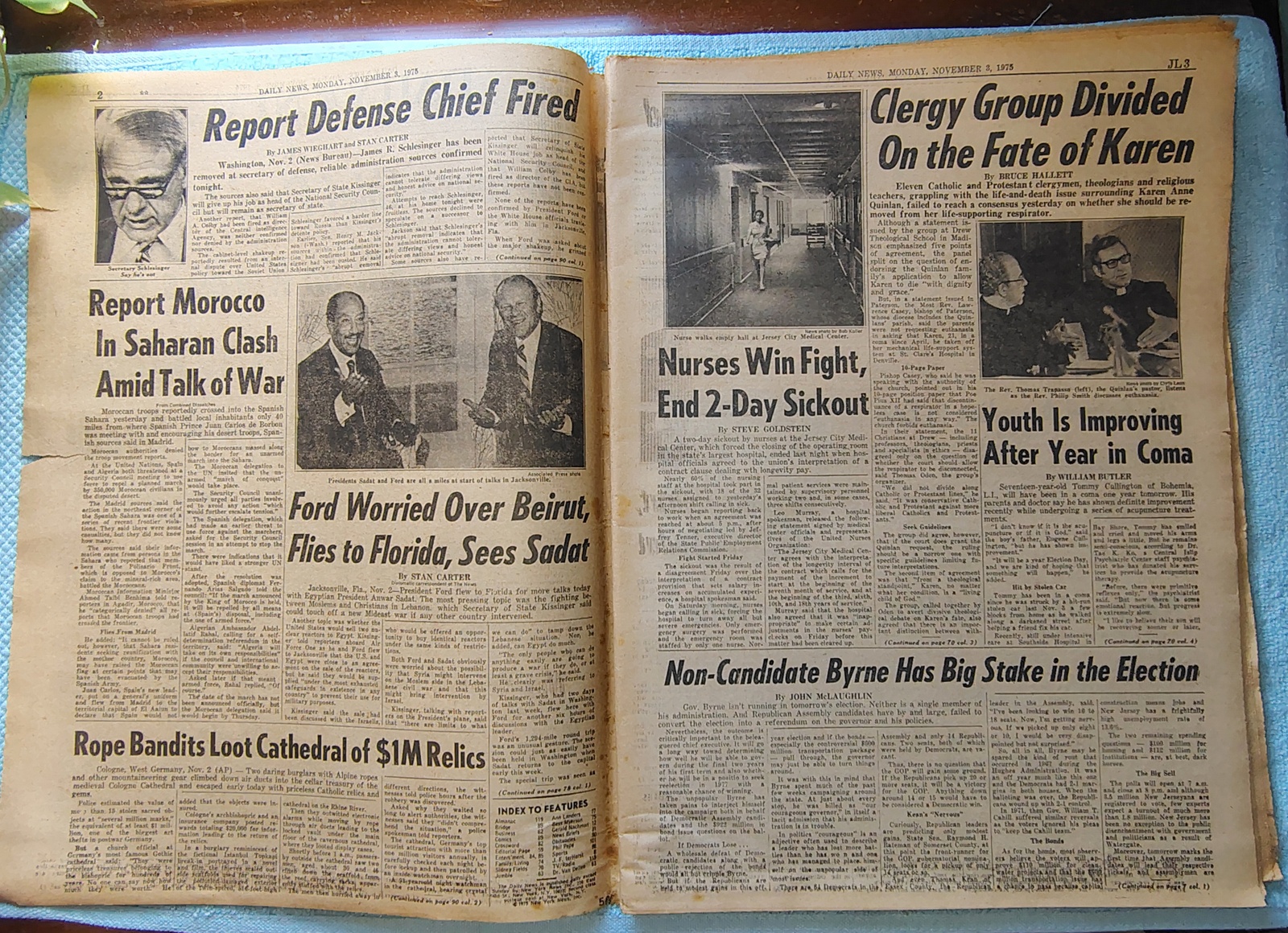 New York Daily News (New Jersey Edition) Monday, November 3, 1975. This old newspaper features on the front page a picture of President Ford shaking hands in Jacksonville Naval Air Station on a trip to meet with Egyptian President Anwar Sadat. The headlines include: ‘Defense Chief Fired By Ford’ ‘Clergy Split on Karen’s Fate’ ‘Nurses End Jersey City Sickout’ ‘Showdown for Byrne & Bonds’ What you see in the pictures is what you get.