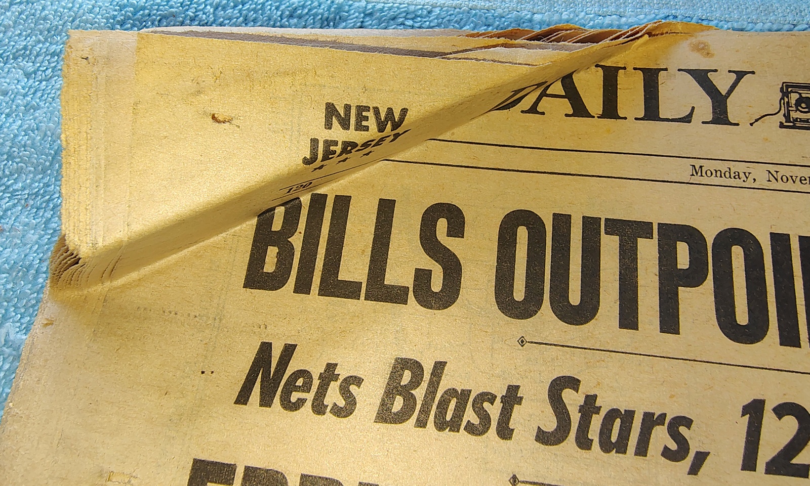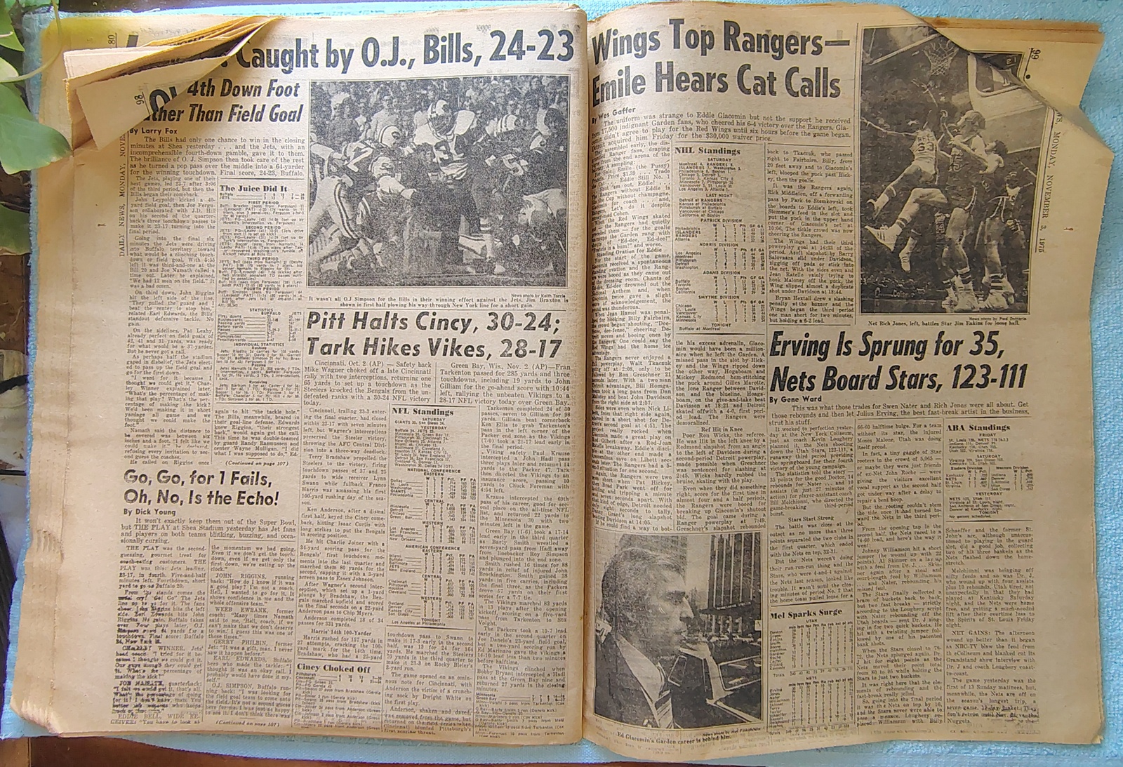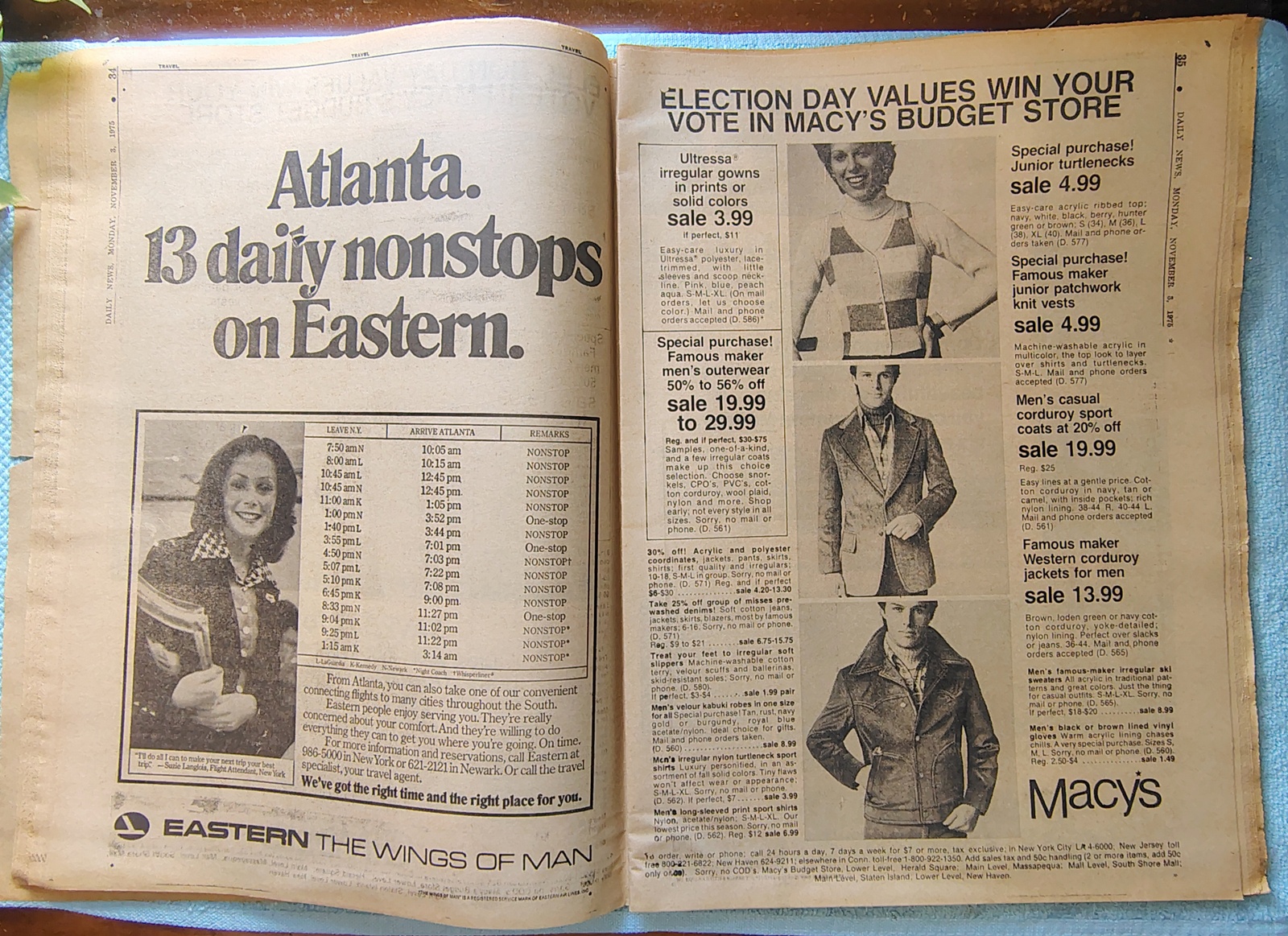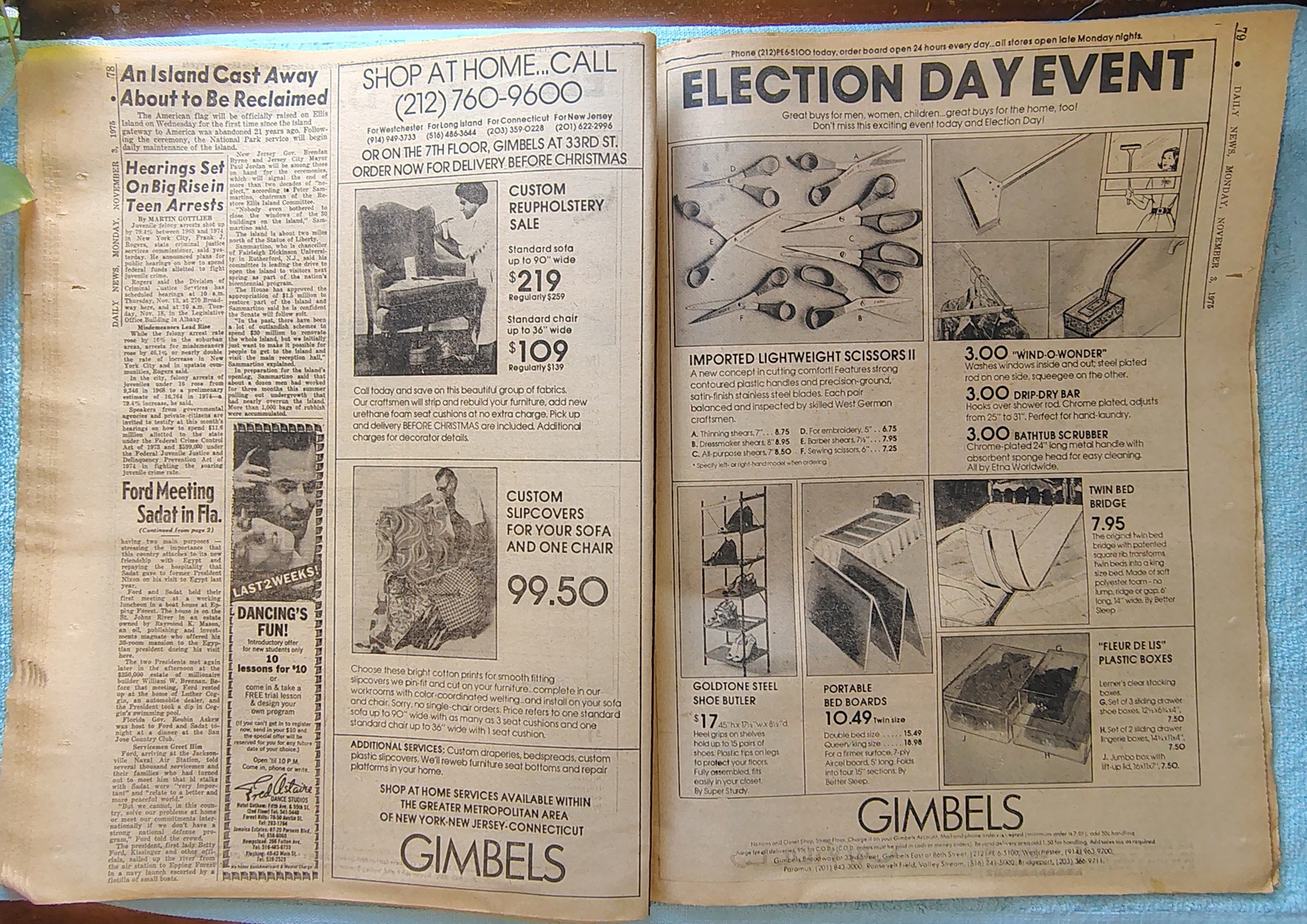New York Daily News (New Jersey Edition) Monday, November 3, 1975. This old newspaper features on the front page a picture of President Ford shaking hands in Jacksonville Naval Air Station on a trip to meet with Egyptian President Anwar Sadat. The headlines include: ‘Defense Chief Fired By Ford’ ‘Clergy Split on Karen’s Fate’ ‘Nurses End Jersey City Sickout’ ‘Showdown for Byrne & Bonds’ What you see in the pictures is what you get.