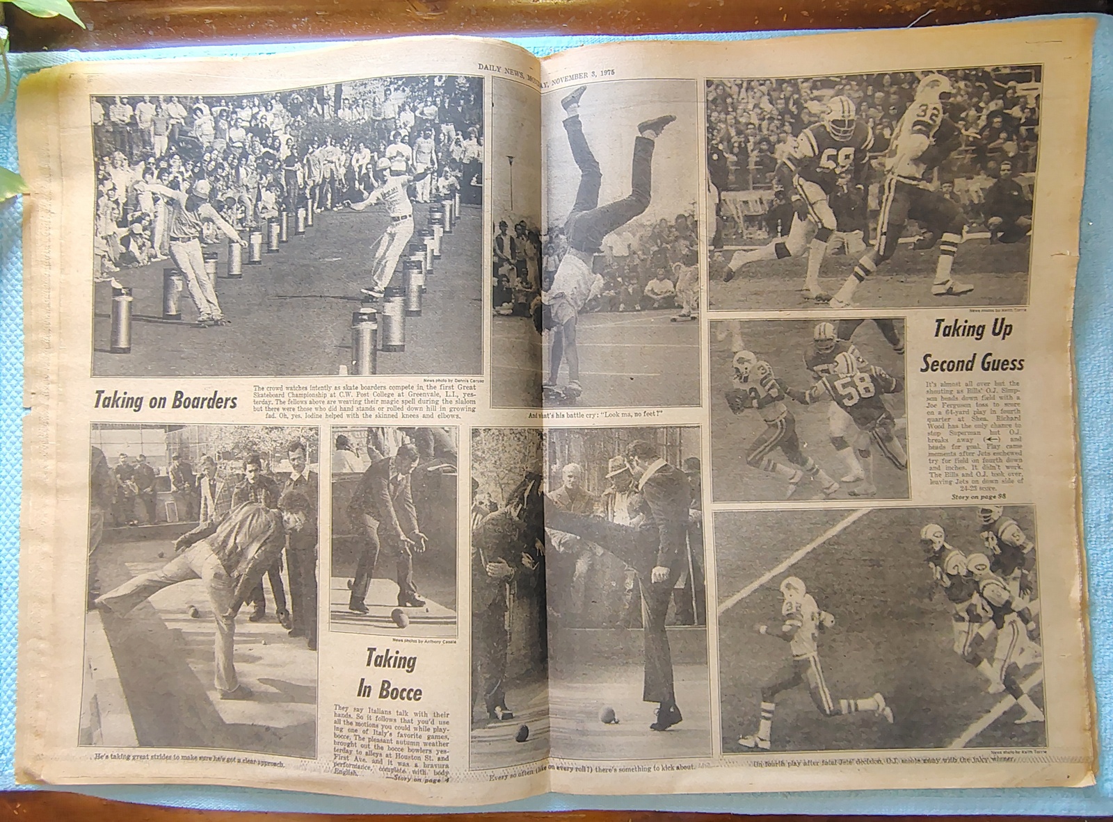 - The centerfold has pictures of OJ Simpson in professional football action, The first Great Skateboard Championship and folks bowling bocce.