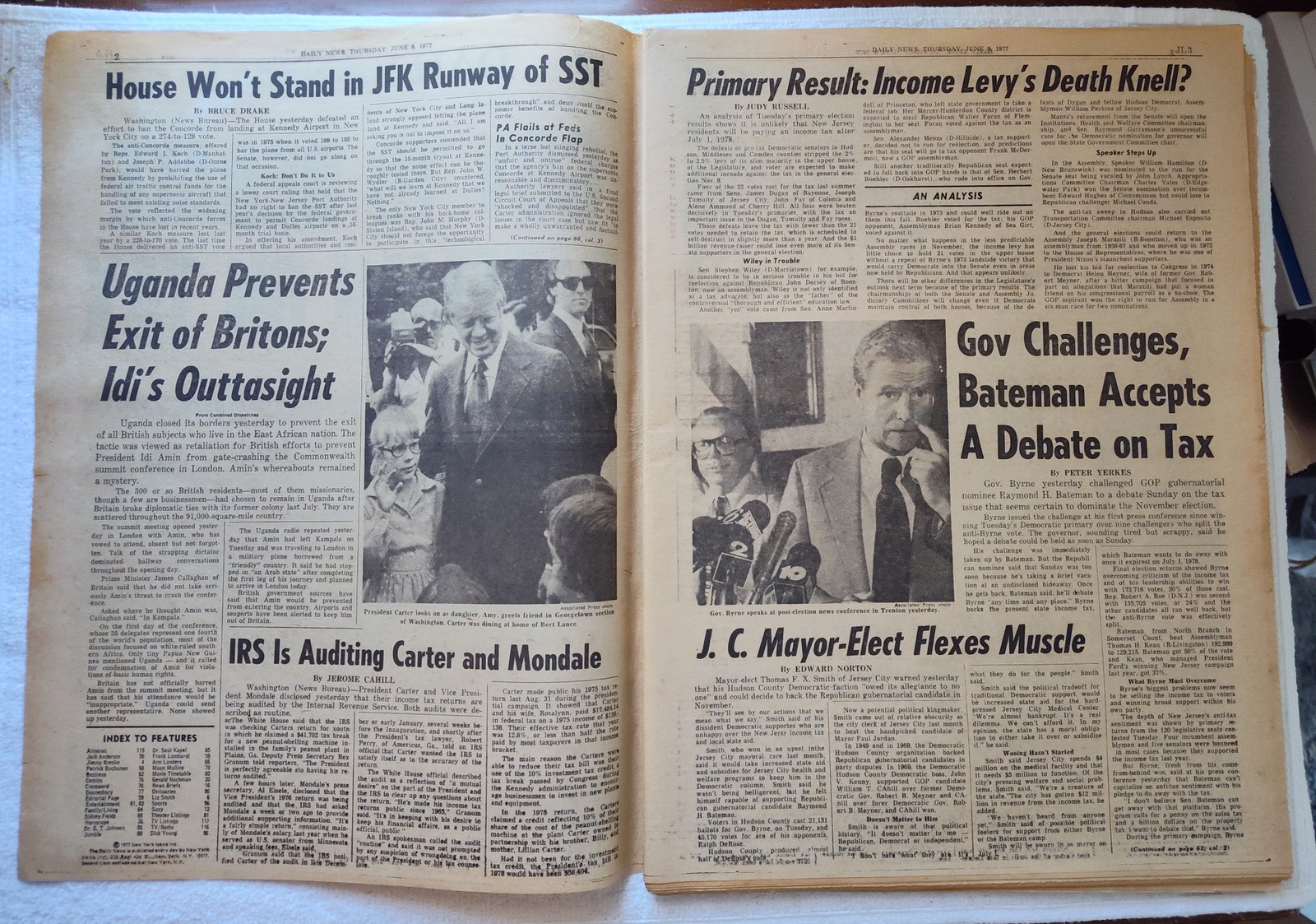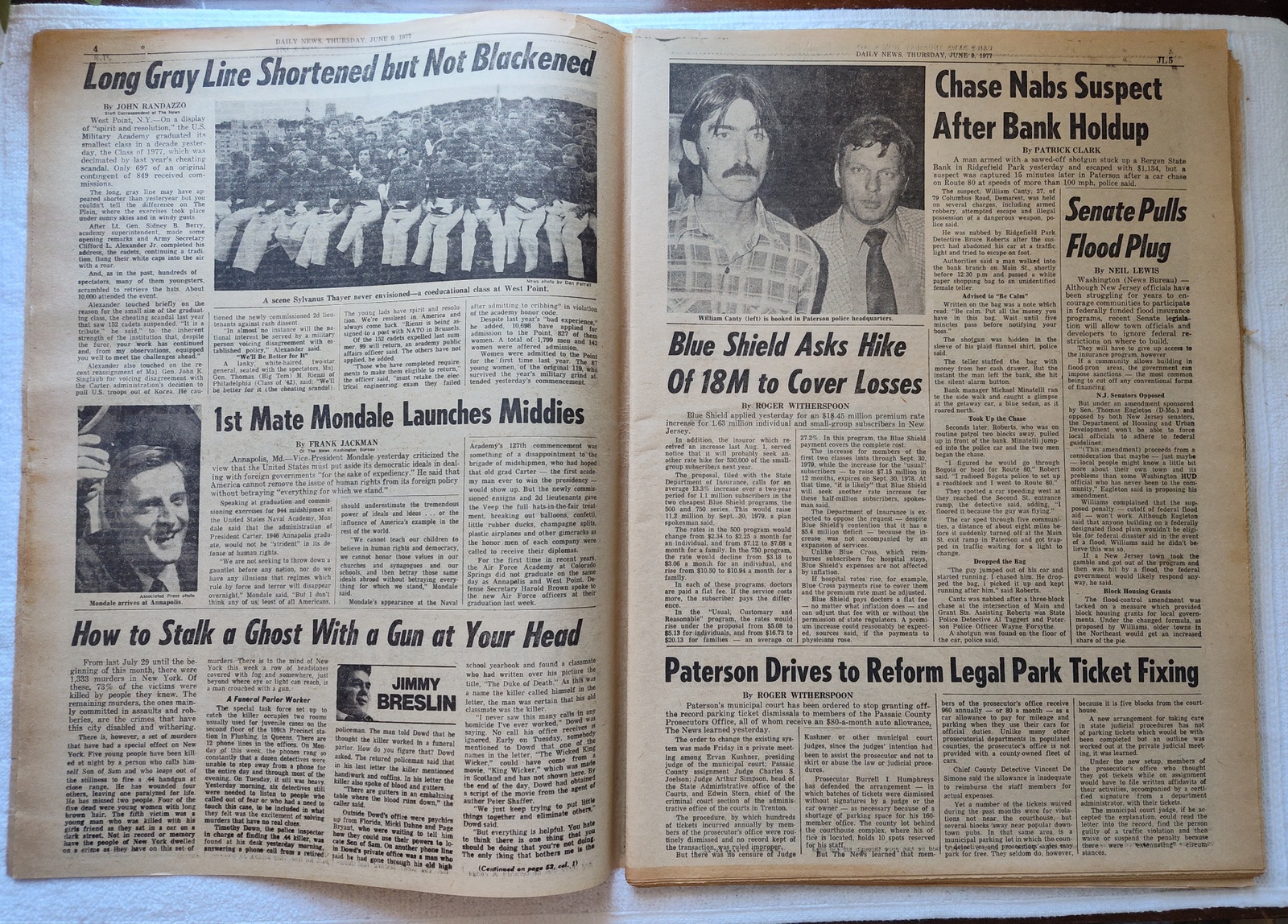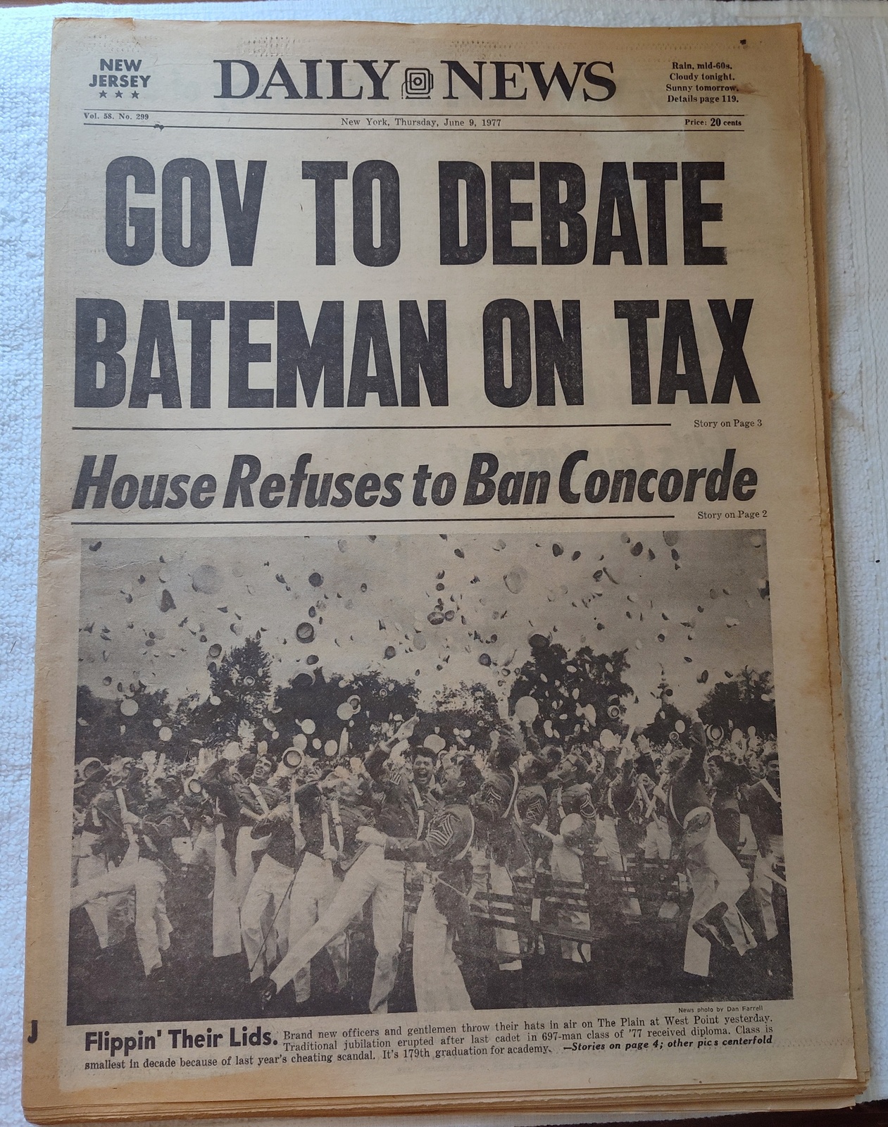 New York Daily News (New Jersey Edition) – Thursday, June 9, 1977. This old newspaper features on the front page a picture of the graduating class from West Point. The headline reads: ‘Gov To Debate Bateman on Tax’ & ‘House Refuses to Ban Concorde’ – LOOK AT THE PICTURES! What you see in the pictures is what you get.