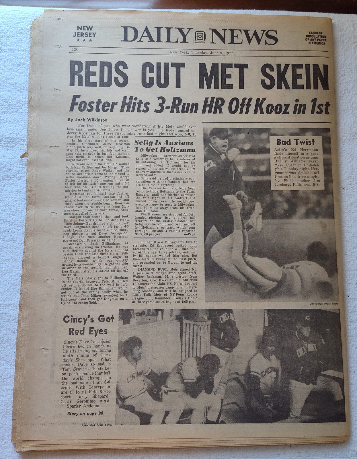 - The back page has a picture of the Astro’s Ed Herrmann being called out and Cincinnati’s dejected Dave Concepcion, Pete Rose, Larry Shepard, Cesar Geronimo, and Sparky Anderson – they’re upset about Tom Seaver’s 10-strikeout performance against them.