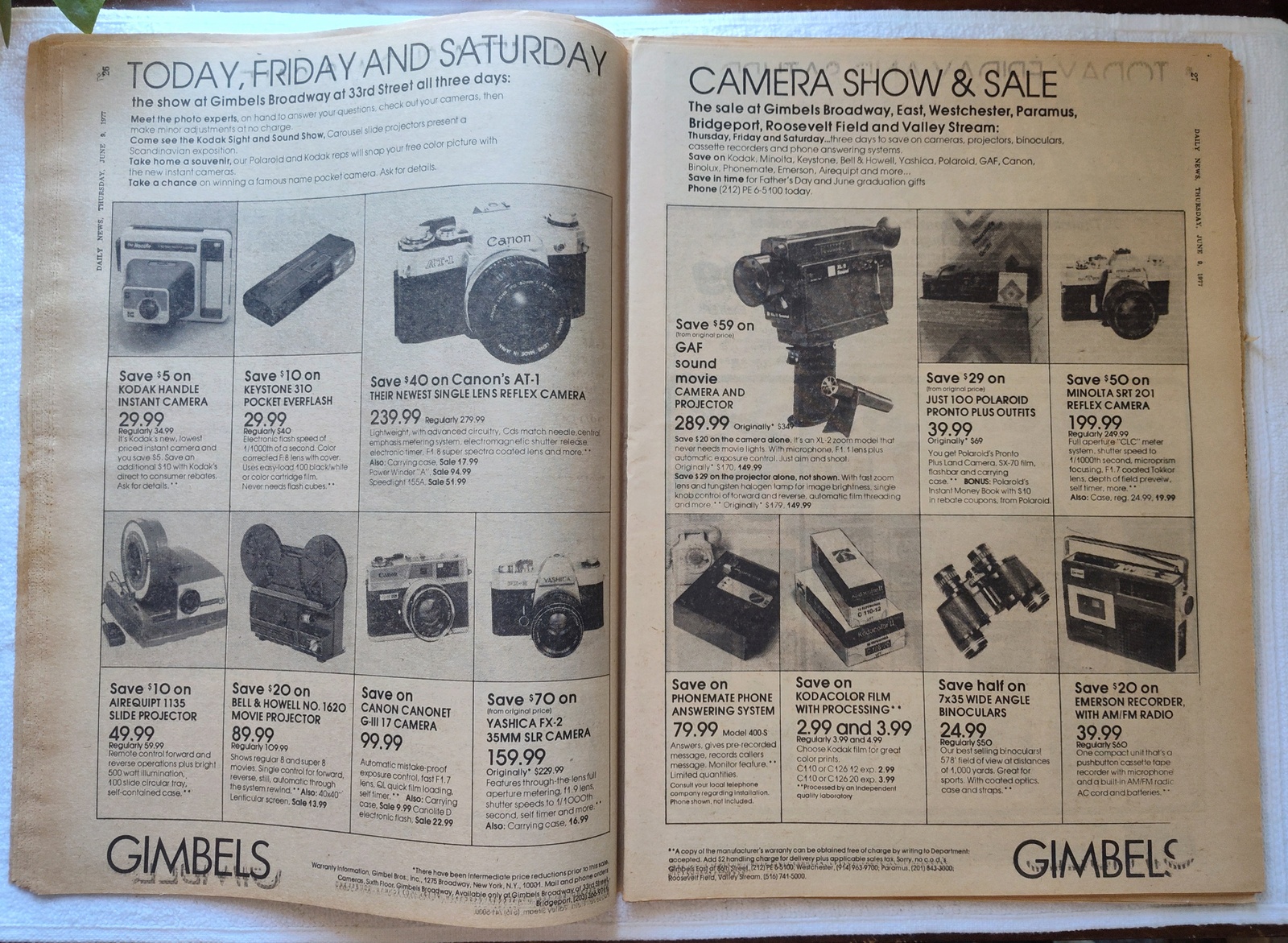 - Two full page ads for Gimbels’ Camera Show and Sale