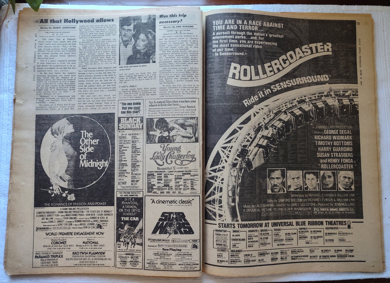 - There are movie ads for Star Wars, A full page for Rollercoaster, Annie Hall, Rocky, The Sting, Airport ’77 and More