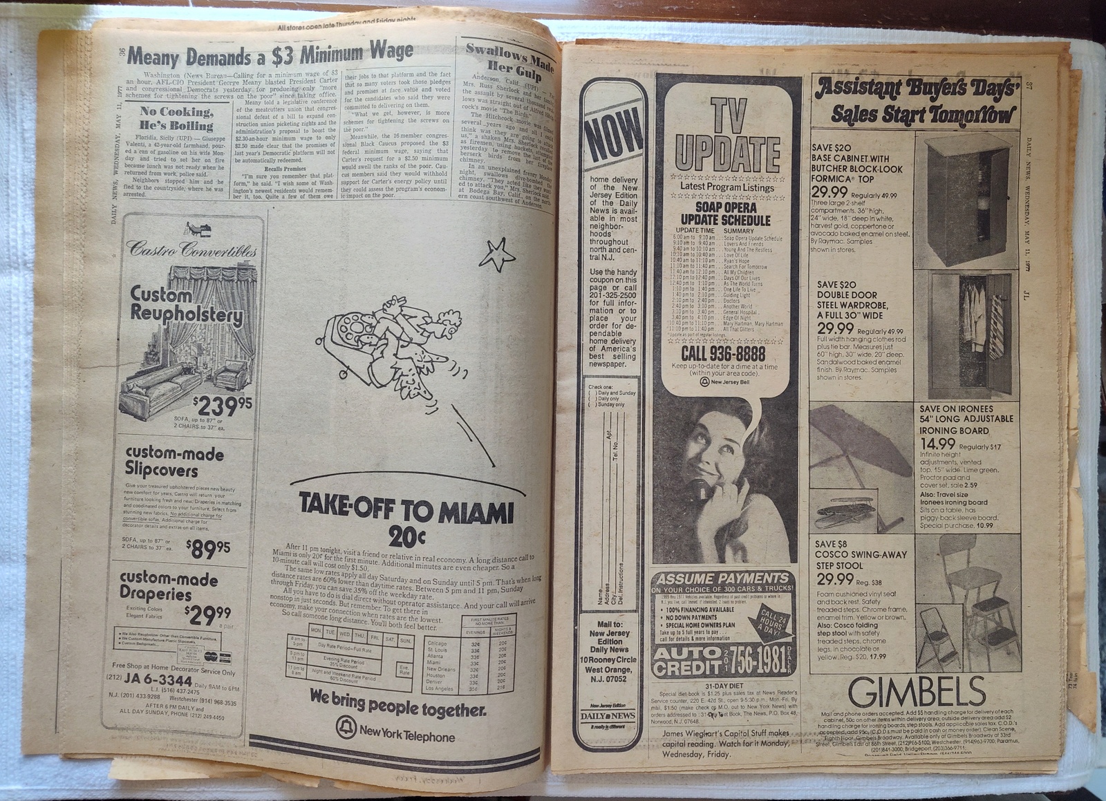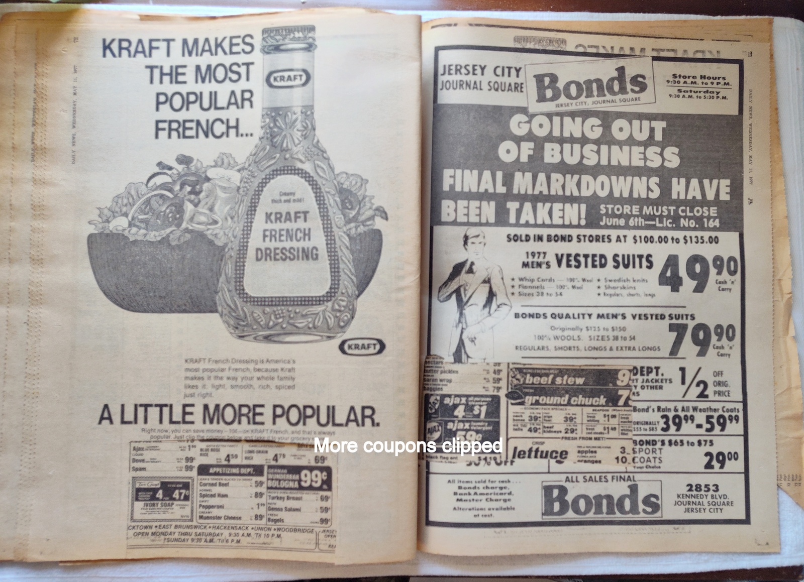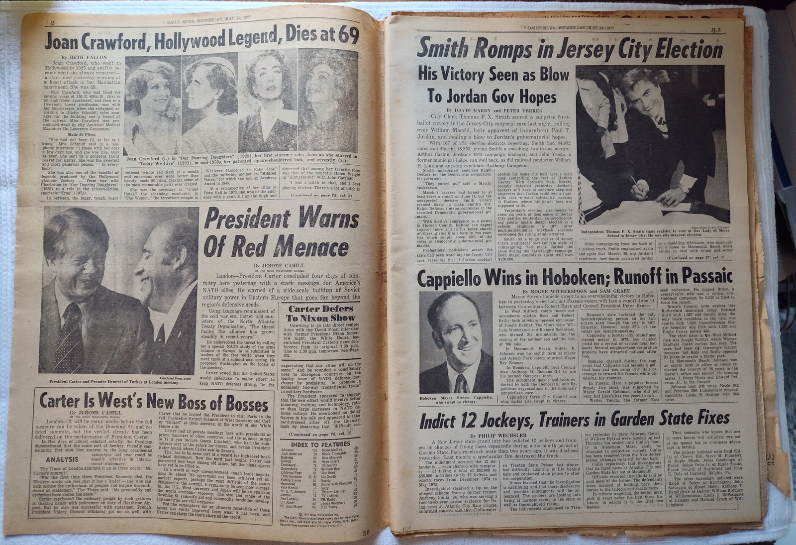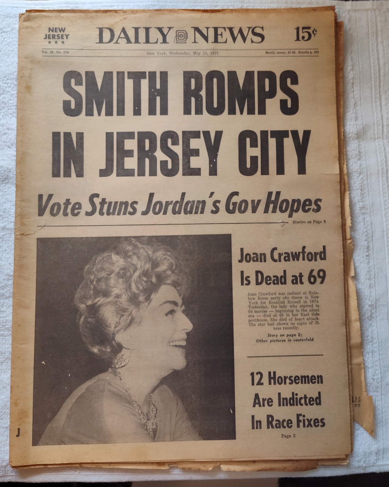 New York Daily News (New Jersey Edition) – Wednesday, May 11, 1977. This old newspaper features on the front page a picture of recently deceased movie actress Joan Crawford. There is a small tear on the front near the work ‘Vote’ and minor wear and tear around the edges. Several of the coupons have been clipped – LOOK AT THE PICTURES! What you see in the pictures is what you get.