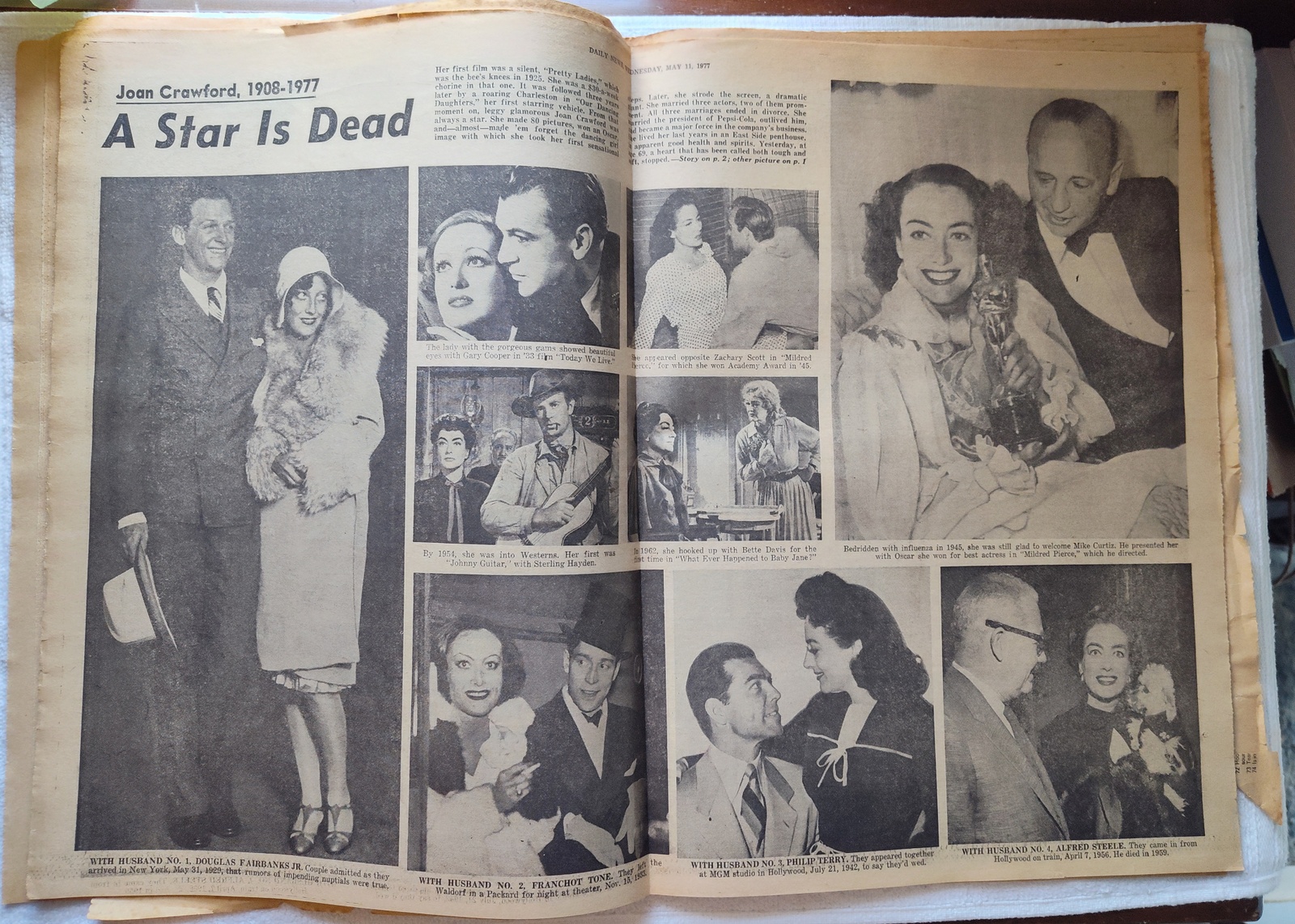 - The centerfold has pictures of Joan Crawford, including pictures of her with husbands #1, 2, 3, & 4.