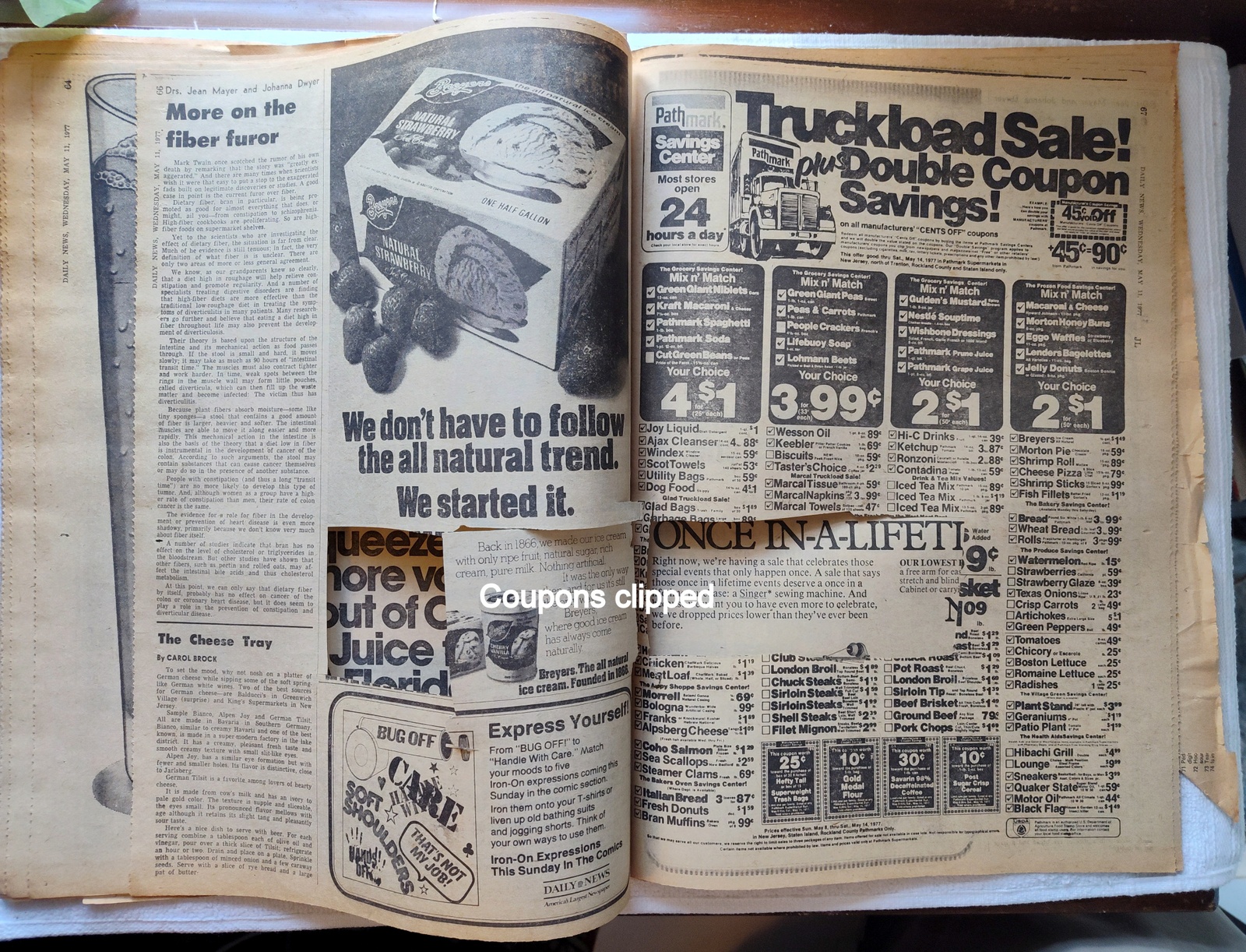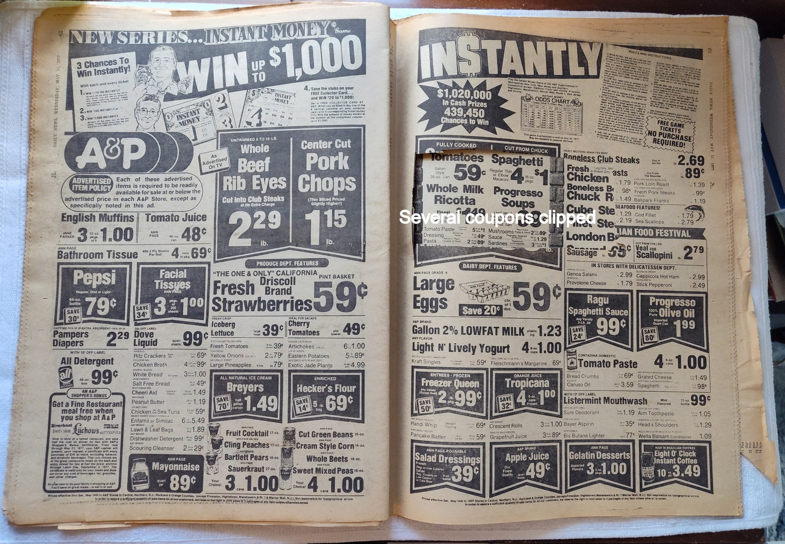Decent used condition for 40+ year old newspaper! There is a small tear on the front page – SEE PICTURES! And some minor wear around the edges – LOOK AT THE PICTURES! The newspaper has also had several of the coupons clipped – LOOK AT THE PICTURES!