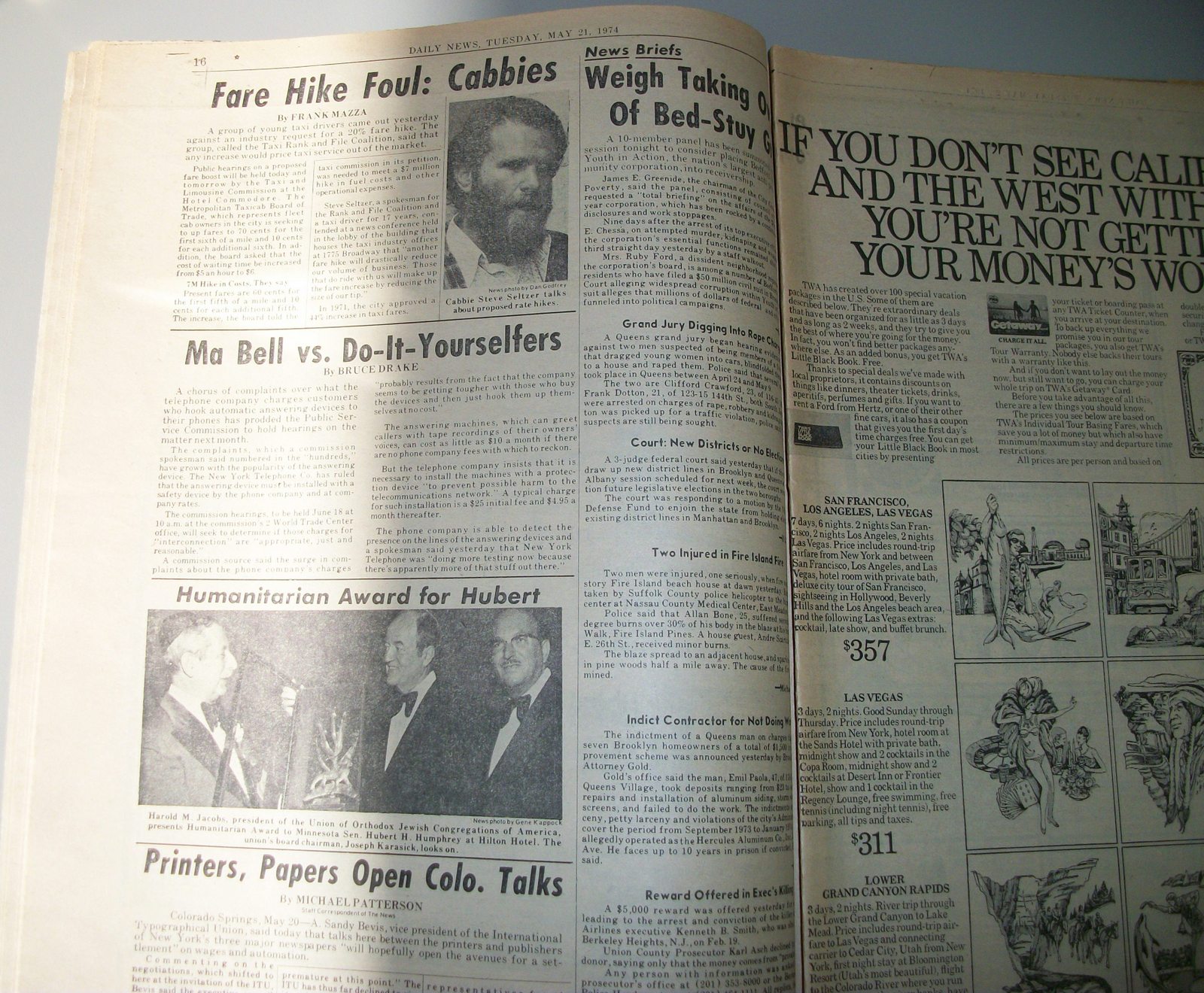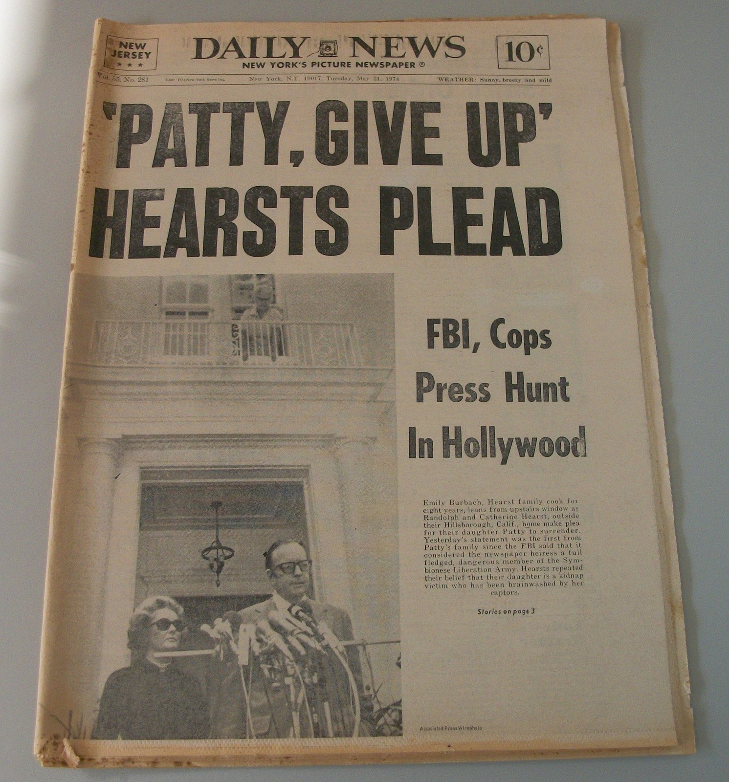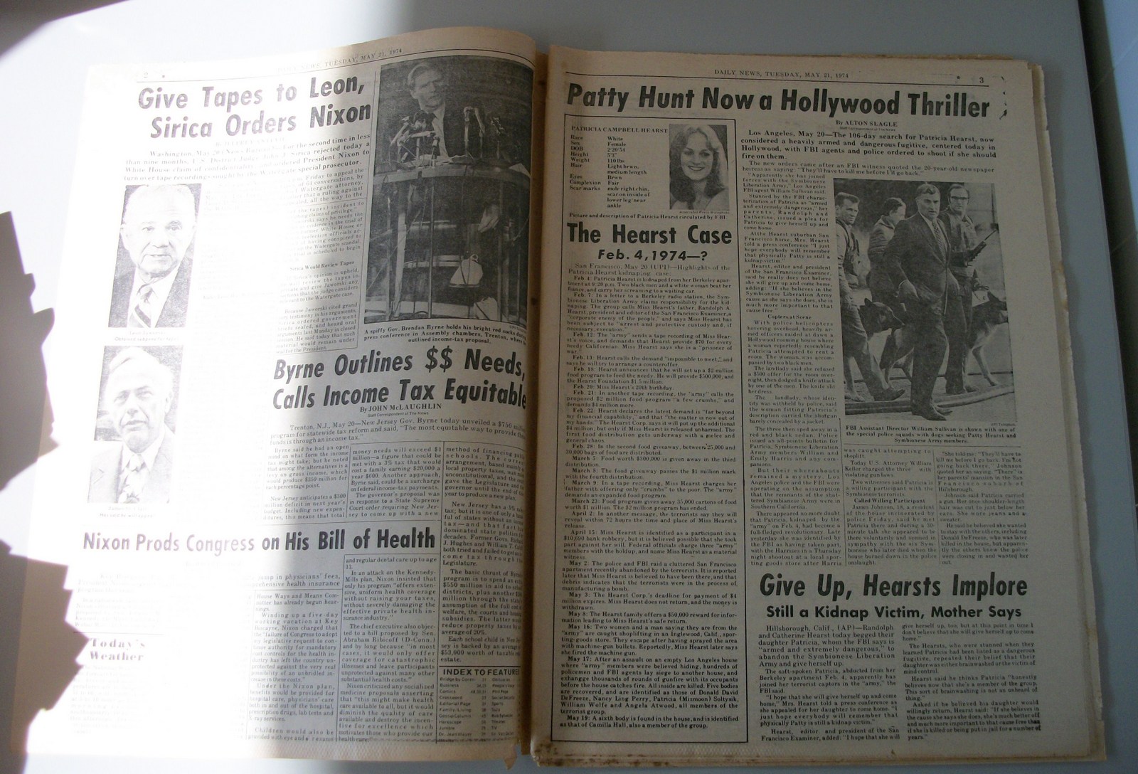 New York (New Jersey edition) Daily News – Tuesday May 21, 1974 Headlines include: ‘Patty, Give Up’ Hearsts Plead, FBI, Cops Press Hunt In Hollywood. What you see in the pictures is what you get.