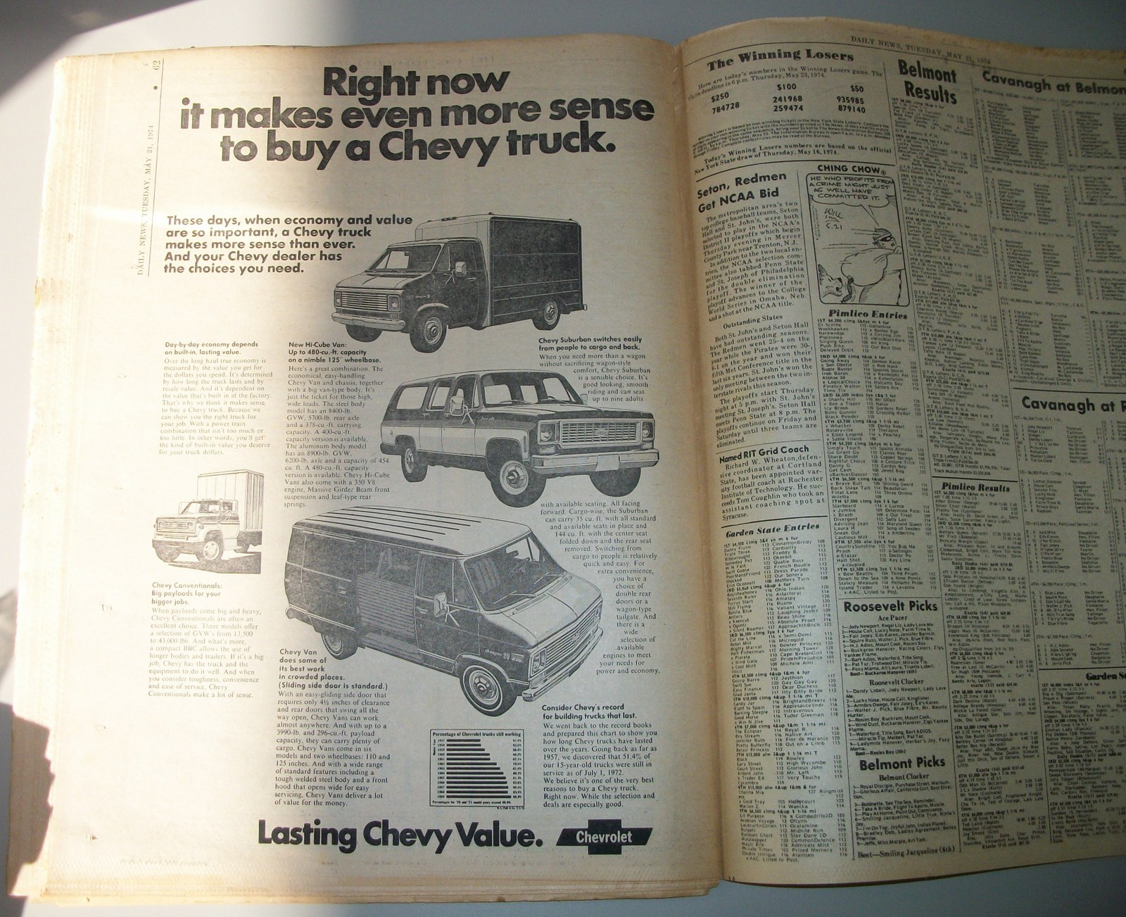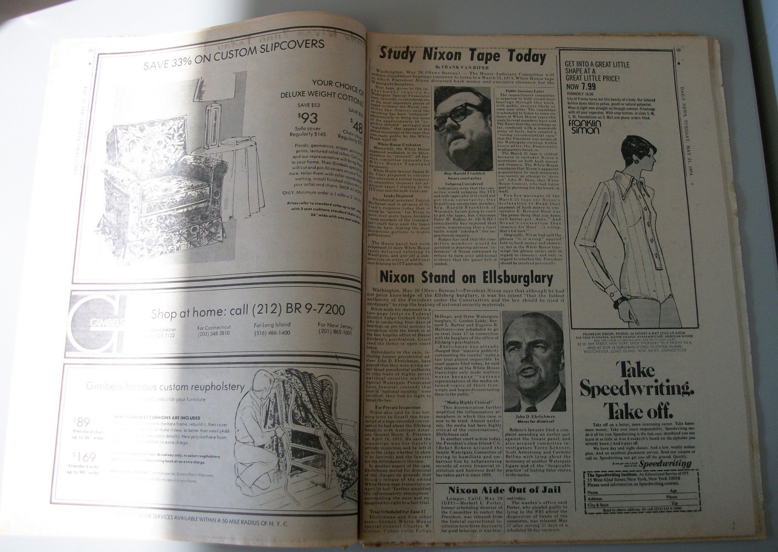 Up for sale is a very interesting old newspaper. There are articles about Patty Hearst, Judge Sirica ordering President Nixon to turn over tape recordings to the Watergate Special Prosecutor. There is an article about a gas station owner who has to sell gas by the half gallon because the pumps will not work for prices over 50 cents! Under the sports section, there is coverage of Bob Gibson, Thurman Munson, and more. There is a full page ad for Chevy Trucks (and vans). This is in fairly good condition with some discoloration and wear around the edges – please examine the pictures.