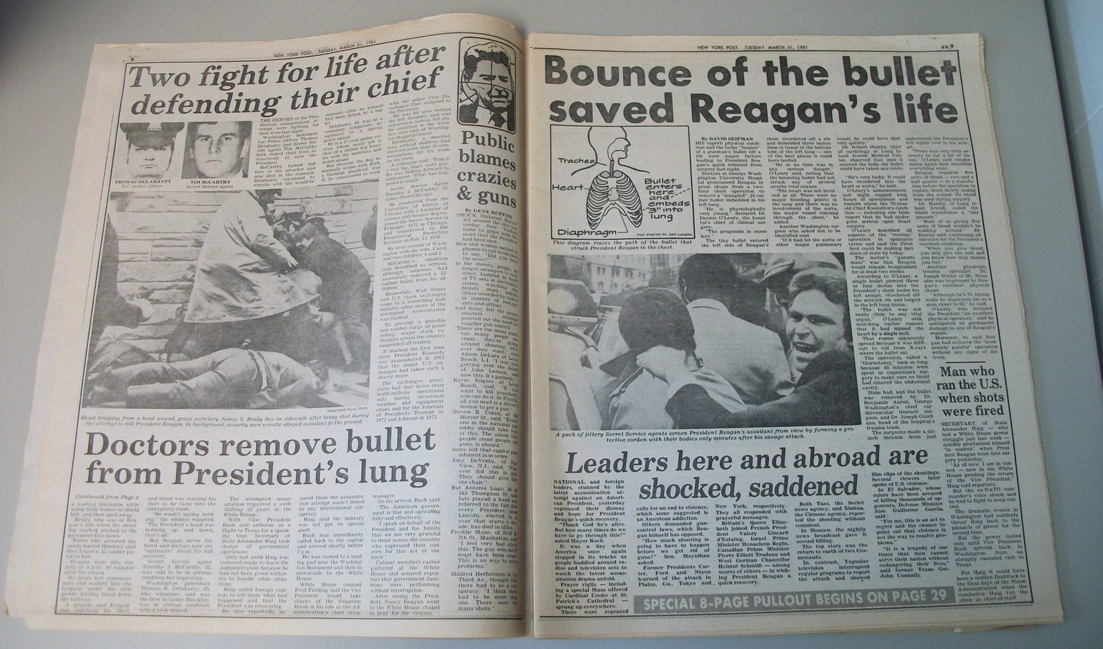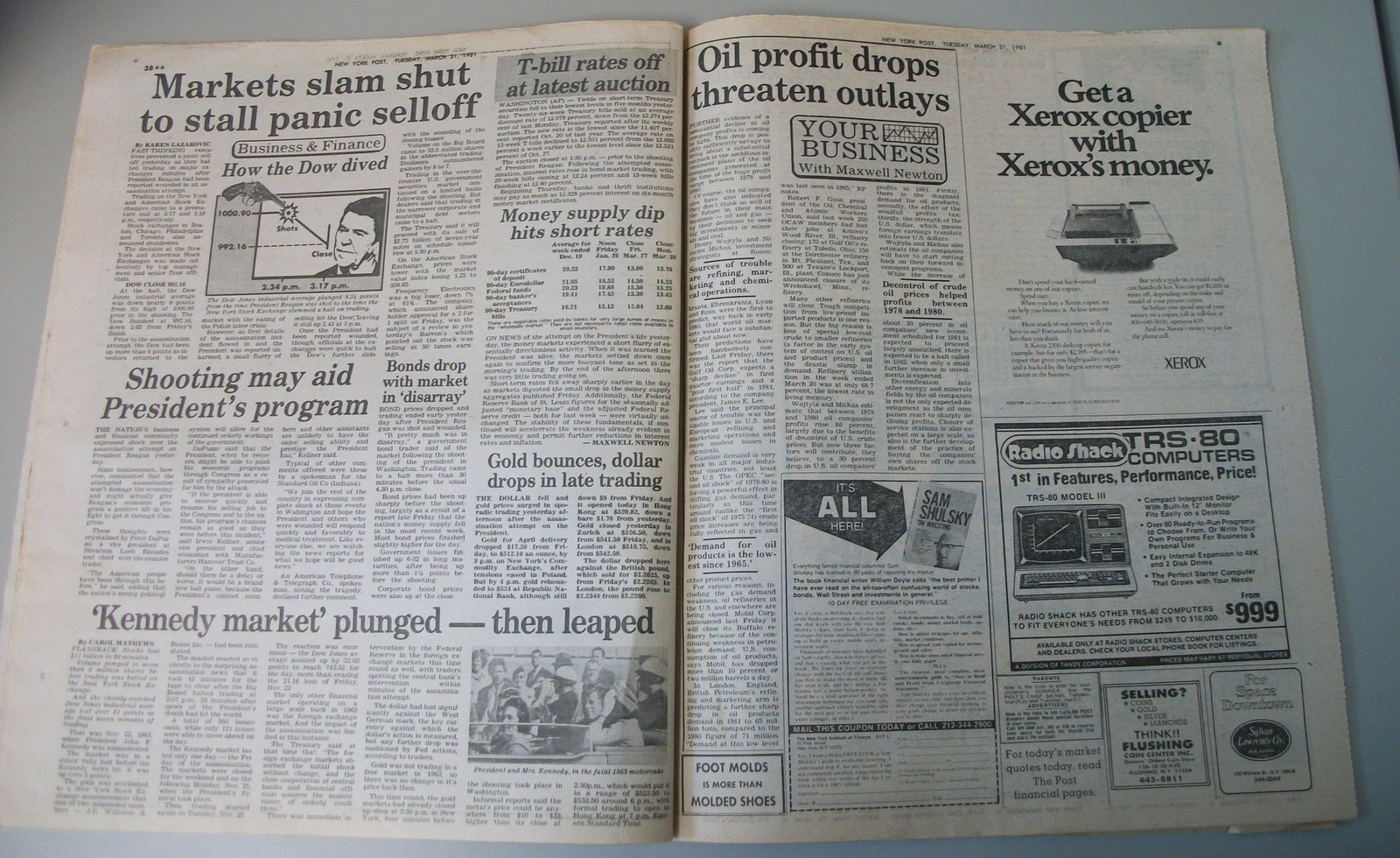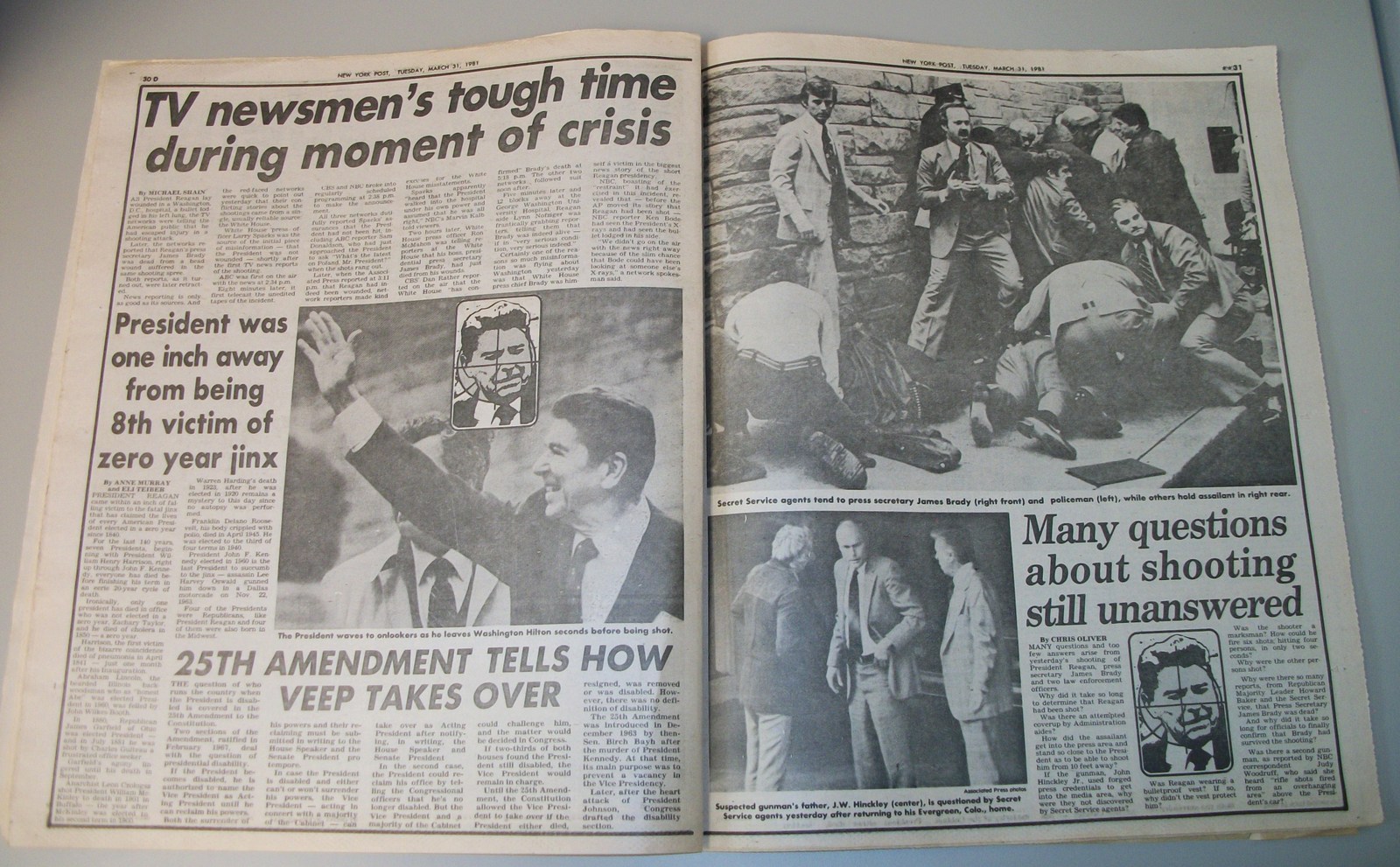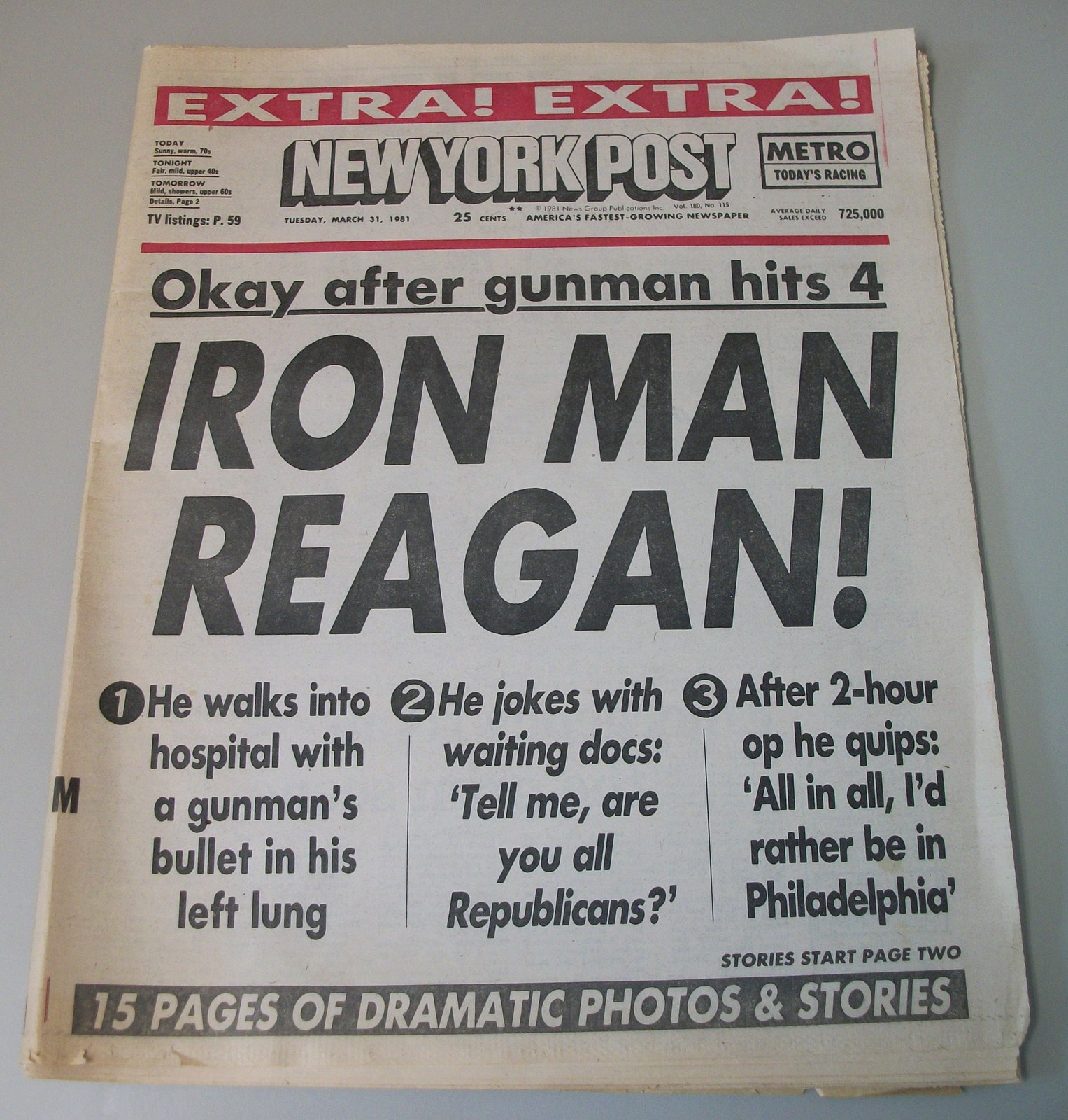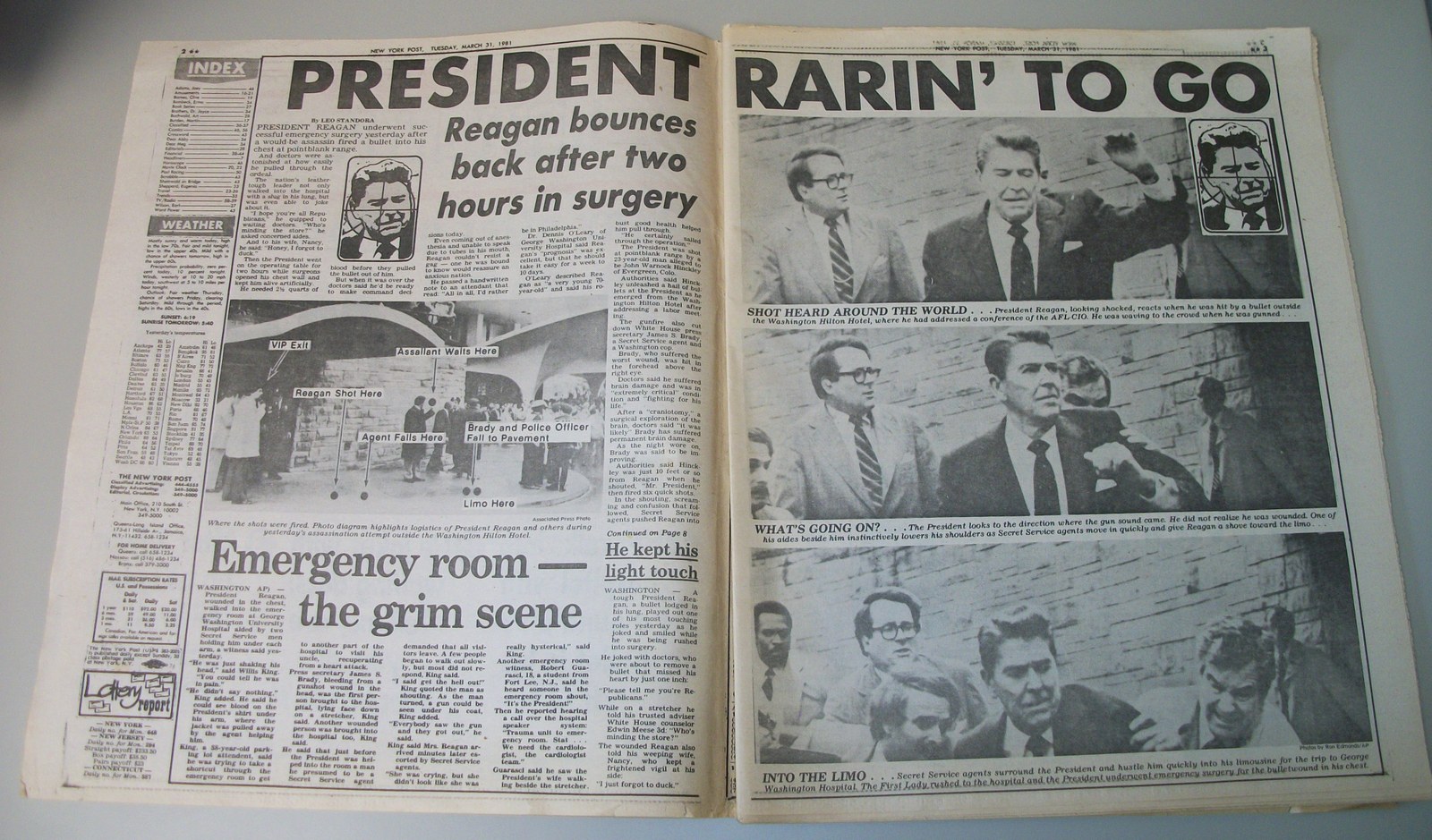 New York Post – Tuesday, March 31, 1981 What you see in the pictures is what you get: all 60 pages are included. This is a very interesting old newspaper which features as the front page story coverage of the assassination attempt on newly inaugurated President Reagan.
