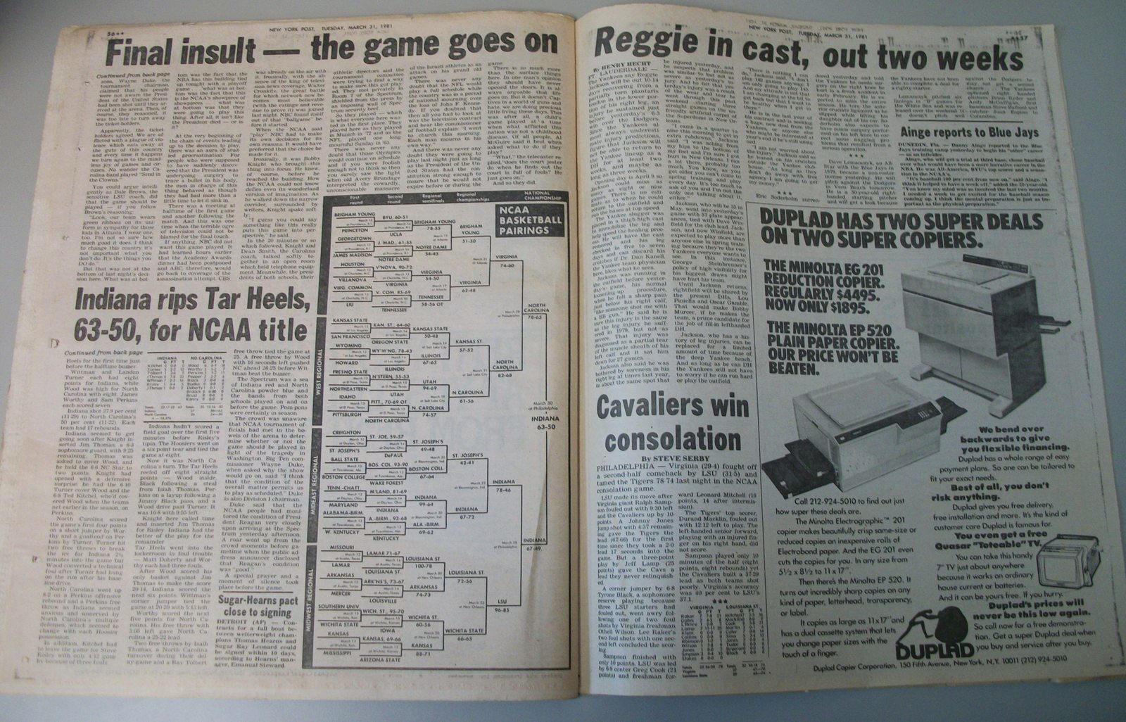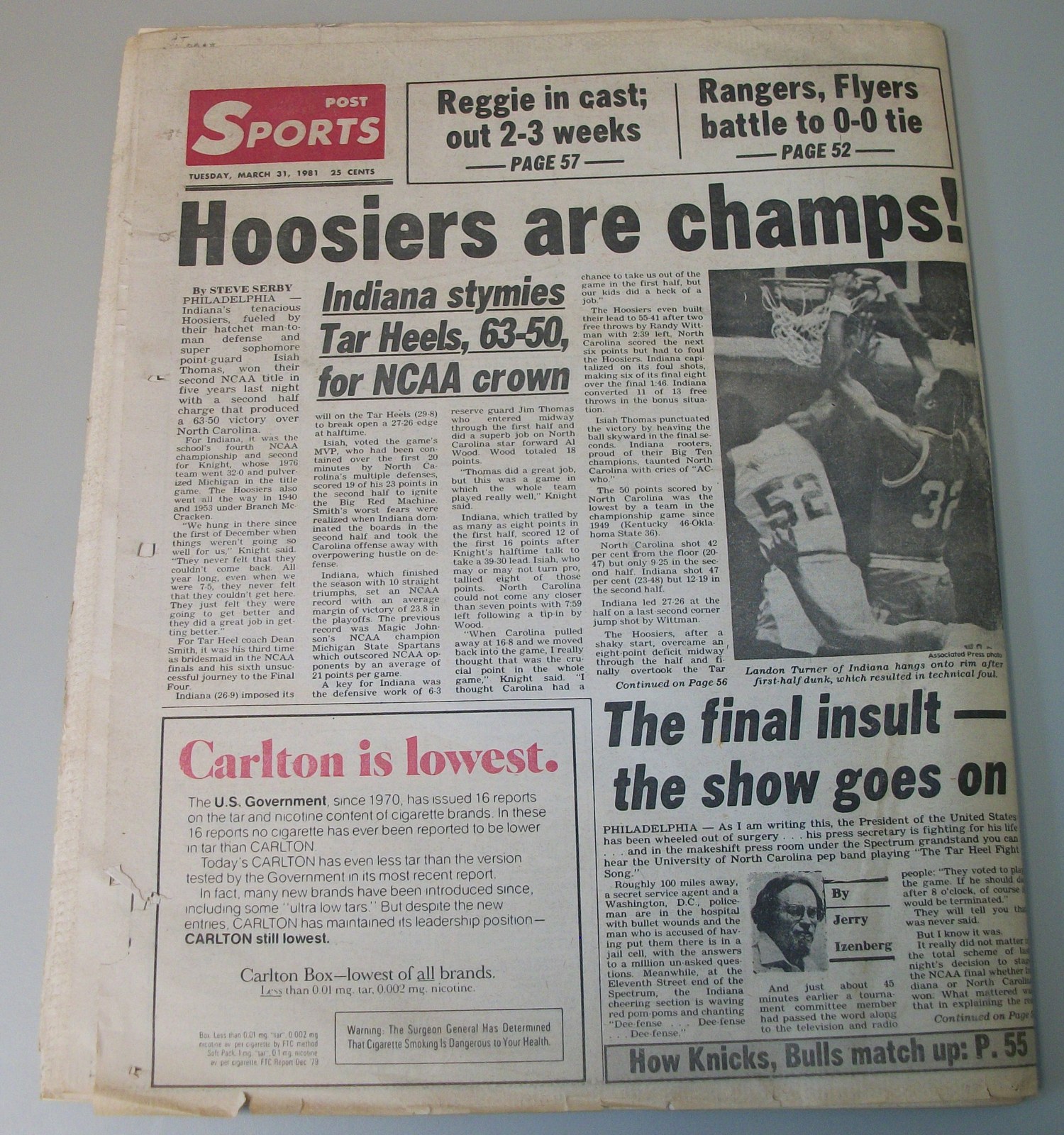 - “Hoosiers are champs” – “Indiana stymies Tar Heels, 63-50 for NCAA crown”