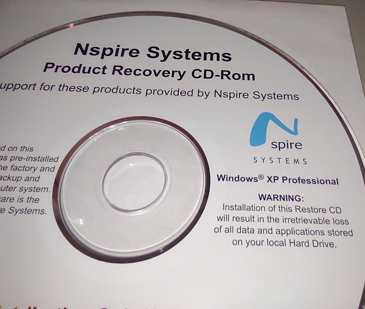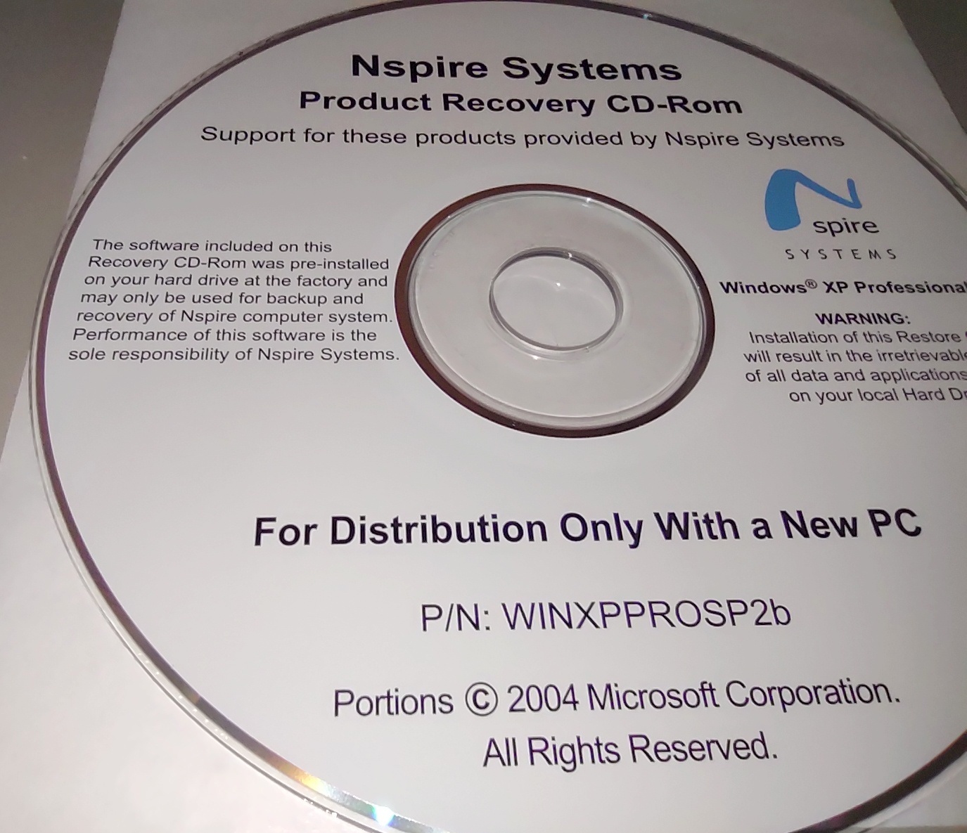 Up for sale is a used Nspire Systems Product Recovery CD-ROM from 2006 / 2004. This is for recovering the Windows XP Professional operating system to your Nspire branded computer from about 2006. The date on the front of the disc is 2004, but the directories created on the disc are dated 2006. We ran the disc on our Windows 10 machine and it seemed to run just fine, but we don’t have an older Nspire computer available to test it properly.