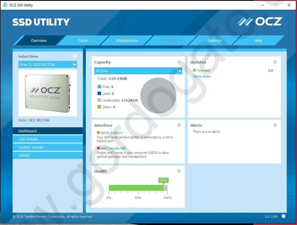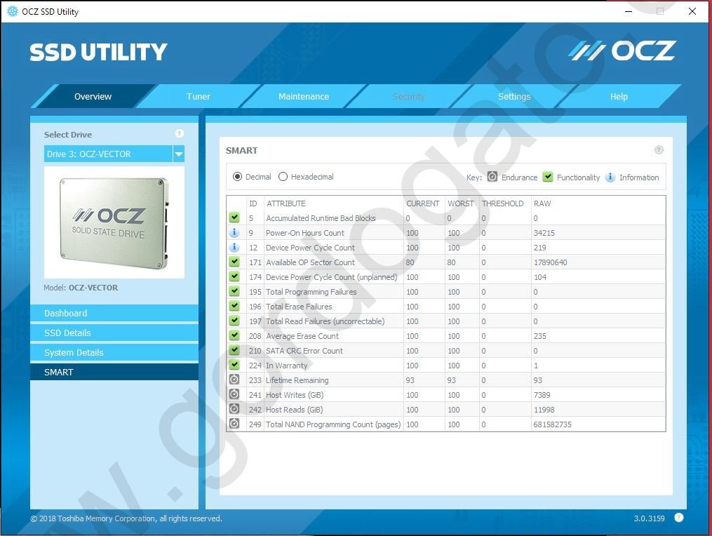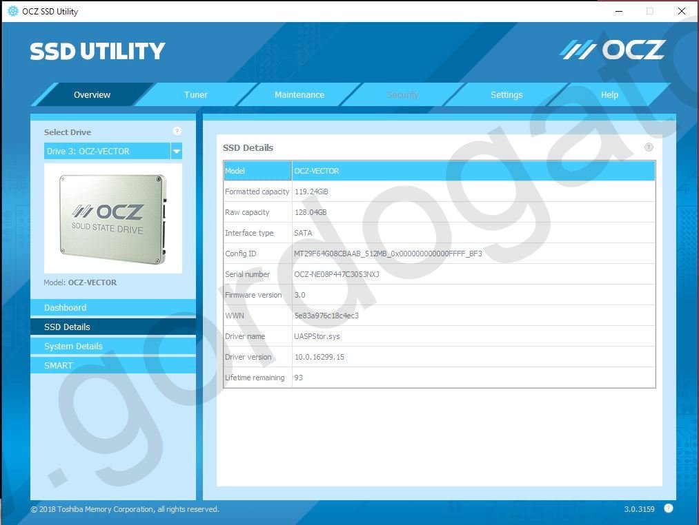 Up for sale is an OCZ Vector 128GB SSD – we put this drive into service in September of 2013 and just retired it in Spring of 2018 when we upgraded to a larger capacity SSD. It has been wiped with OCZ’s SSD Utility and the utility reports 93% life remaining. It has firmware 3.0 which the utility reports as current. Also included is the original ‘I
