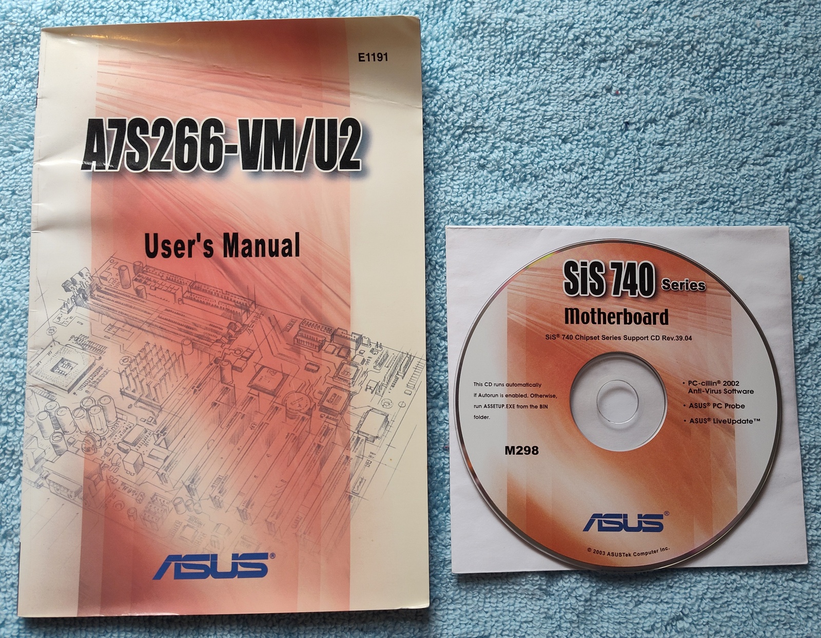 Up for sale is the original manual & driver CD disc for an Asus A7S266-VM/U2 motherboard from 2003. This is in good used condition with some wear and creasing – please examine the pictures! What you see in the pictures is what you get! Most of the drivers seem to be for Windows XP, 98 & 95, 2000, ME. We tried to run the CD in Windows 11, but it would not run – you need an older operating system!