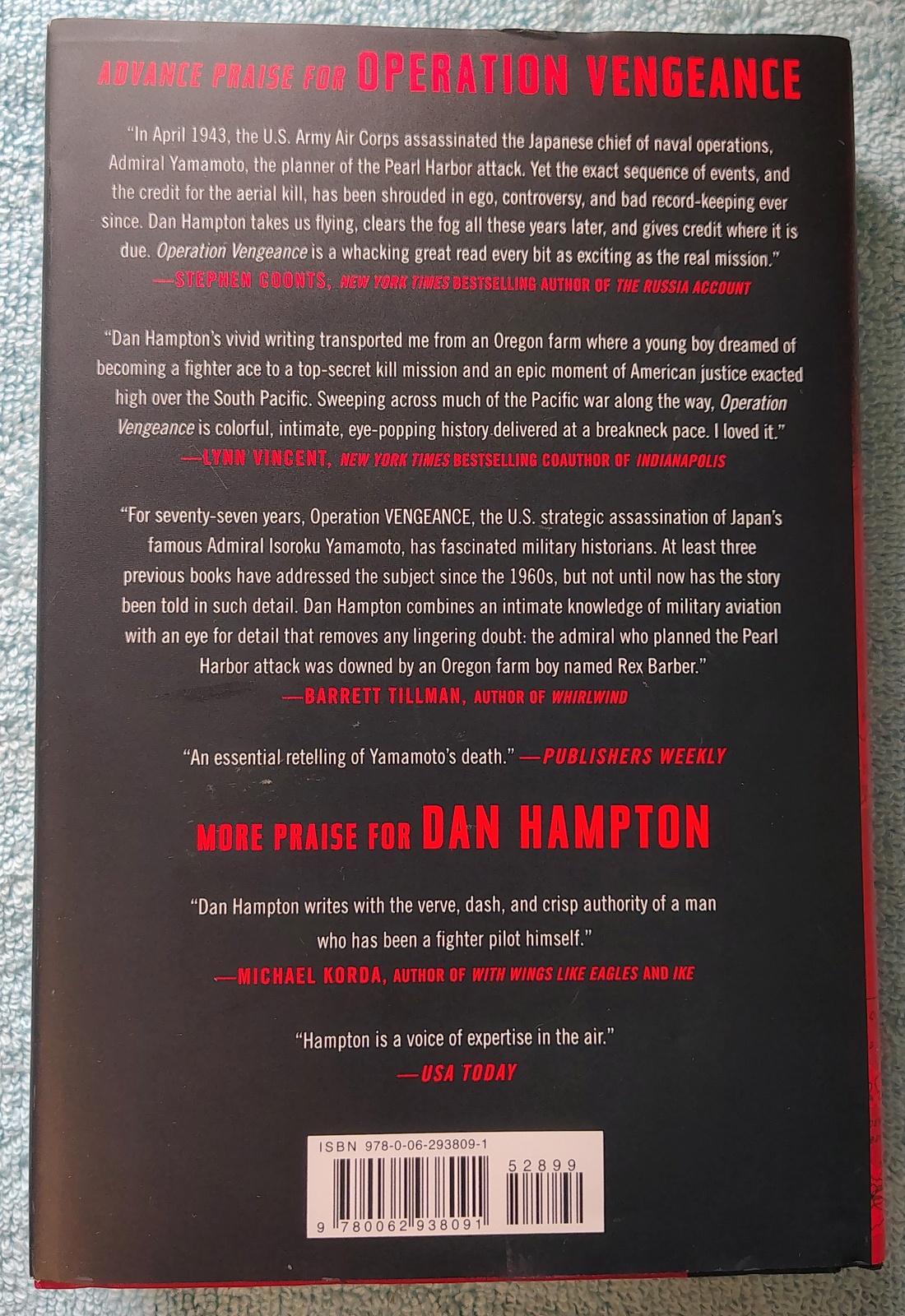 Up for sale is a hardcover book: Operation Vengeance by Dan Hampton . This is in excellent used condition with very minor wear on the dust cover. Examine the pictures BEFORE you make your decision to purchase this book! This book tells of the assassination of Japanese admiral Yamamoto by US forces in the Pacific in 1943.