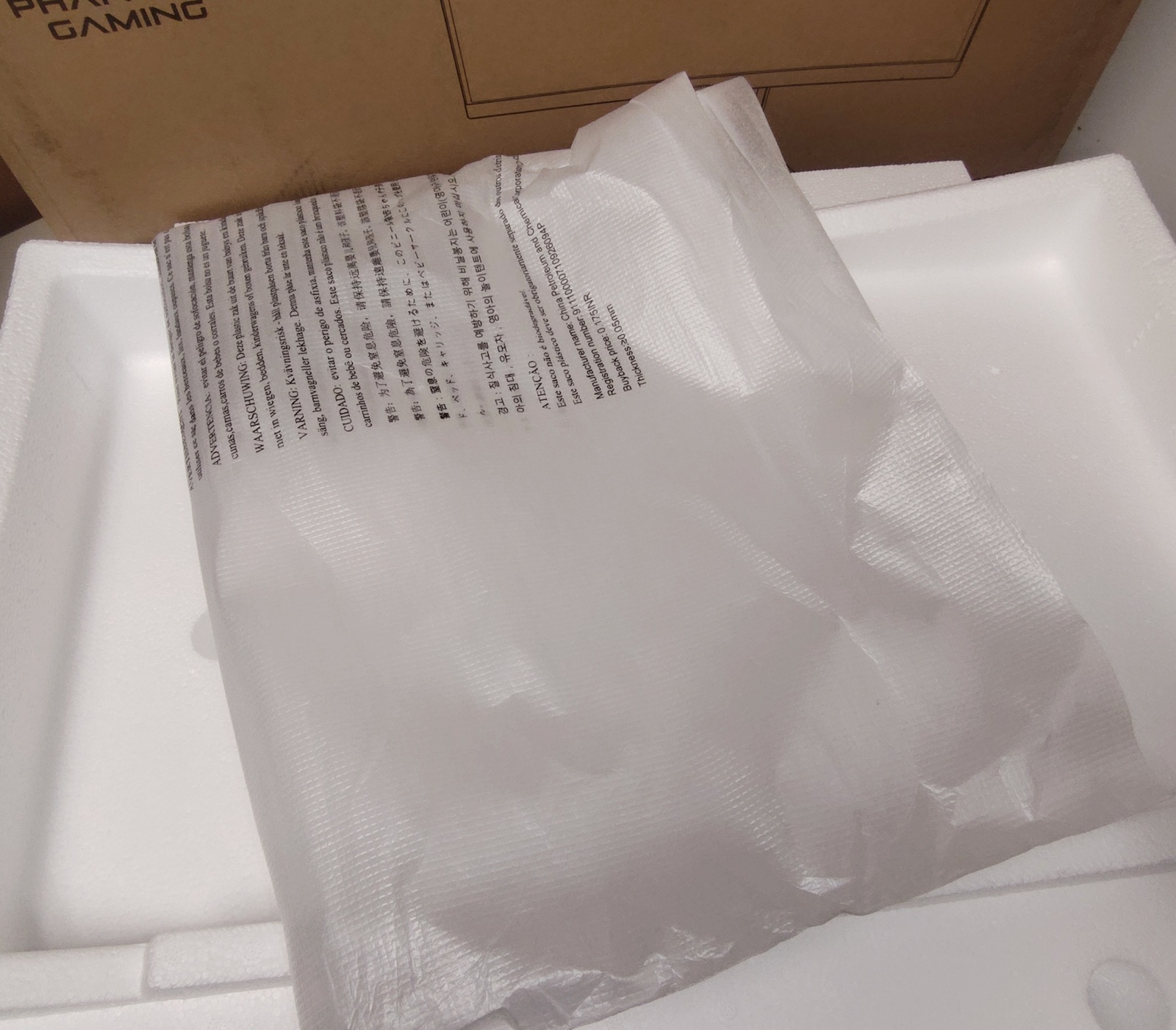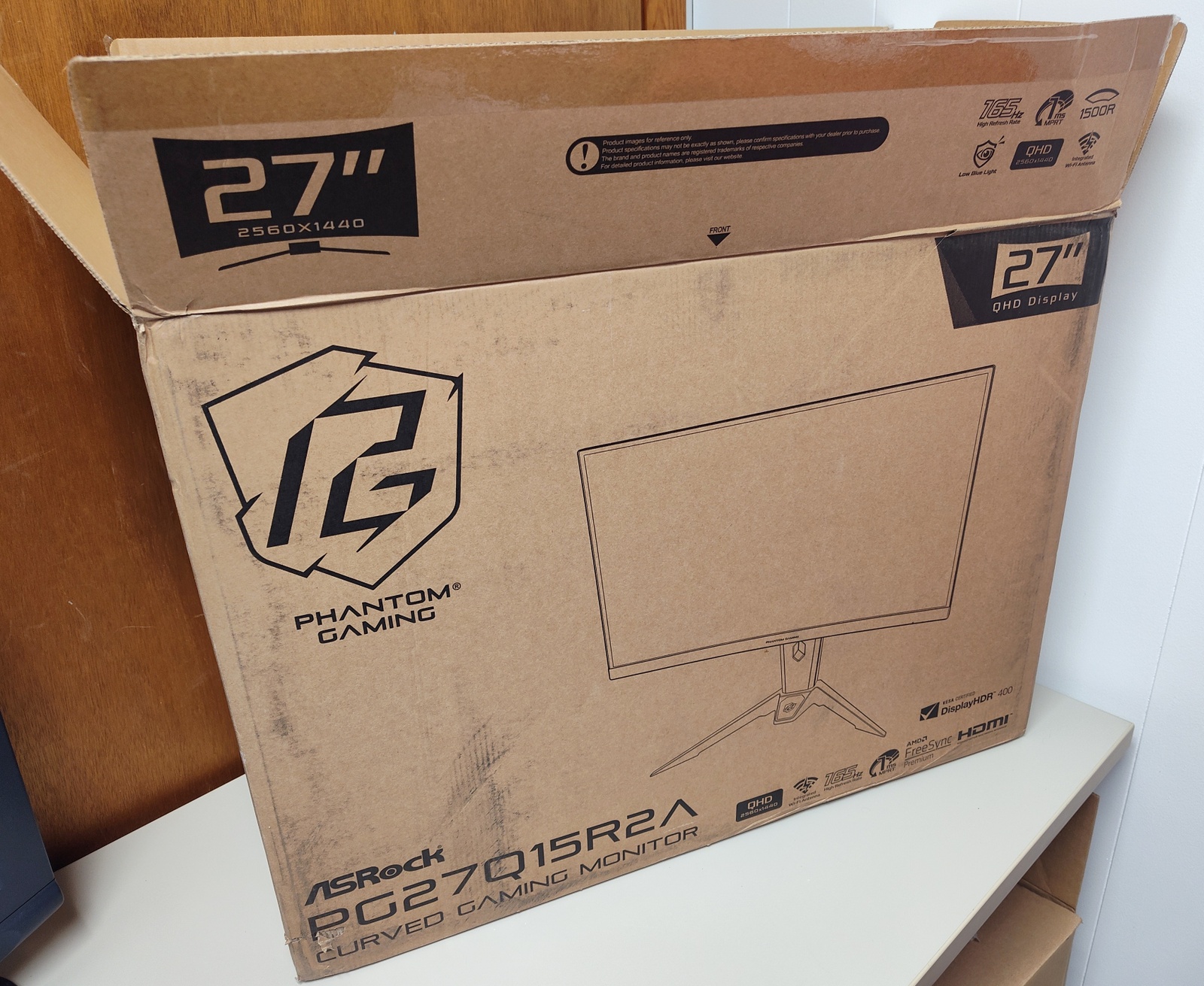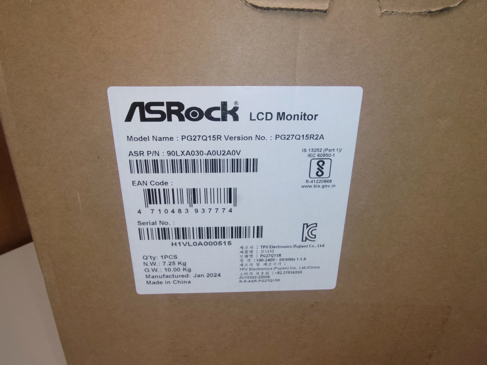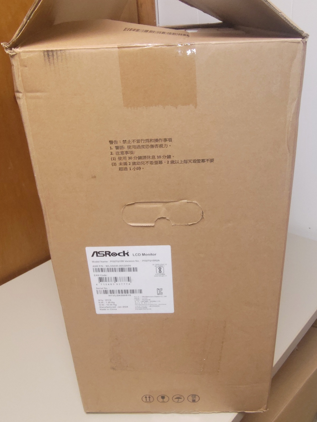 The box was manufactured in China by the Xiamen Hexing Packaging Printing Company., LTD. and from there it made its way to the ASRock monitor factory where it was enlisted to protect an ASRock PG27Q15R2A. After being passed through the gentle caresses of the United Parcel Service, it’s first job was fulfilled – safely transporting the monitor to the United States. Now, it’s looking for further employment transporting your PG27Q15R2A monitor somewhere!