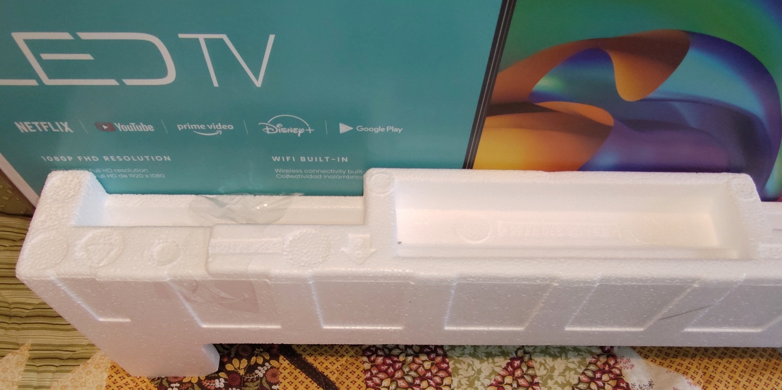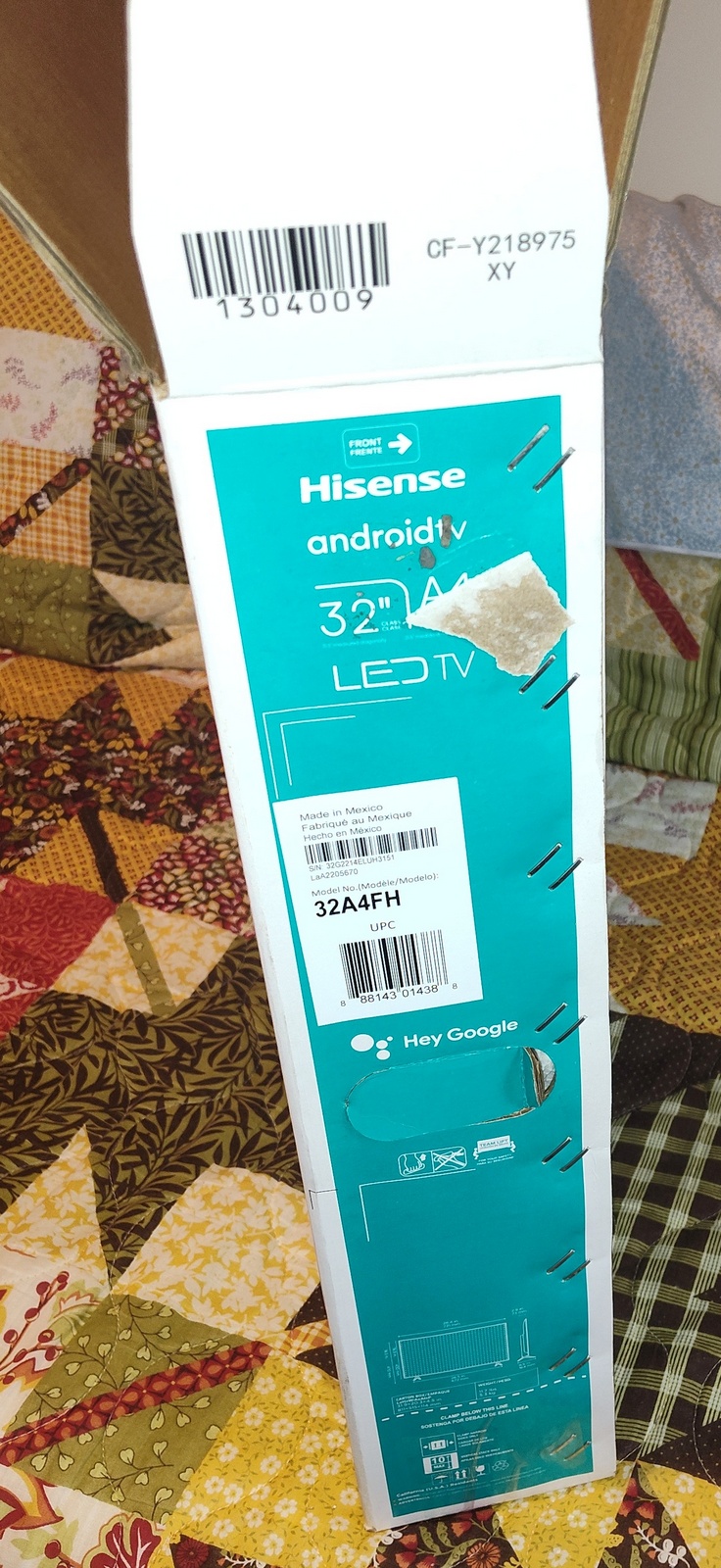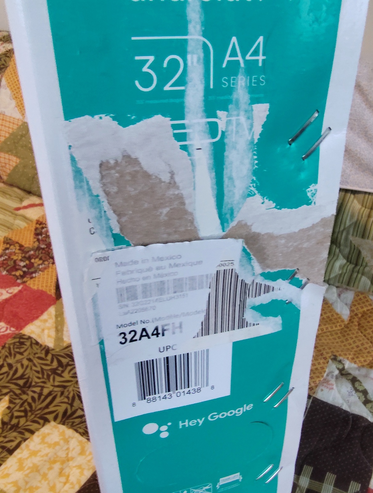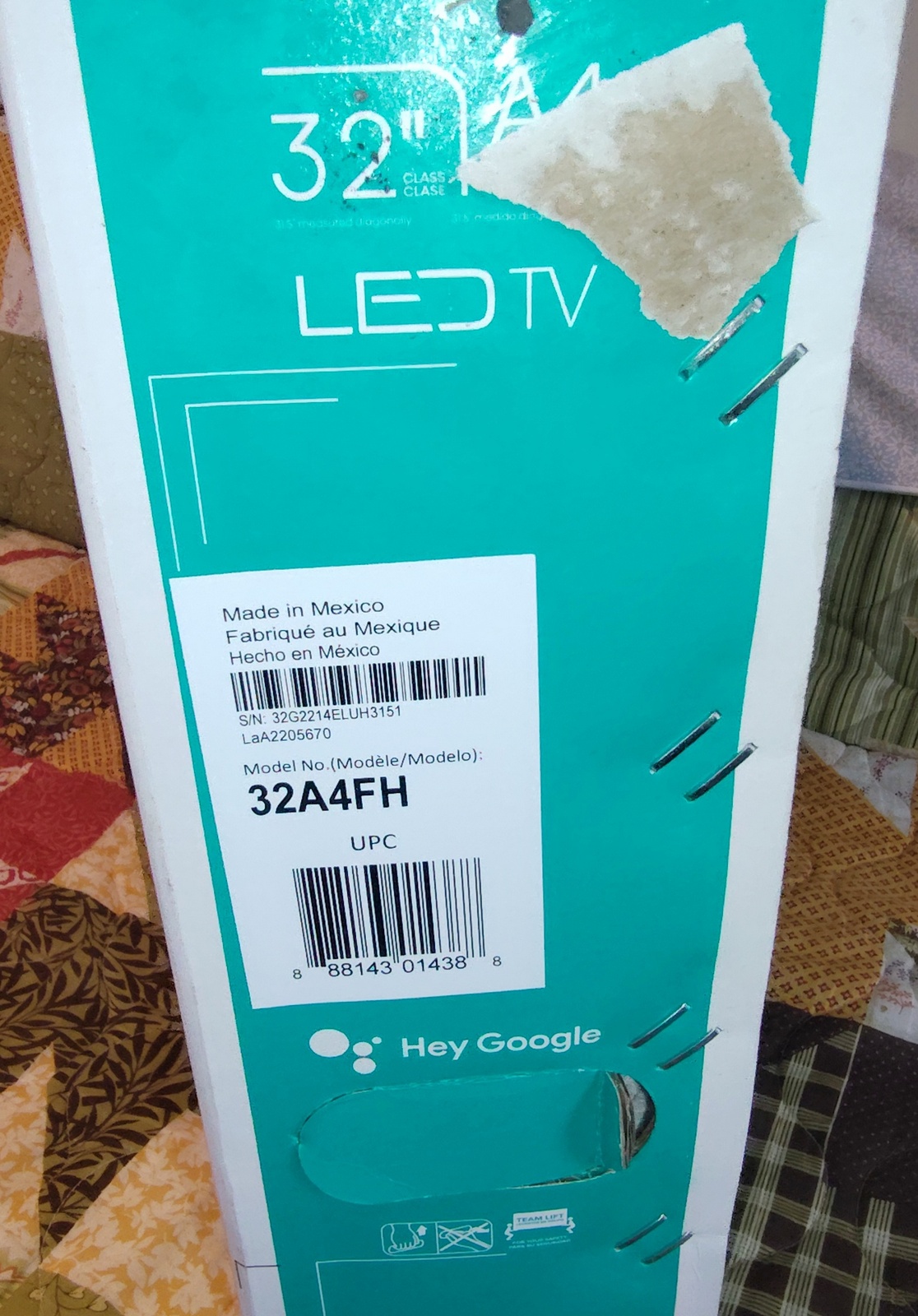 The label on the box says that the TV was manufactured in Mexico, but the box has ‘Guandong Artech Printing Co., Ltd’ and ‘Jiangmen & China’ printed on the bottom. After being passed through the gentle caresses of the United Parcel Service, it’s first job was fulfilled – safely transporting the TV from Mexico to the United States. Now, it’s looking for further employment transporting your 32A4FH TV somewhere!