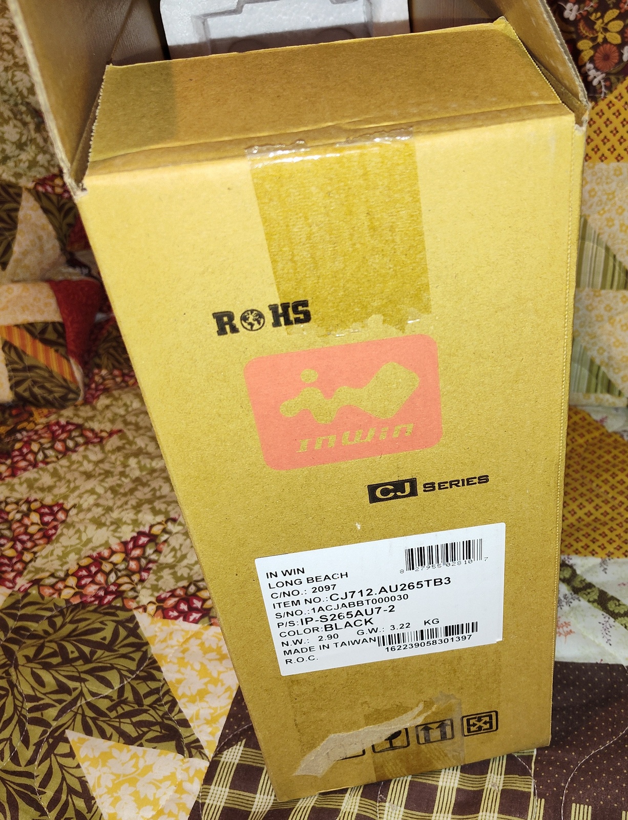 The box was born in Taiwan at the Ming Fang Paper & Carton Co. Ltd. factory – from there, it made it’s way to the In Win factory where it was enlisted to protect a new CJ712.AU265TB3 case on its way to the United States where it apparently arrived at Long Beach, CA. After being passed through the gentle caresses of the United Parcel Service, it’s first job was fulfilled – safely transporting the case from China to the United States. Now, it’s looking for further employment transporting your CJ712.AU265TB3 case somewhere!