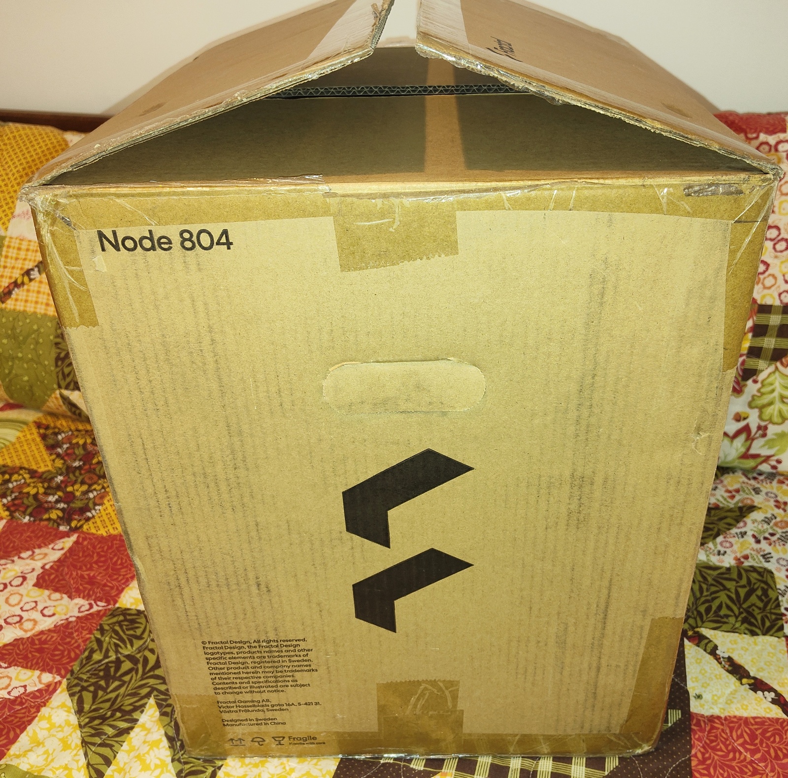 The box was born at the Jing Sheng Paper Products FTY box factory in Guangdong, China – from there, it made it’s way to the Fractal Design factory where it was enlisted to protect a new Fractal Design Node 804 case on its way to the United States. After being passed through the gentle caresses of the United Parcel Service, it’s first job was fulfilled – safely transporting the case from China to the United States. Now, it’s looking for further employment transporting your Node 804 case somewhere!