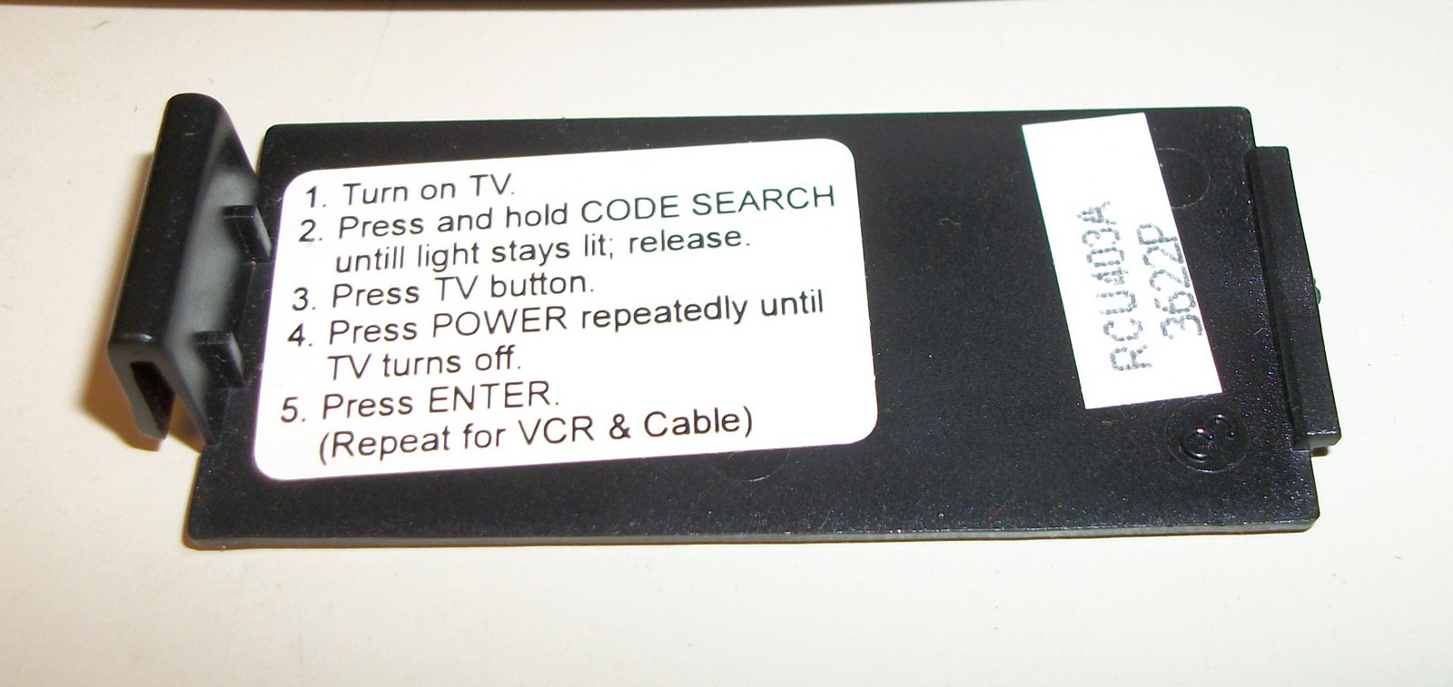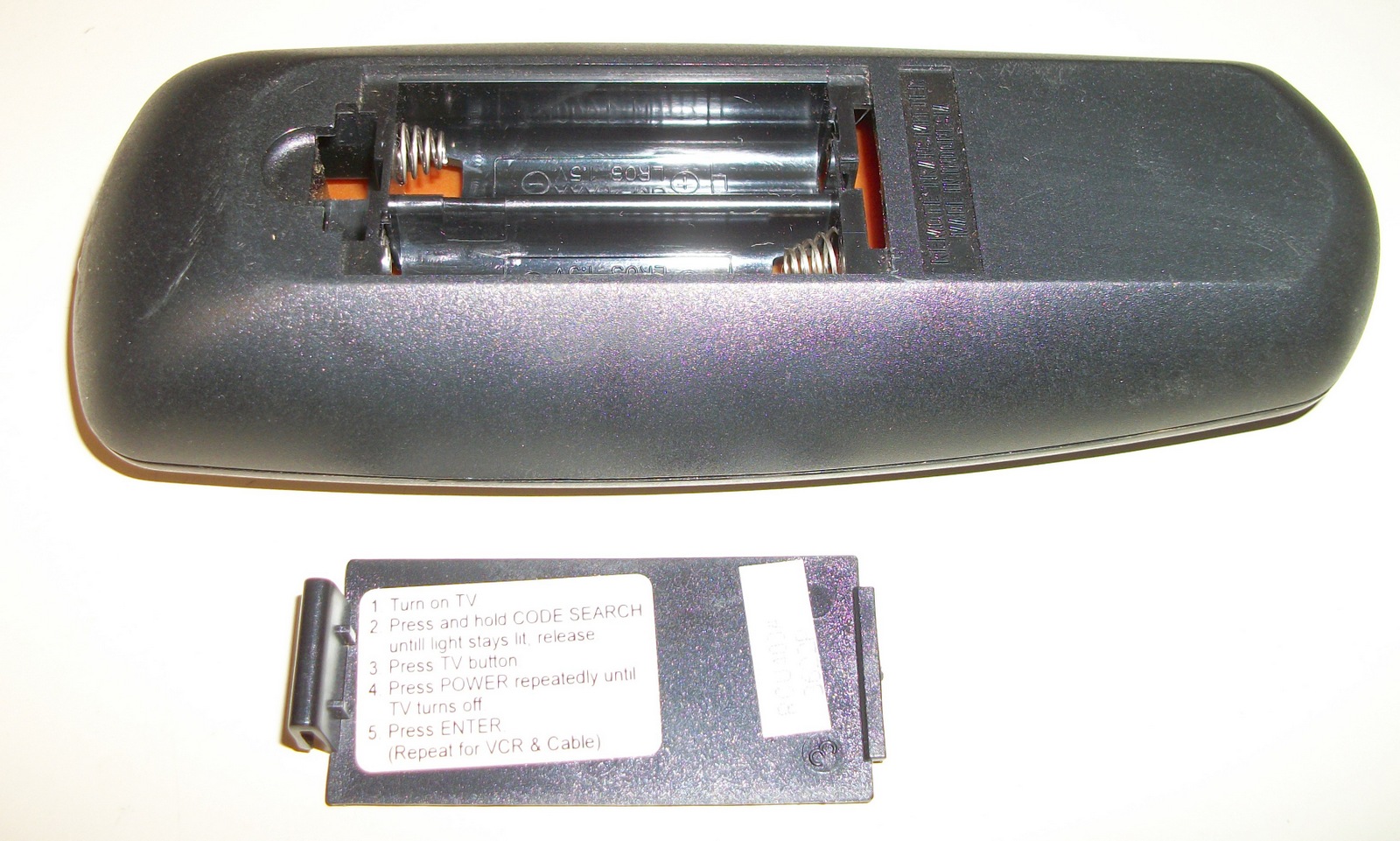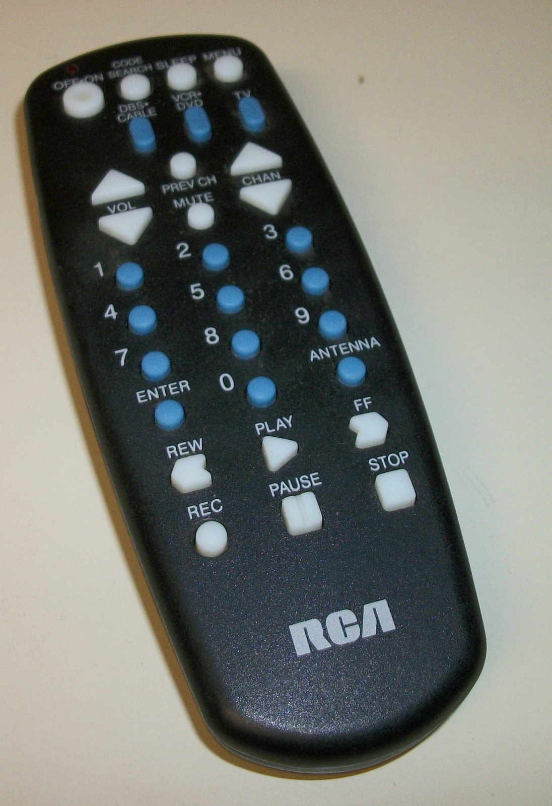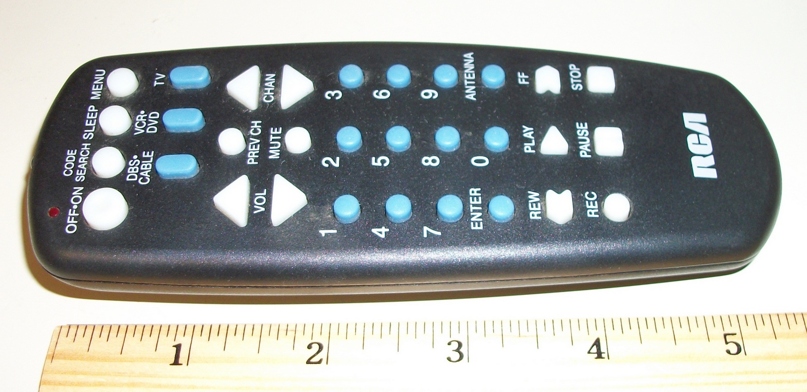 Up for sale is an RCA universal Remote Control in good used condition. RCU403A 3622P – Made in Indonesia. It requires 2 AAA batteries. (not included) It is about 5.5″ long by about 2 1/8 inches wide (at the widest point).