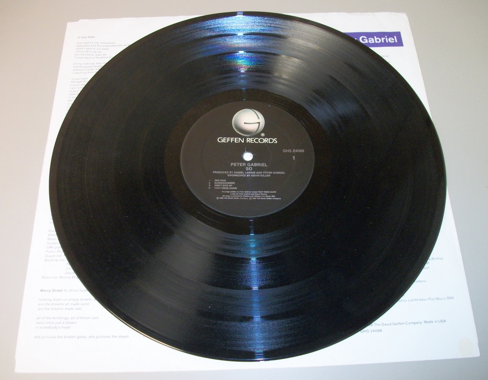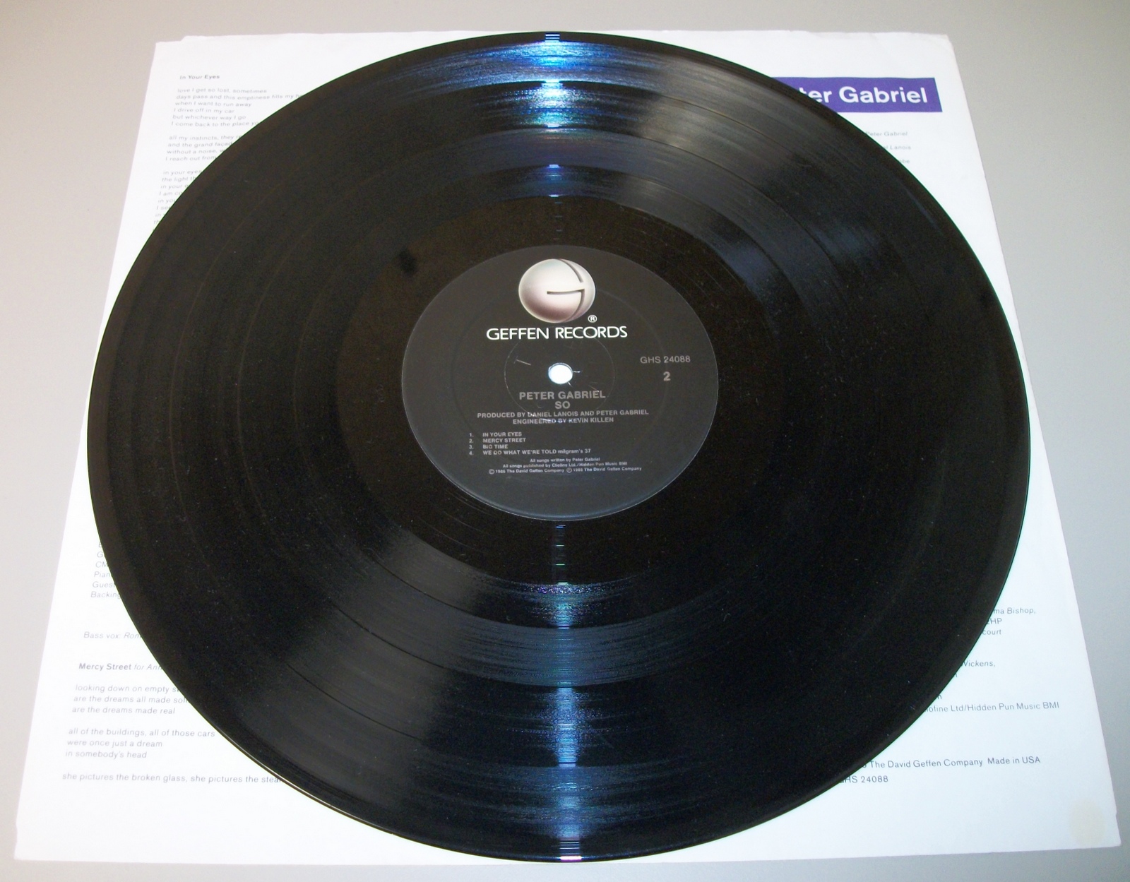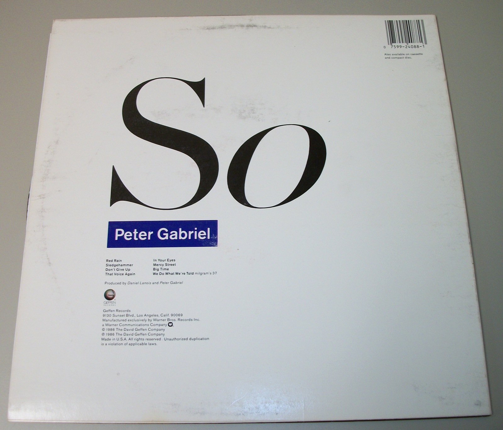 Up for sale is Peter Gabriel’s album So on vinyl record from 1986. Used condition with some wear, record is breaking through the side of the insert – LOOK AT THE PICTURES! Not bad for a decades old record!