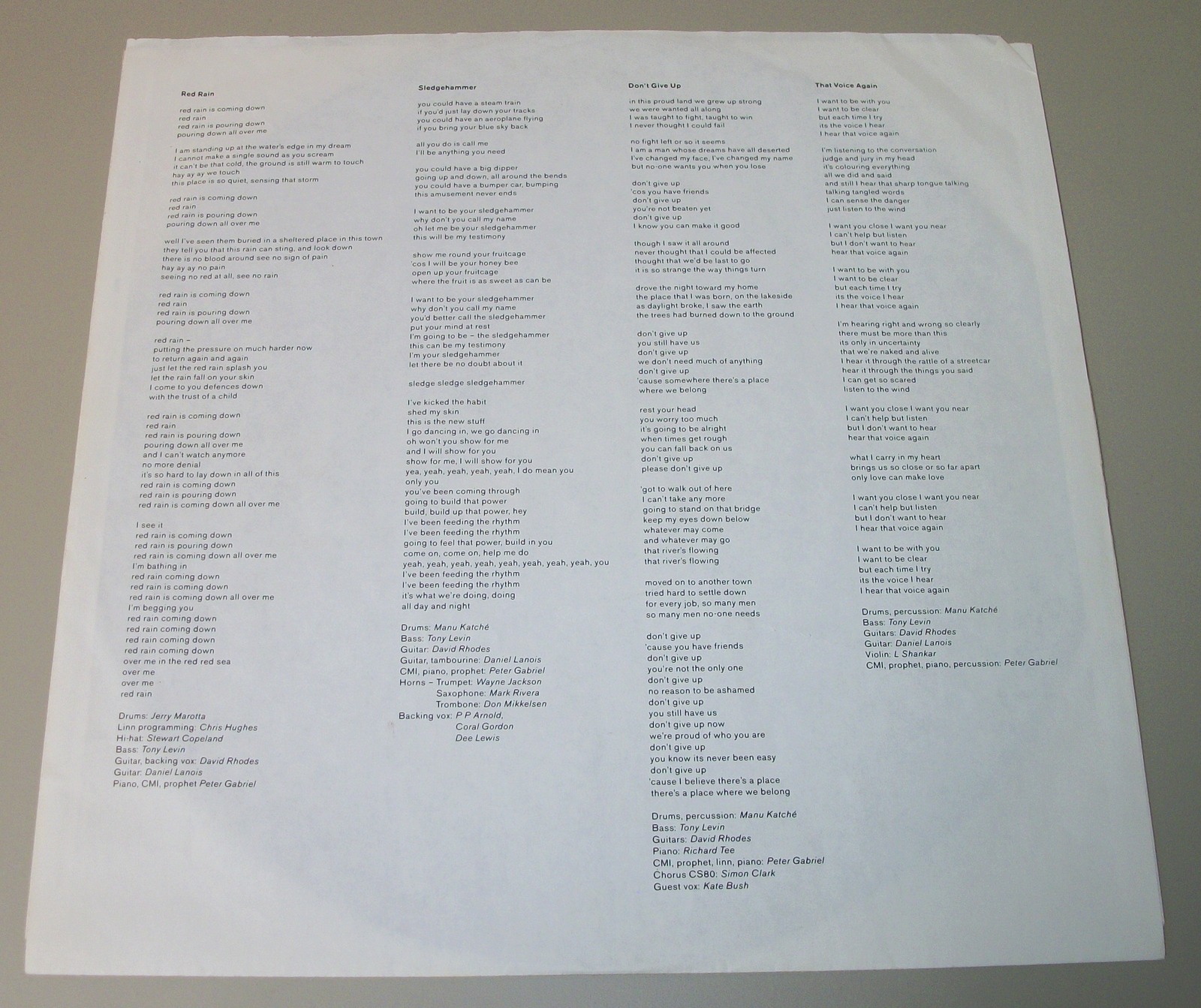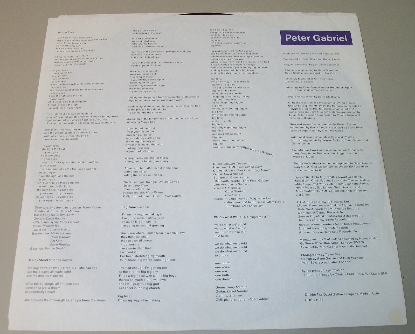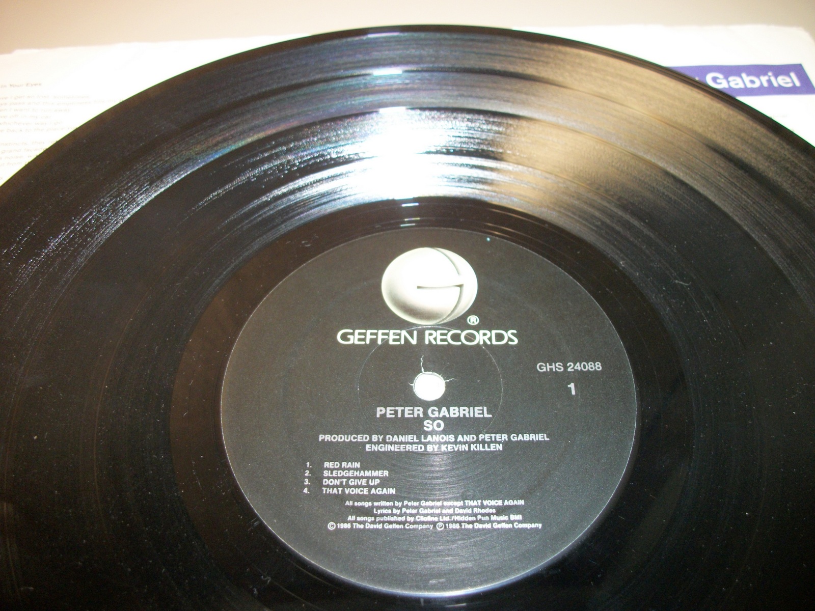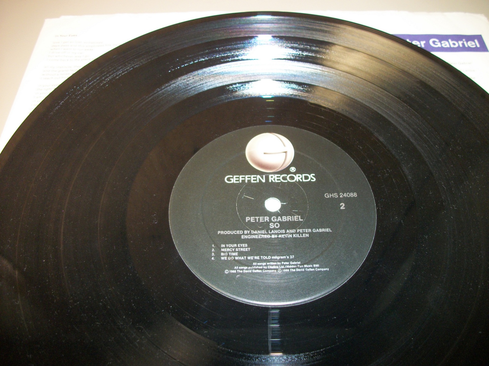 Up for sale is Peter Gabriel’s album So on vinyl record from 1986. Used condition with some wear, record is breaking through the side of the insert – LOOK AT THE PICTURES! Not bad for a decades old record!
