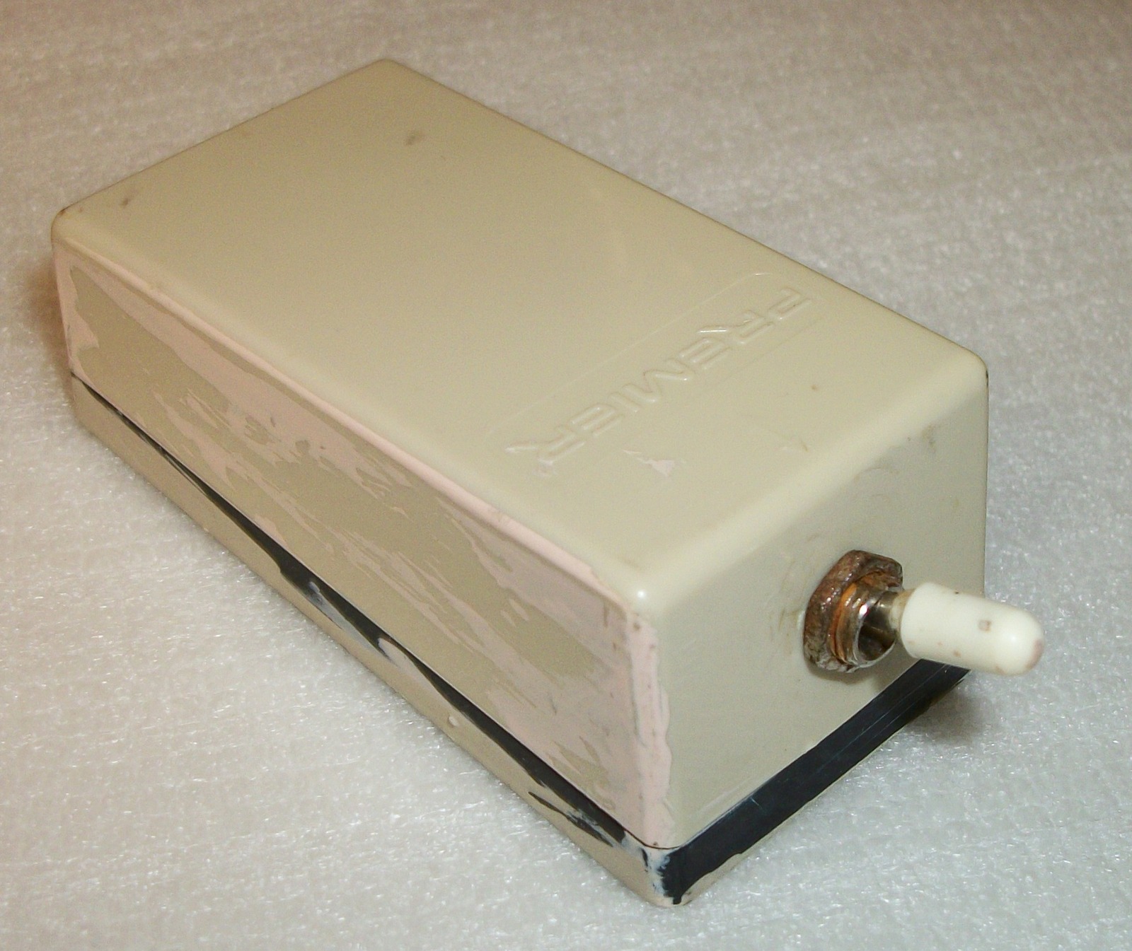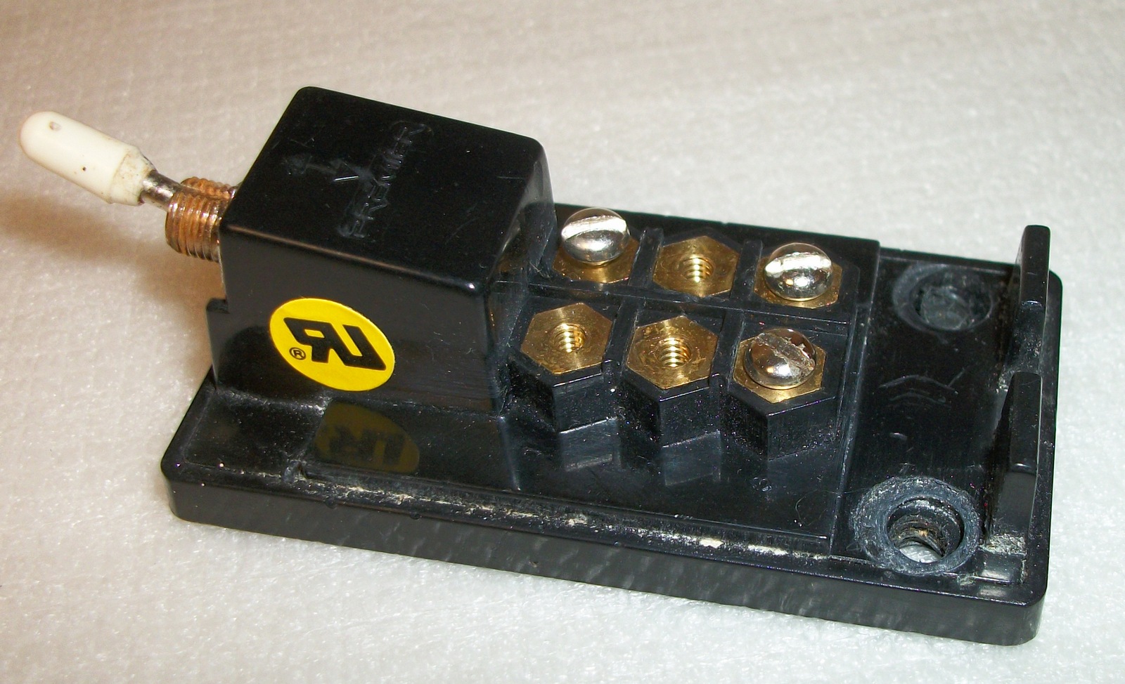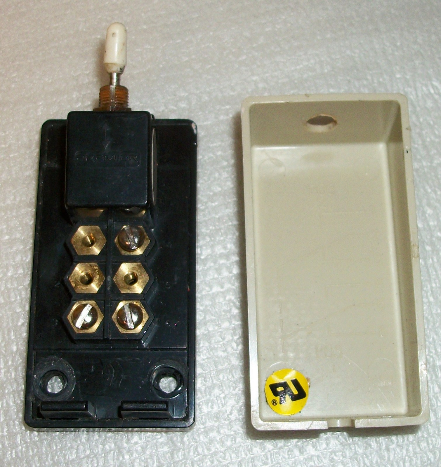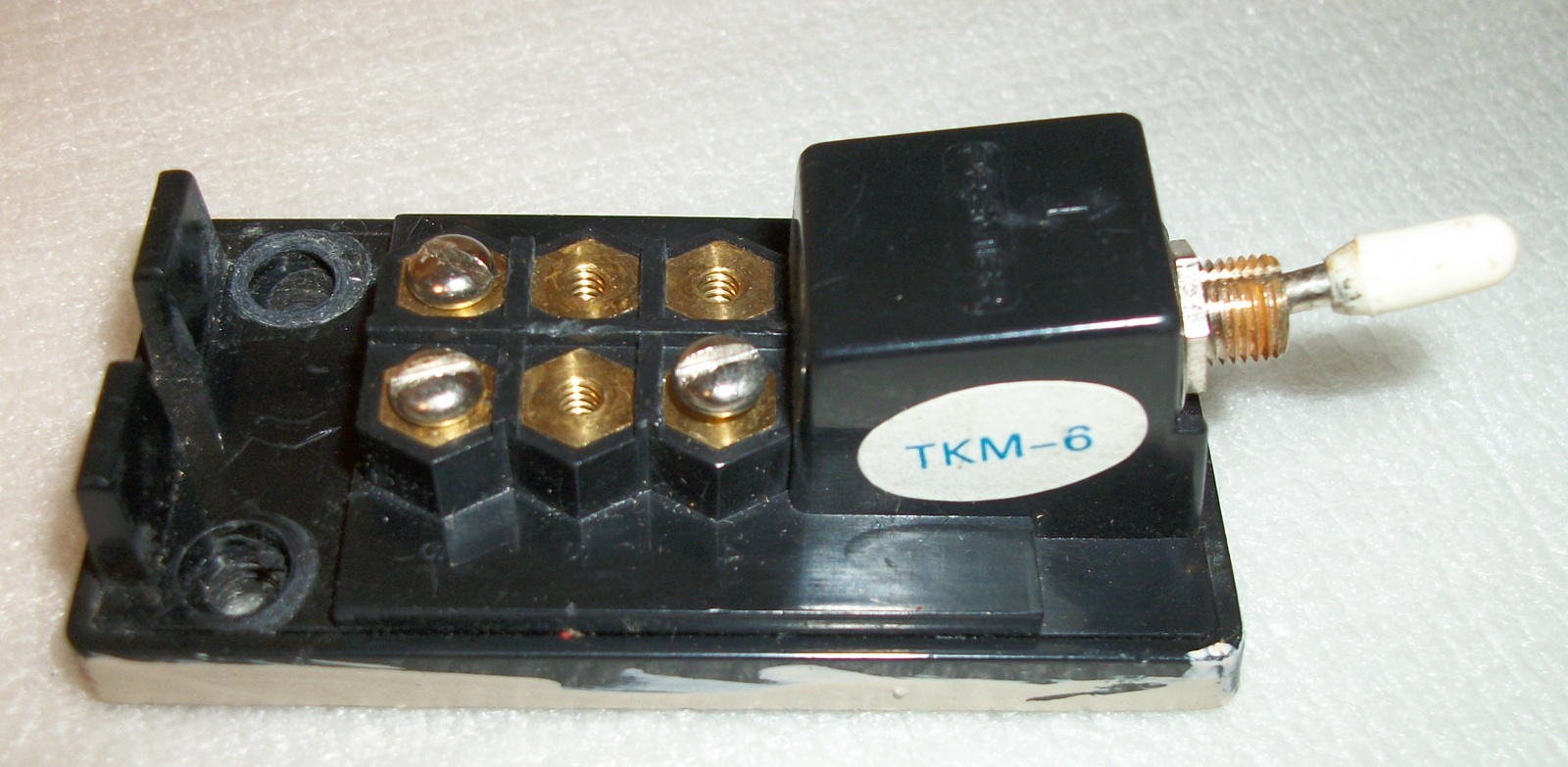 Up for sale is an old TKM-6 transfer switch manufactured by Premier. It is missing three of the terminal screws, has some paint on the sides, and the retaining nut on the switch has a bit of corrosion too. Examine the pictures!