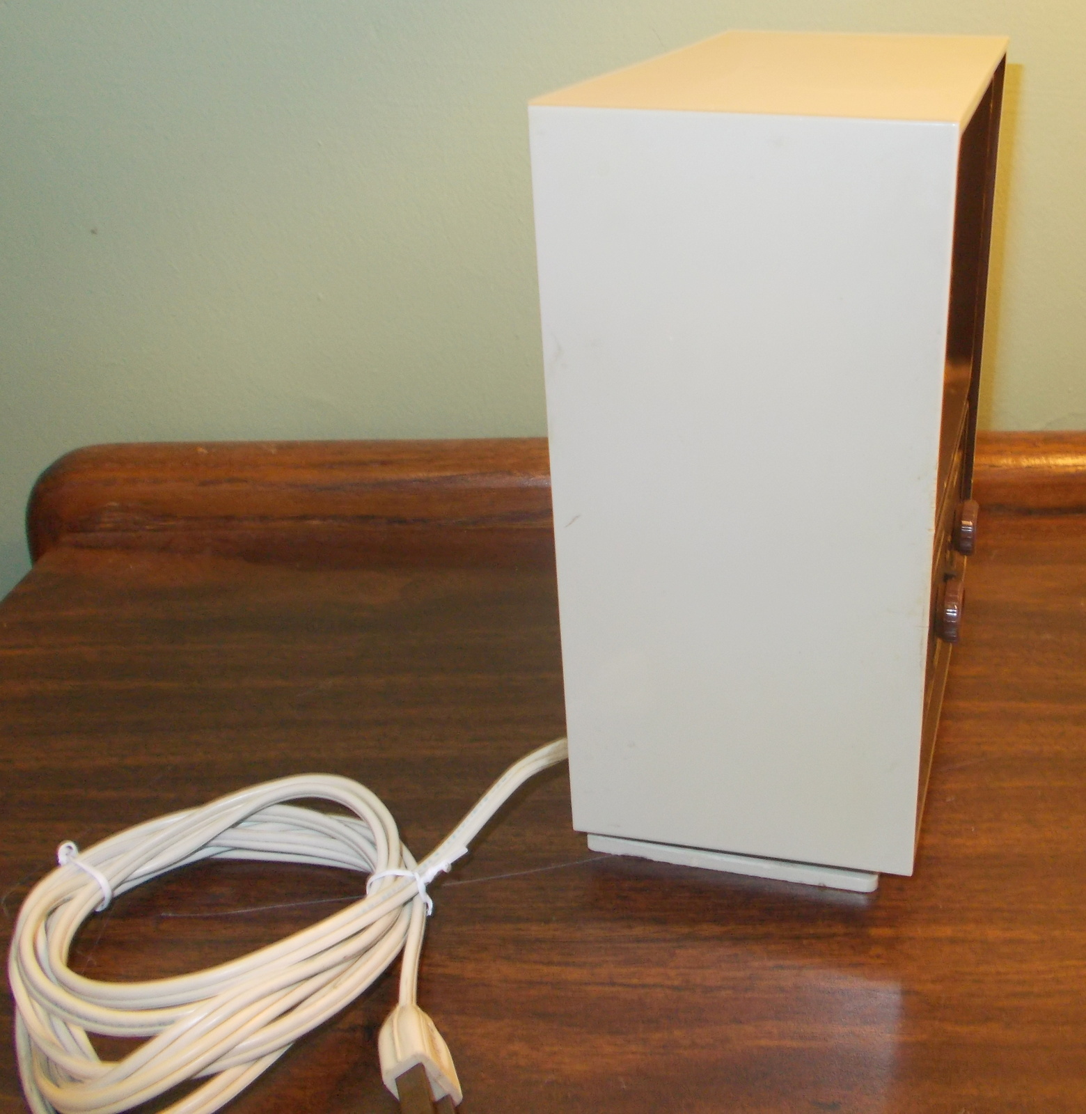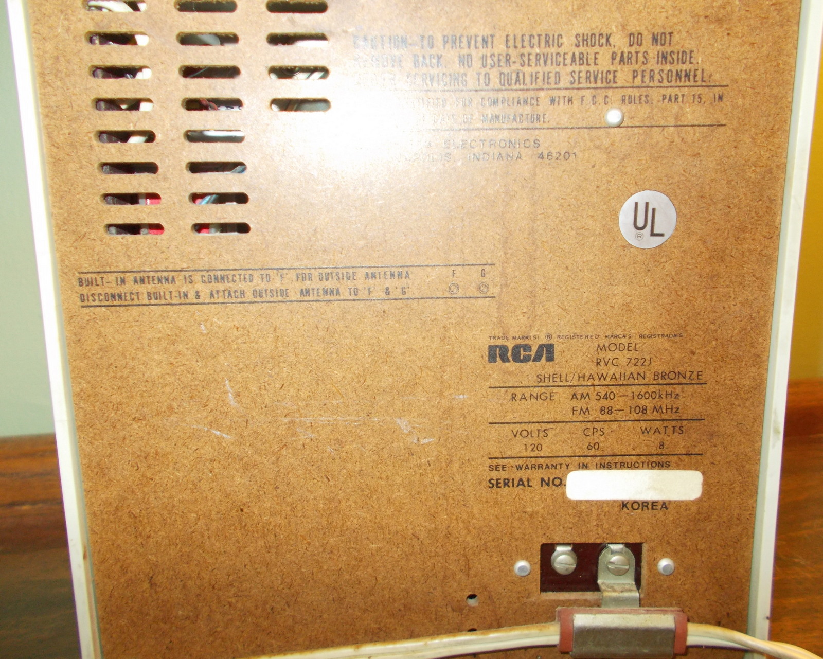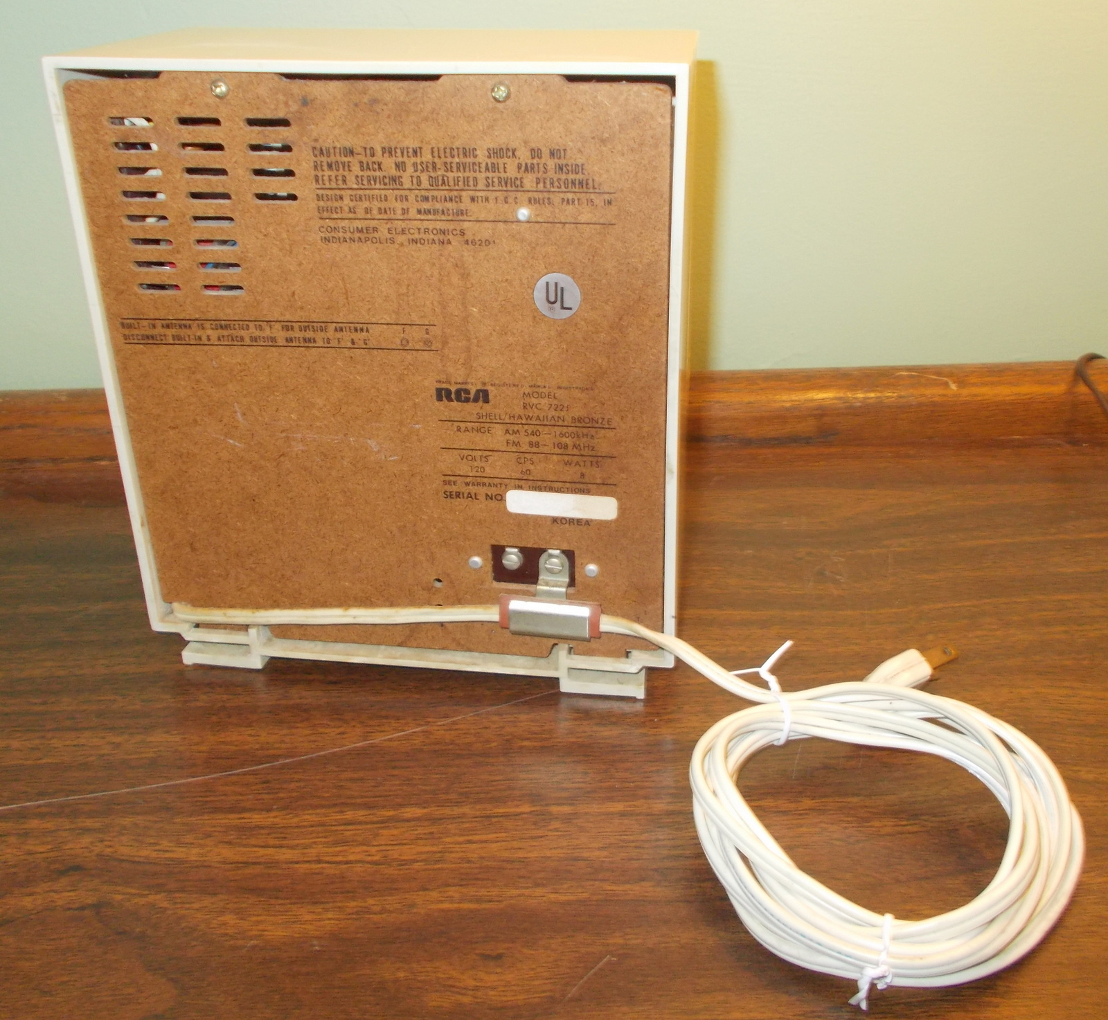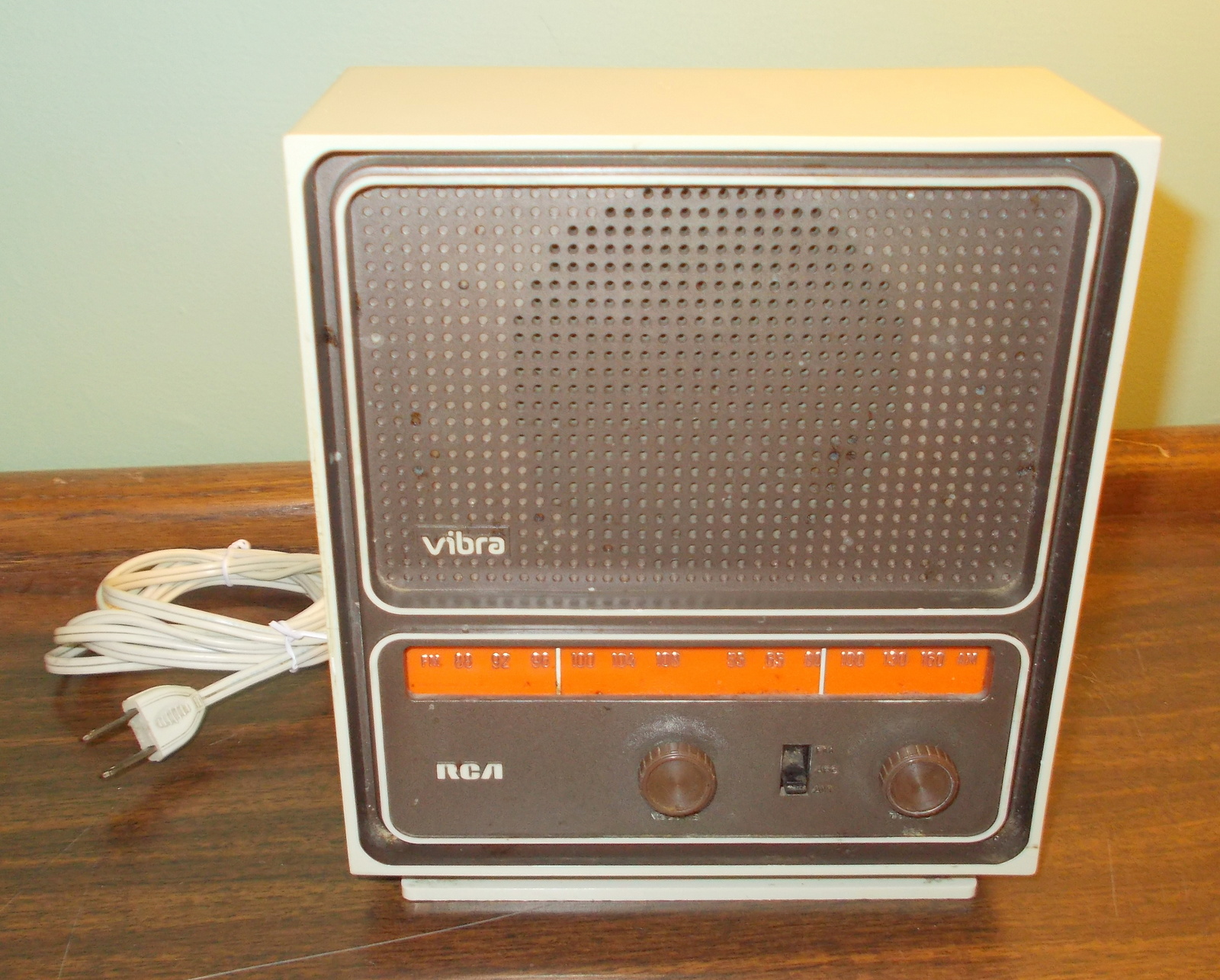 Up for sale is a used RCA Vibra Model RVC 722J Vintage AM/FM Radio. This old radio works but, but has a bit of static when adjusting the volume – after the volume is adjusted, it plays just fine. It measures about 7″ wide X 8″ tall X 3.5″ deep.