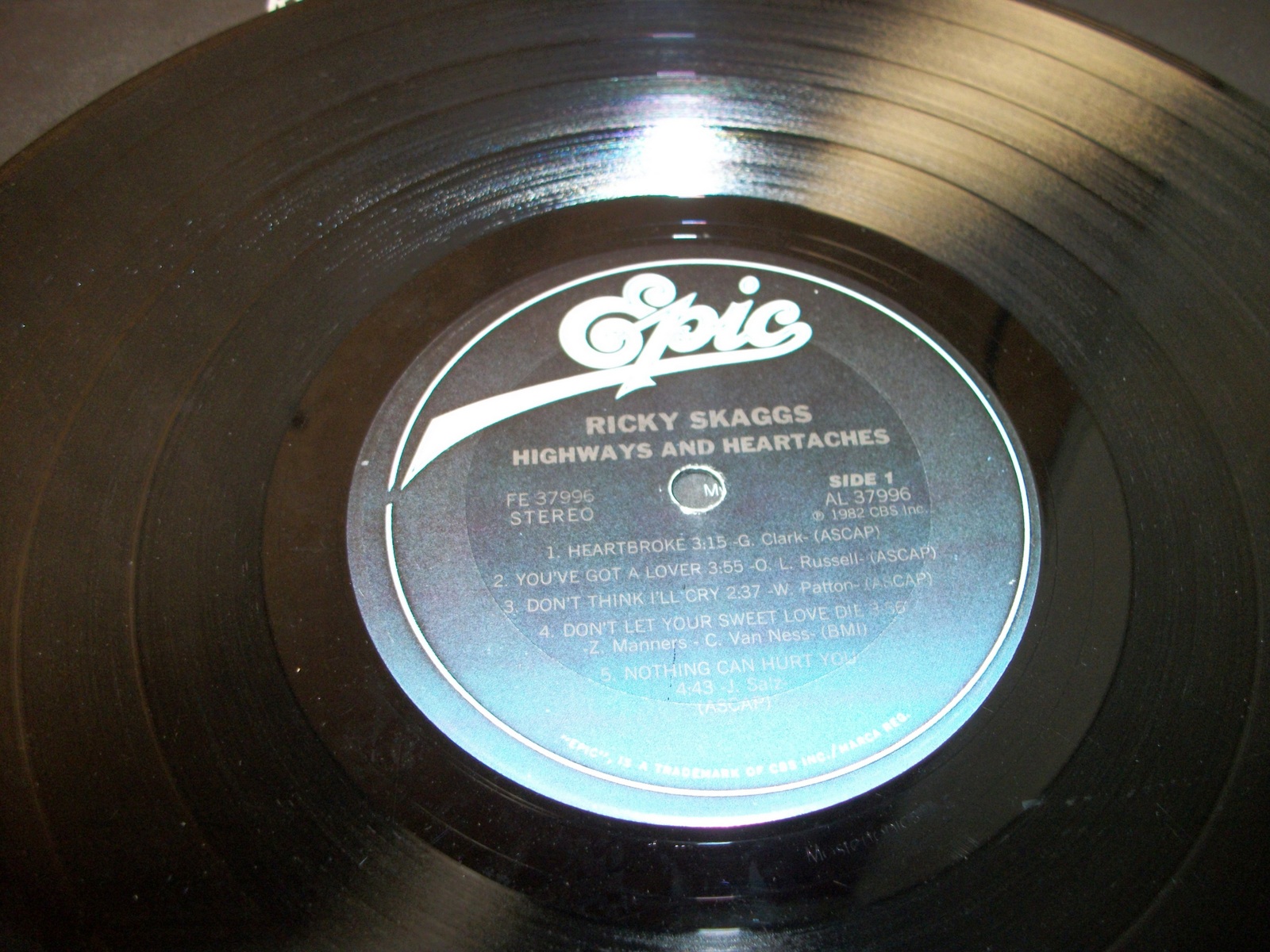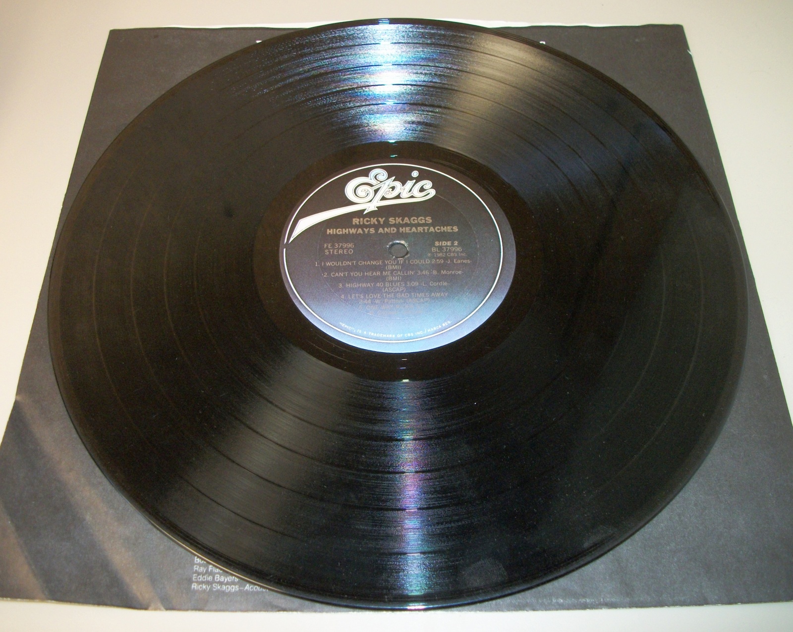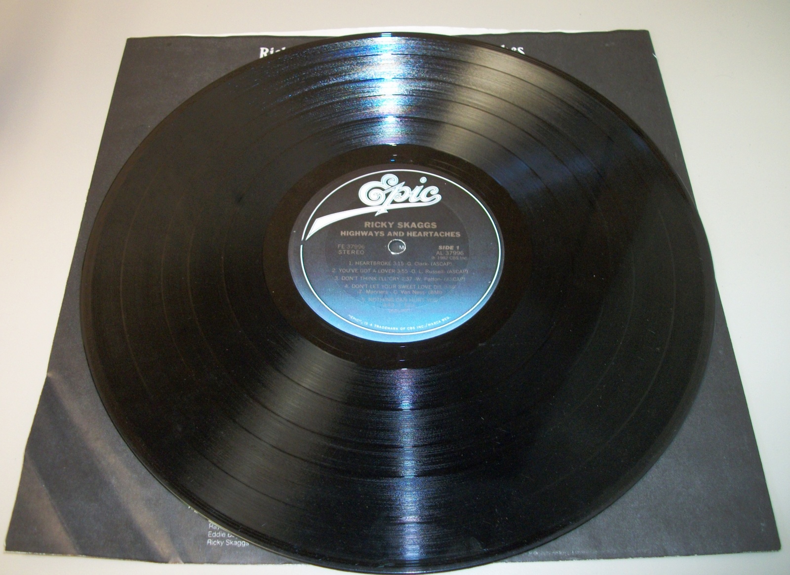 Up for sale is Ricky Skaggs’ album Highways & Heartaches on vinyl. LOOK AT THE PICTURES! Used condition, some wear around the edges and light creases. Joan wrote her name on the front, then Manley crossed out Joan and wrote his name – see PICTURES! The insert is lightly wrinkled and torn from the record breaking through the side, but it is in overall pretty good condition for an almost 40 year old record – see pictures!