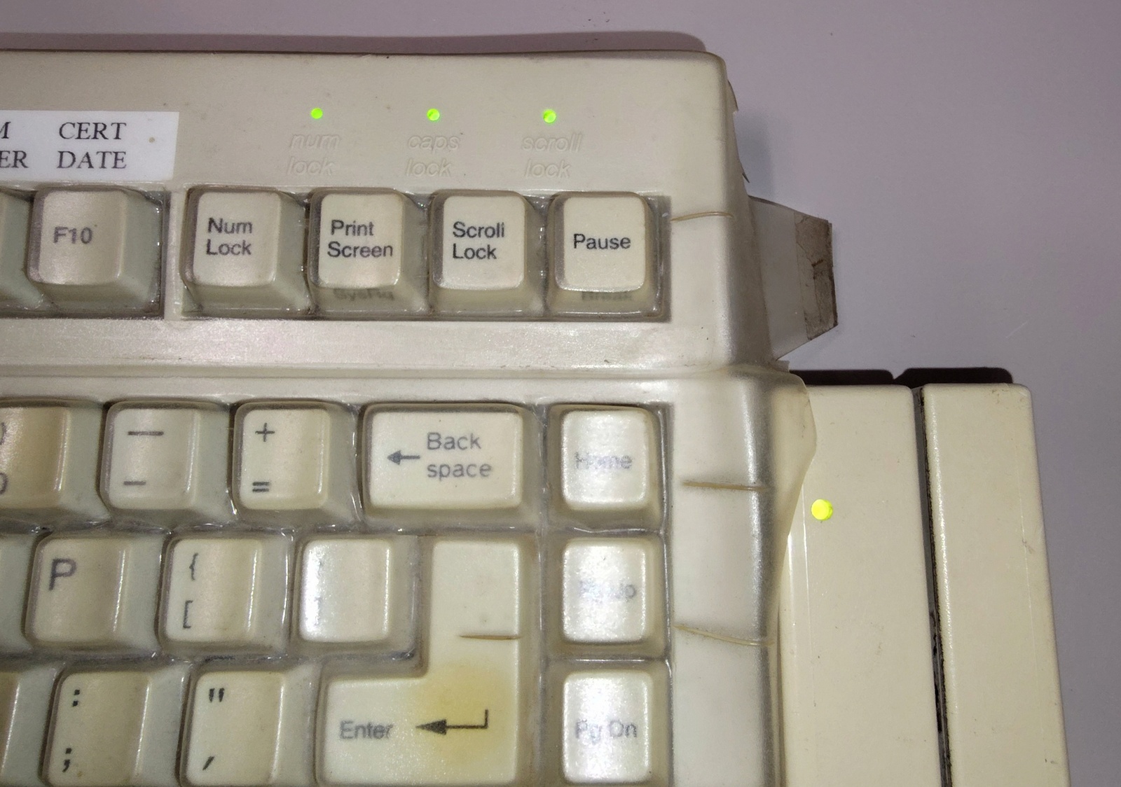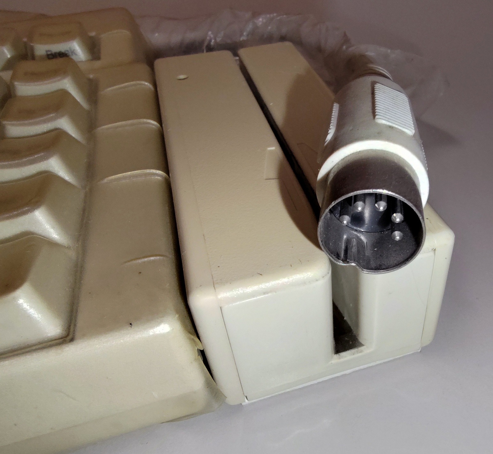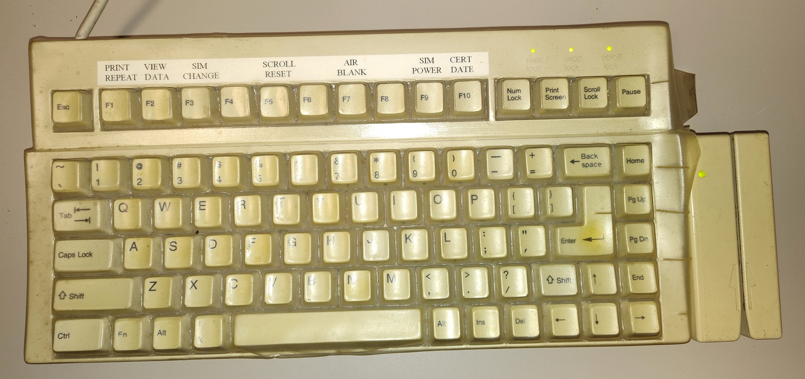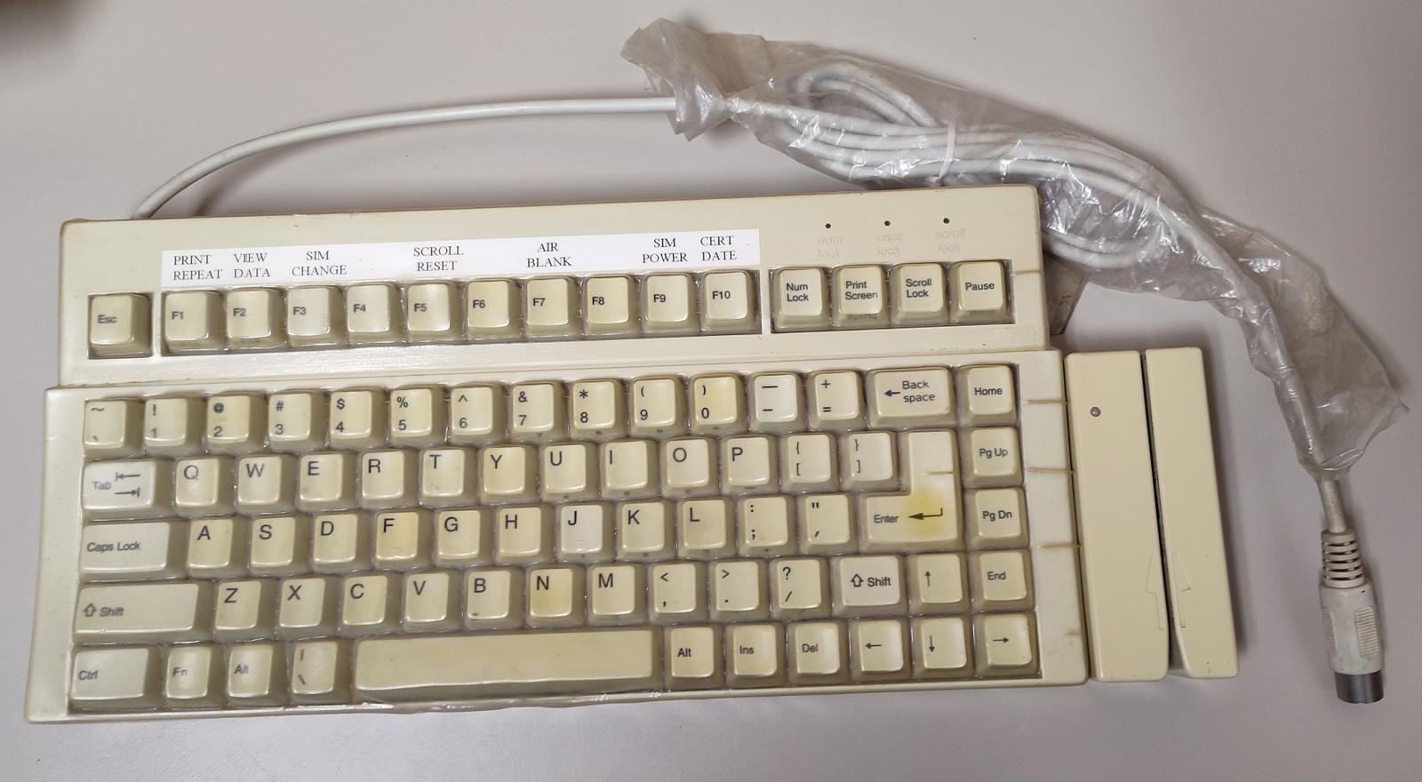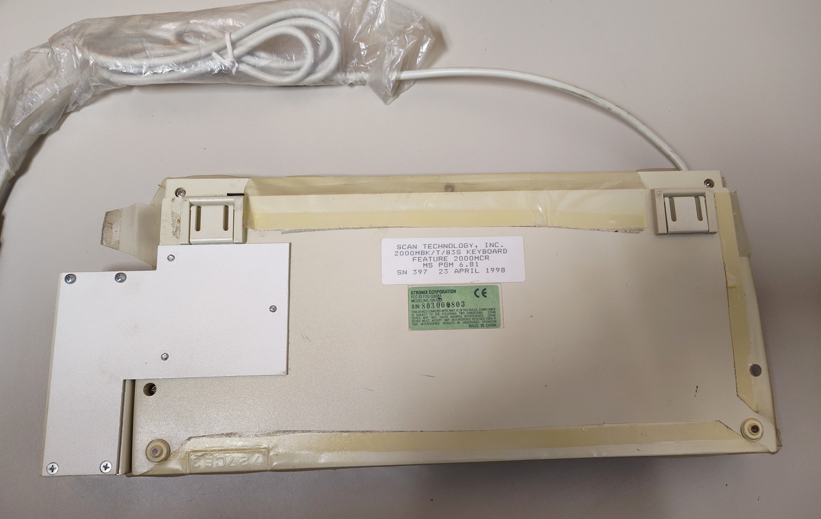 Up for sale is an old AT keyboard in good used condition – we connected it to our old Windows XP machine and it seemed to work just fine. We used an AT to PS2 converter – the converter is NOT included and if you need one, you will need to find your own. This is an old QTronix QX-083 83 key AT keyboard which has been modified by Scan Technology into a 2000MBK/T/83S with a magnetic card reader on the side. This keyboard has a physical block under the numlock key and numlock is stuck on – we suspect that numlock has to be on for the magnetic card reader to work, but we’re not sure on that one. However, when we swiped a credit card into the card reader, it did not work. So, this probably requires a specific type of magnetic card to work. This comes with a type-through protective cover which is worn and a bit dirty (See pictures), but when we looked under one corner of it, the keyboard underneath seems to be in good shape. The protective type-through cover is part number 727C83 – but we are unsure of the manufacturer.