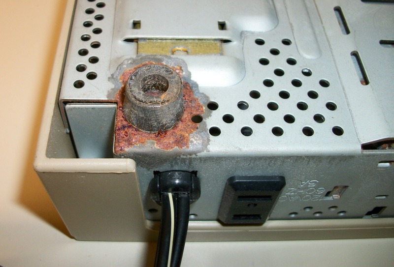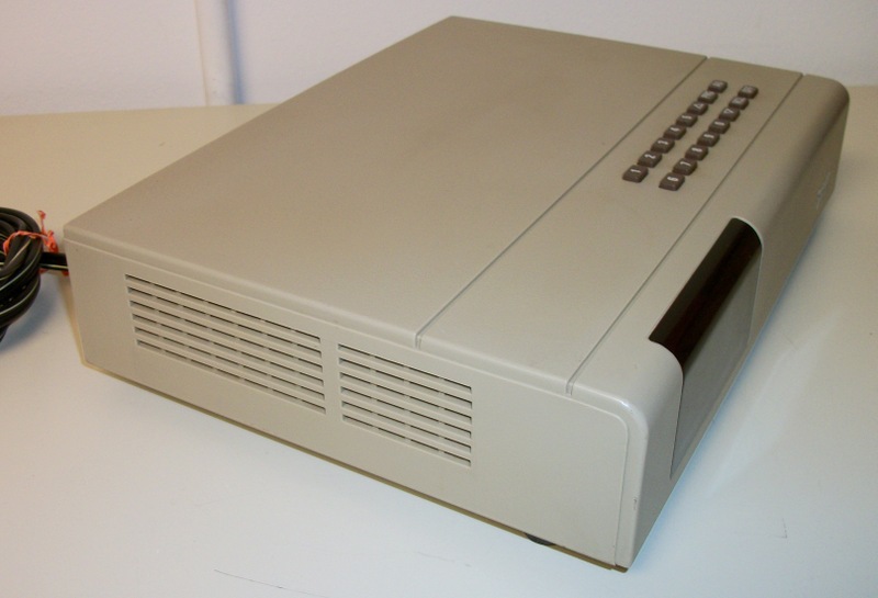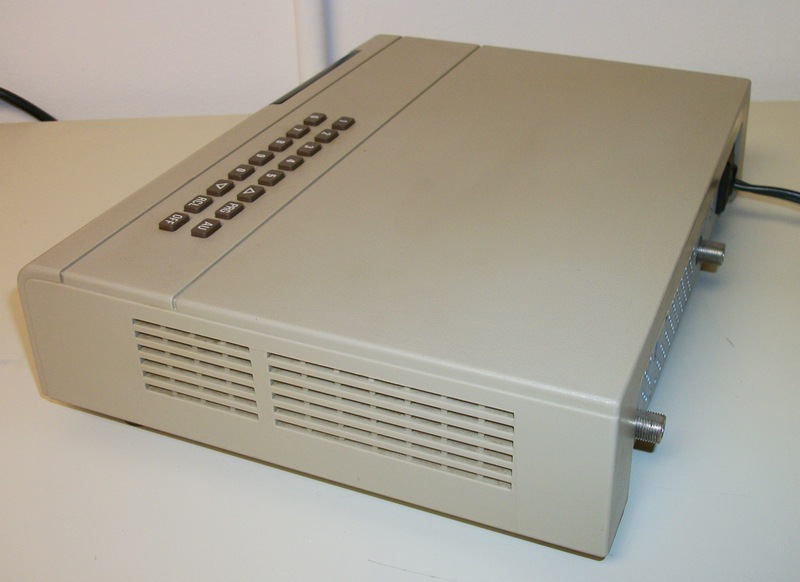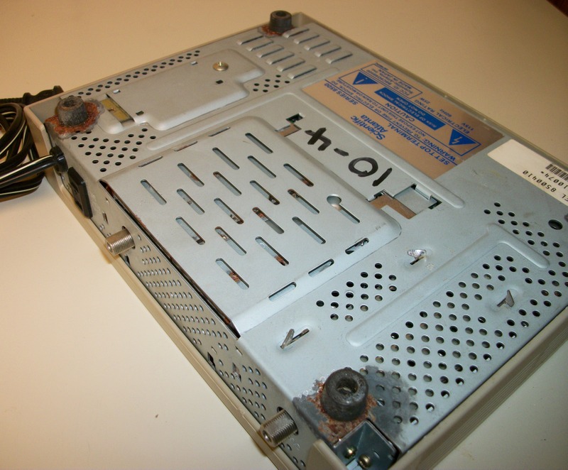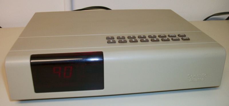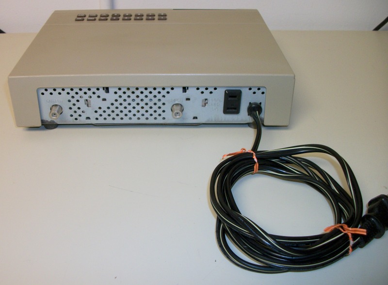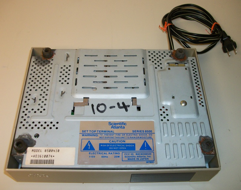 Up for sale is a Scientific Atlanta 8500410 cable box probably from the 1980’s or 1990’s. It is in good physical condition excepting a rattling of something inside of the case and some corrosion around the feet. It powers on ok and the channels change, but the number display dims and gets brighter in a cycle. It has a coaxial input, coaxial output, and a 2-prong 120VAC, 60Hz, 5A power plug on the back.
