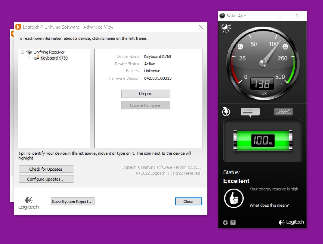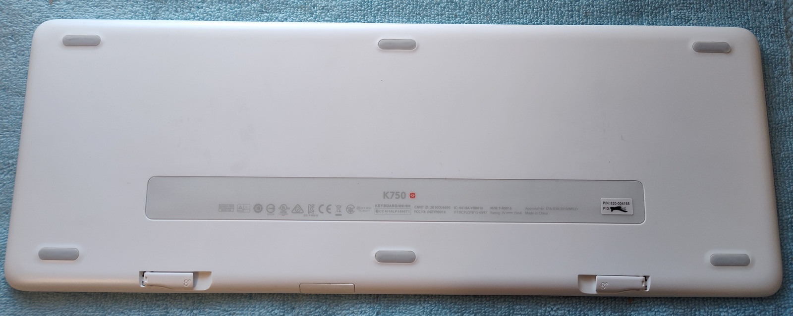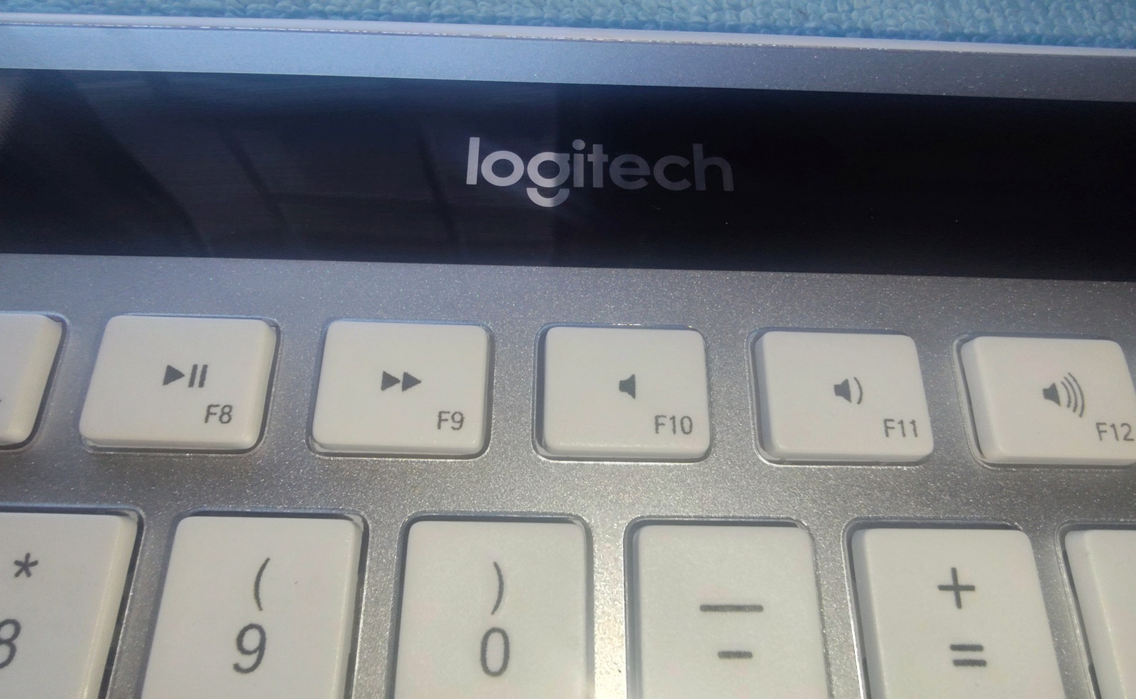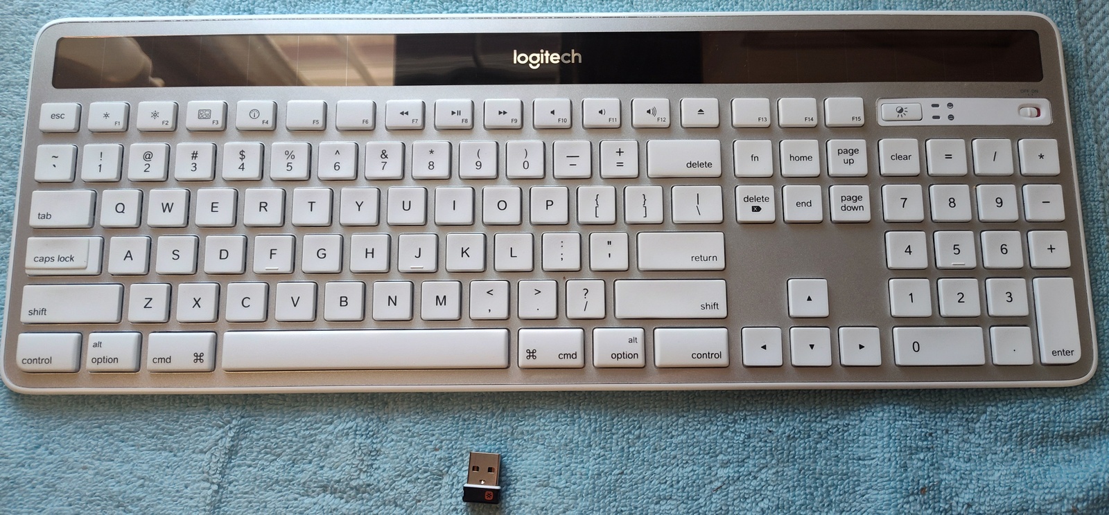 Up for sale is a Logitech K750 for Macintosh wireless USB solar powered keyboard from around 2013. We connected this to our Windows 10 machine and it seemed to work just fine – the cmd key works as a Windows key on Windows 10. We replaced the battery in this one last fall and it is working just fine. We think it would work better with a Mac, but it does function on a PC.
