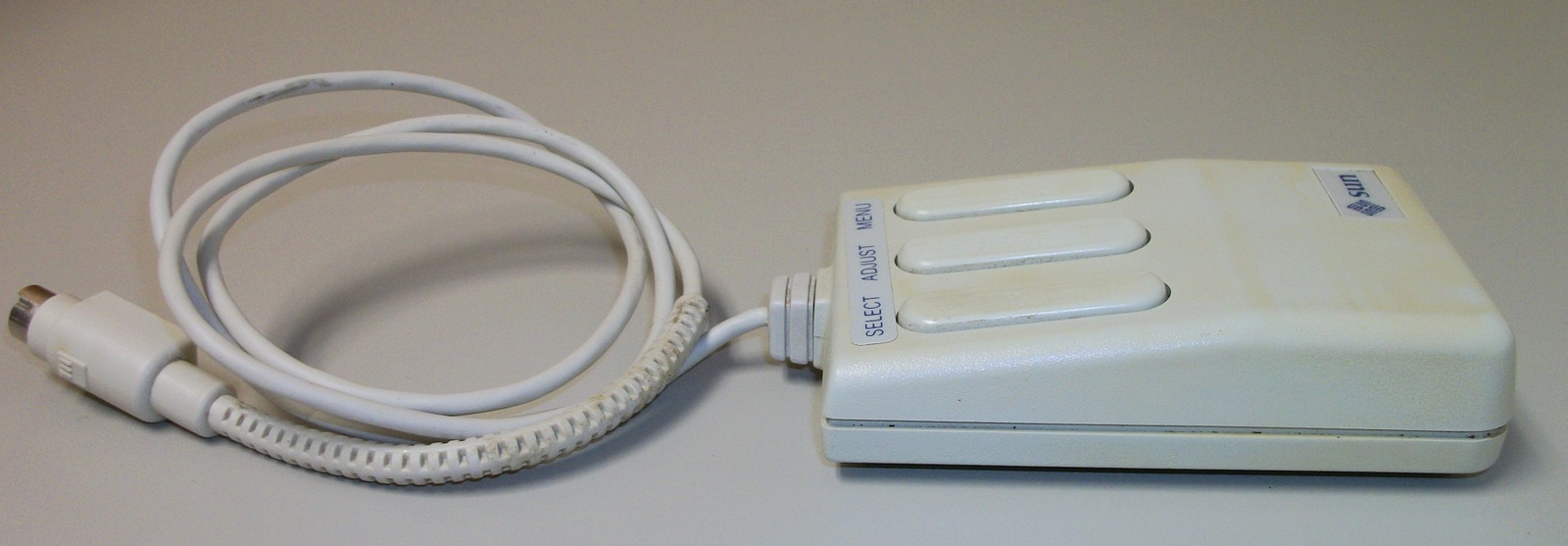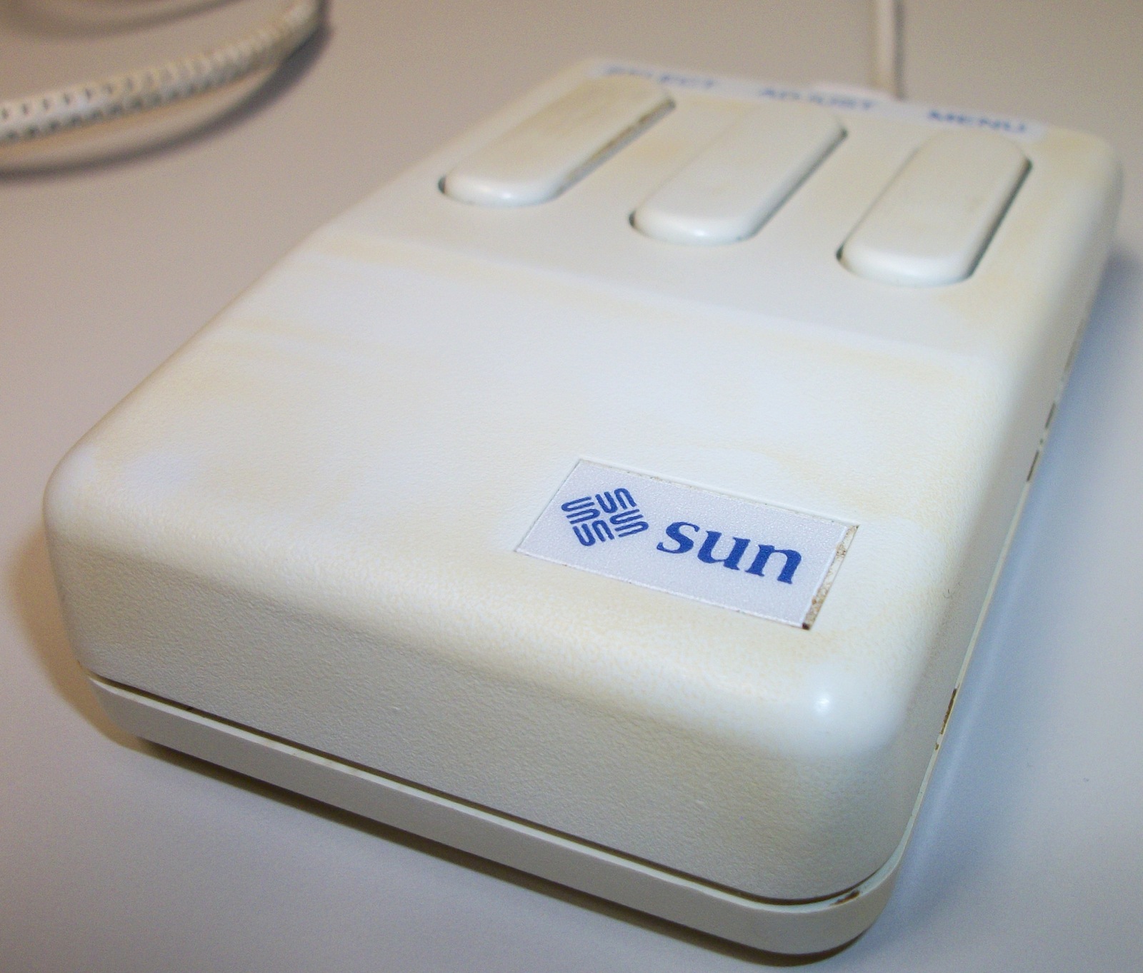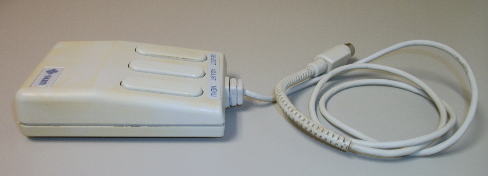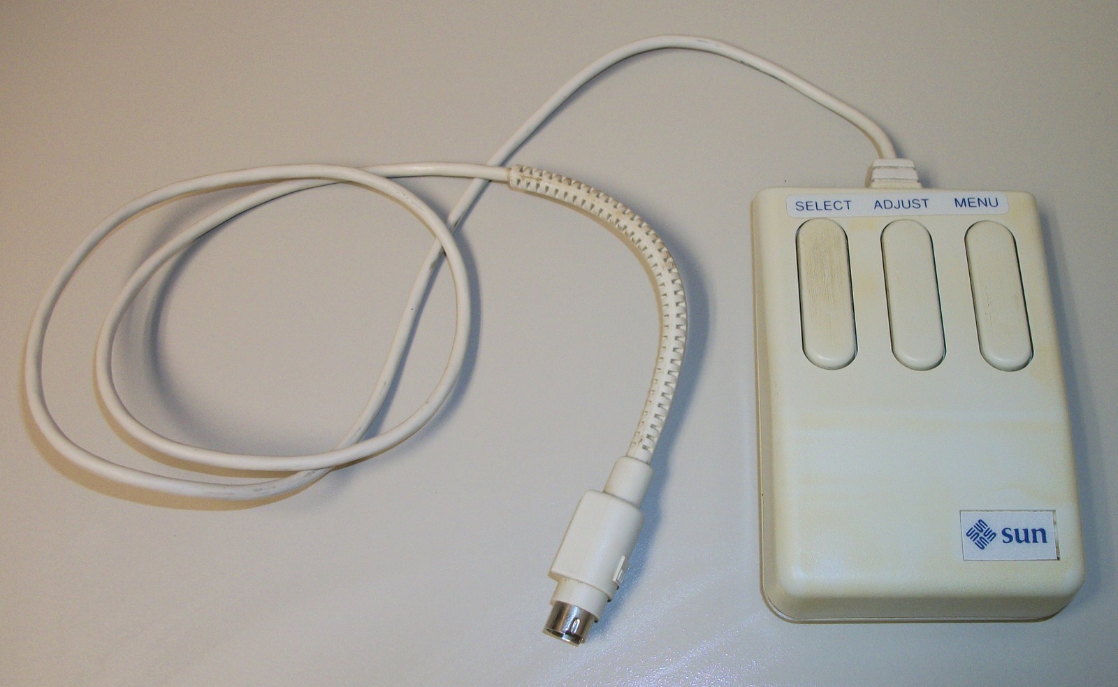 Up for sale is a Sun Microsystems model M4 optical 3-button mouse. This is for use with some older Sun workstations – please research compatibility with your Sun computer BEFORE you purchase this item. As we recall, these mice required a special optical mouse pad which had grid lines on it, but we also remember being able to use it with newsprint. The optical mouse pad is NOT included and you will need to supply your own. We don’t have any way to test this item, so it’s sold as-is, untested.